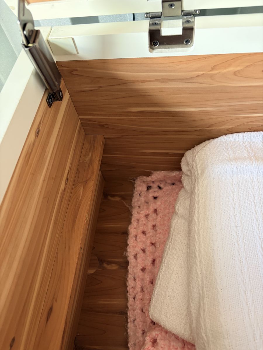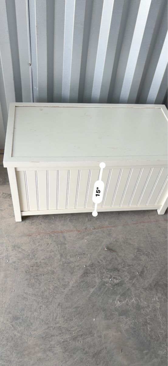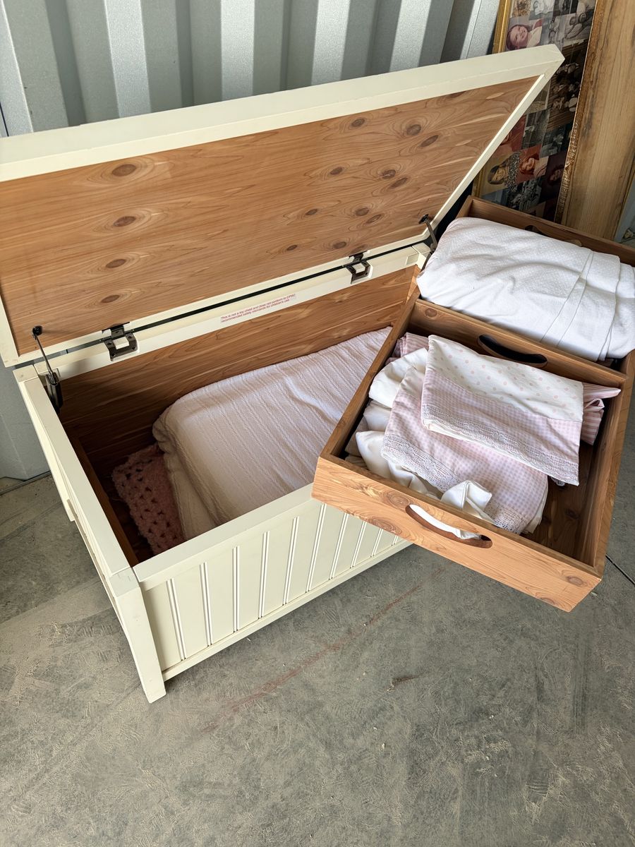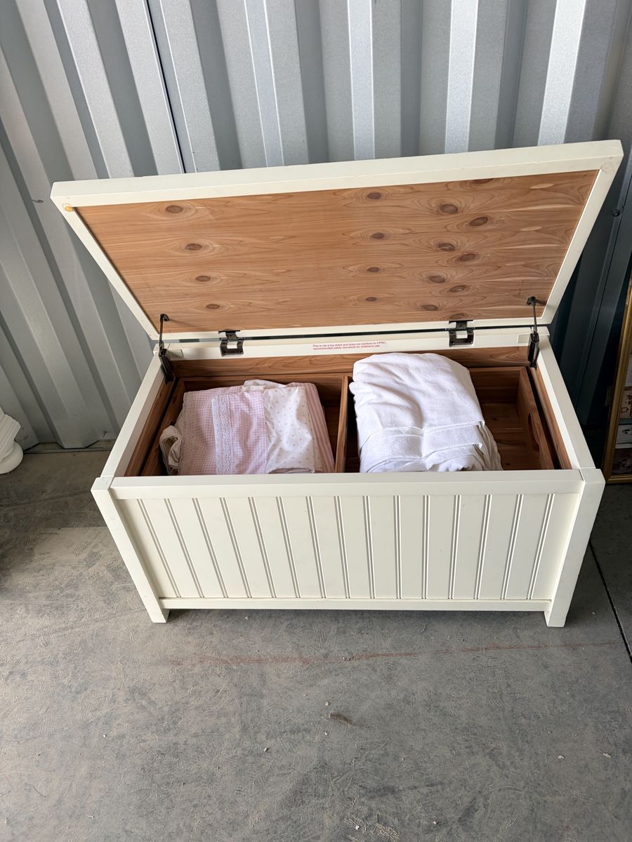 ApplePayA stylish hope chest with a beautifully cedar lined storage and removable shelf. The exterior has scratches (review photos) from heavy dust in the storage unit, but with a good cleaning it’s in great condition overall.