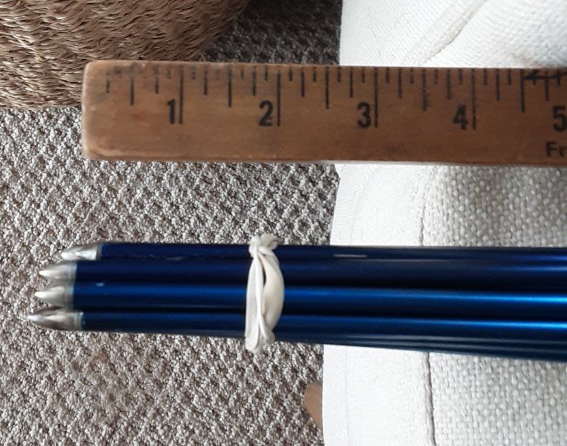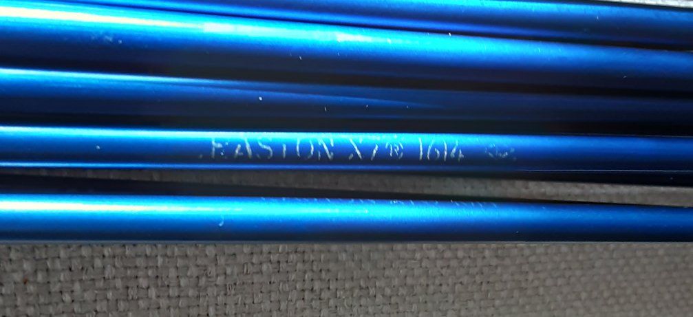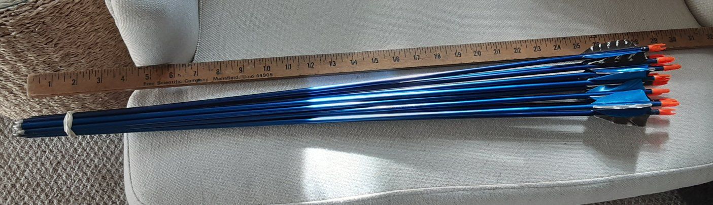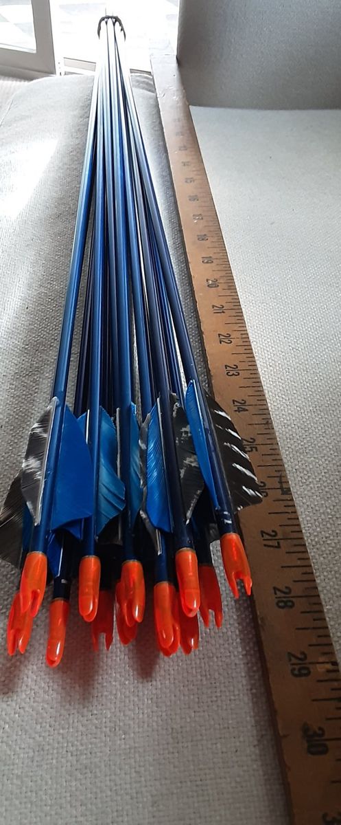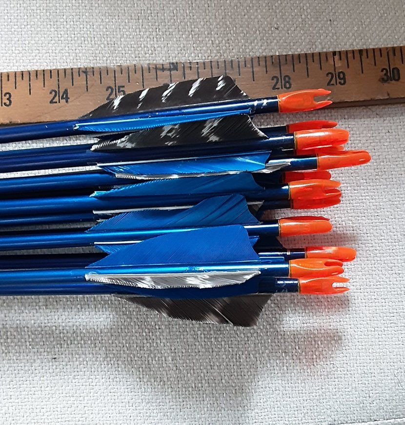 ZelleStraight vintage aluminum arrows by Easton 1614's . approx 29" long For youths or 30# draw bows or less. New 3" feathers.