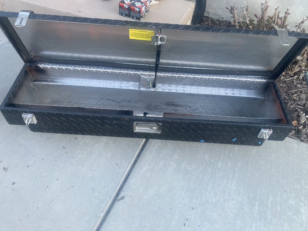 Had on rv tongue, has lock and two hasps, very secure. 48” x 12” x 13”