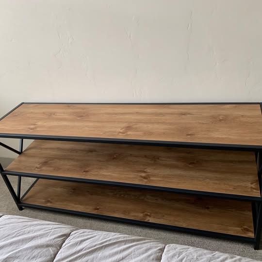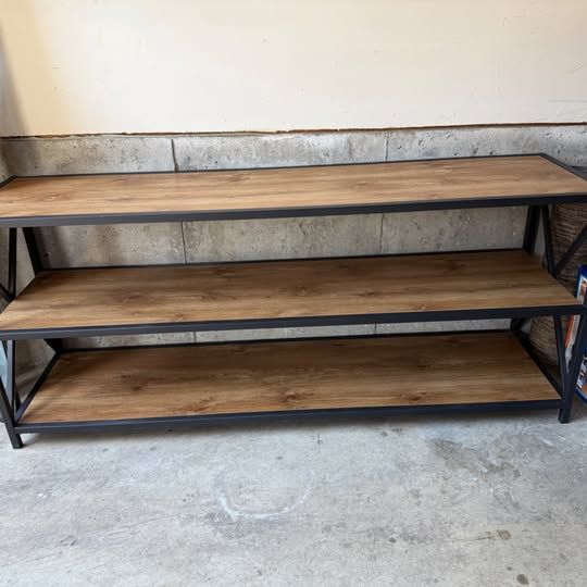 Venmo3-Shelf Industrial TV Stand – Wood Shelves, Metal X-Frame, Rustic Oak Walker Edison industrial-style TV stand in rustic oak with black powder-coated metal X-brace frame. Three open shelves — great for a TV up to 70"+ with room for components, books, or decor below. Clean, sturdy industrial farmhouse look that works in any living room. Good used condition. Buyer responsible for disassembly and pickup. Sandy/South Jordan area.