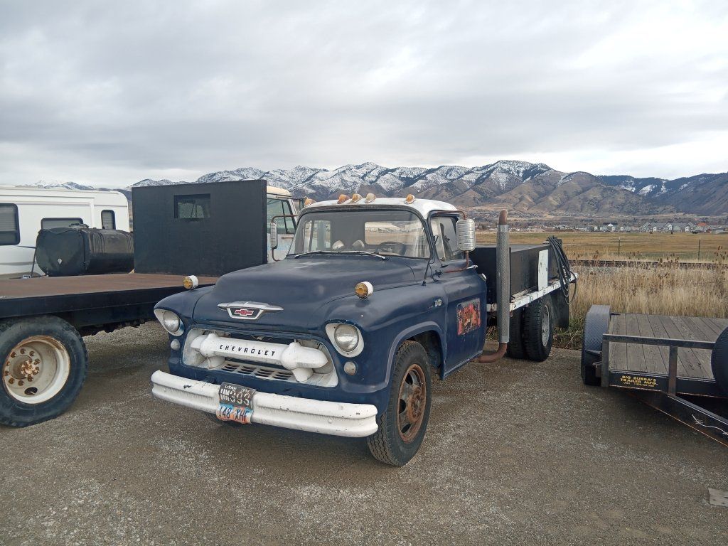 1955 Chevrolet Flatbed, V8 327 cu. in., 4 speed manual, with a mounted 700 gal. oil tank with pump assembly. Truck-$5300 Tank-$7500. $12500 for both