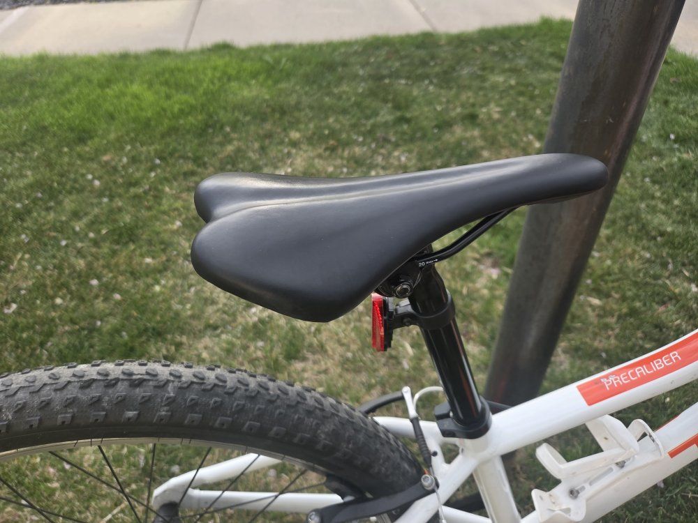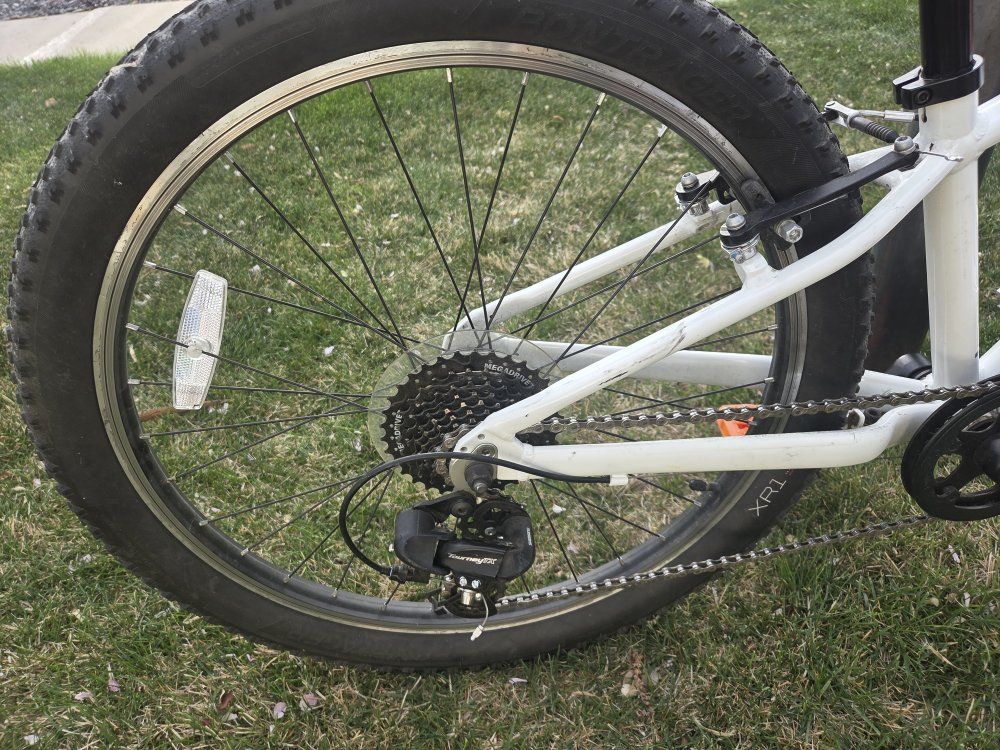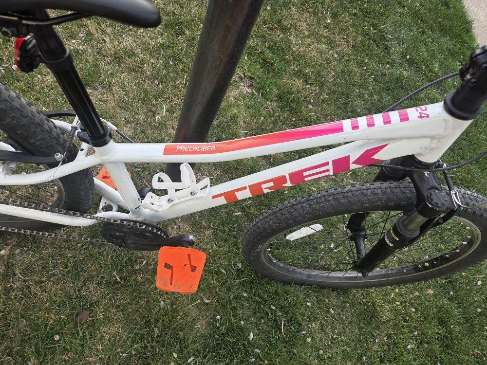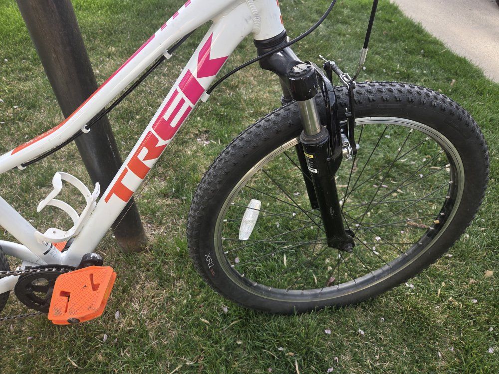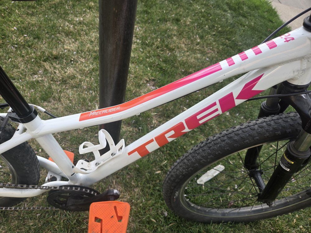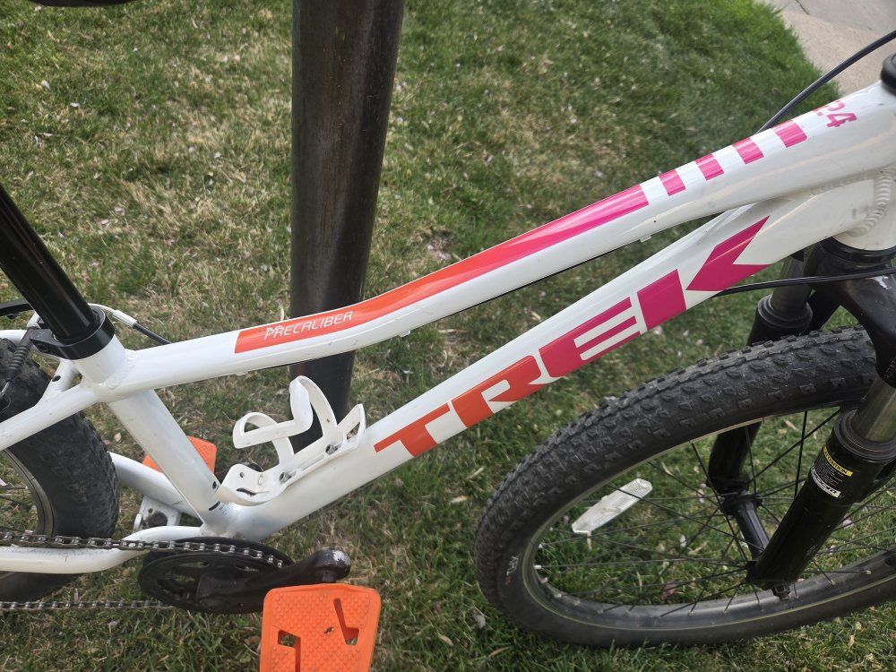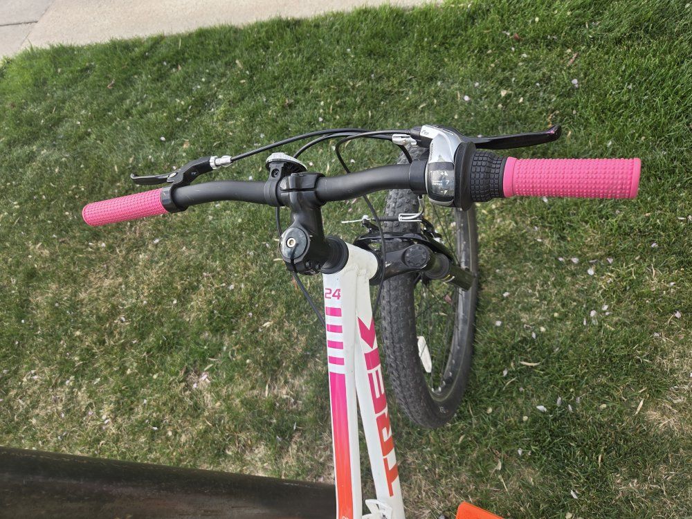 Top Features: Lightweight & Durable: Built with a sturdy Alpha Silver Aluminum frame that’s easy for kids to maneuver. Trail-Ready Suspension: Features a front suspension fork with 45mm of travel to soak up bumps and roots. Simple Shifting: Equipped with a Shimano 8-speed drivetrain and intuitive twist shifting, making it easy for young riders to tackle hills. Safe Stopping: Reliable hand brakes designed specifically for smaller hands to provide confident stopping power. Kid-Friendly Design: Includes a low center of gravity for better stability and a saddle with an integrated handle. Condition & Specs: Condition: Great / excellent used condition—well-maintained and ready to ride. Color: Voodoo Crystal White with pink accents. Weight: Approximately 26.5 lbs. Bonus: Comes with a kickstand and water bottle cage already installed.