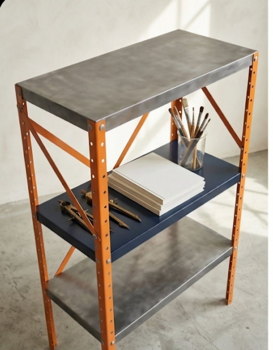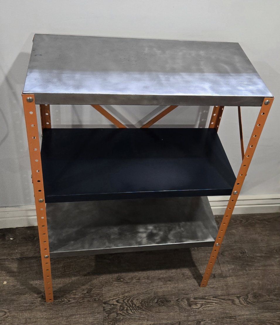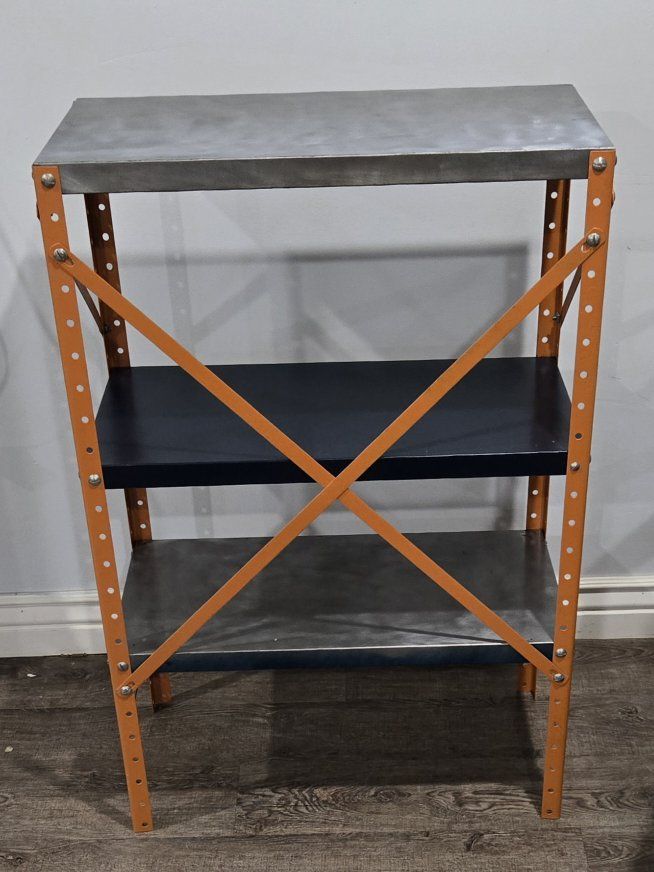 CashAppElevate your space with a piece of authentic industrial history. This is a heavy-duty, mid-century utility shelf that has been meticulously stripped and reimagined as a high-end furniture piece. Unlike modern "industrial style" reproductions made of thin mystery metal, this is a solid, vintage steel unit built to last another 70 years. The Restoration Process: Hand-Burnished Steel: The top and bottom shelves have been stripped to raw metal and hand-burnished to create a stunning, multi-tonal "cloud" effect. High-Contrast Frame: The uprights and X-brace feature a warm, vibrant copper/orange enamel that makes the steel pop. Professional Protection: The entire unit has been finished in a high-quality, durable clear coat. This seals the raw metal, prevents oxidation/rust, and makes the surface smooth and easy to clean. Perfect For: Audiophiles: The heavy-gauge steel provides a rock-solid, vibration-resistant foundation for a record player and vinyl storage. Plant Lovers: The clear-coated shelves are moisture-resistant—perfect for a "living wall" display of succulents and vines. Home Office: Adds a rugged, professional "loft" vibe to any workspace.