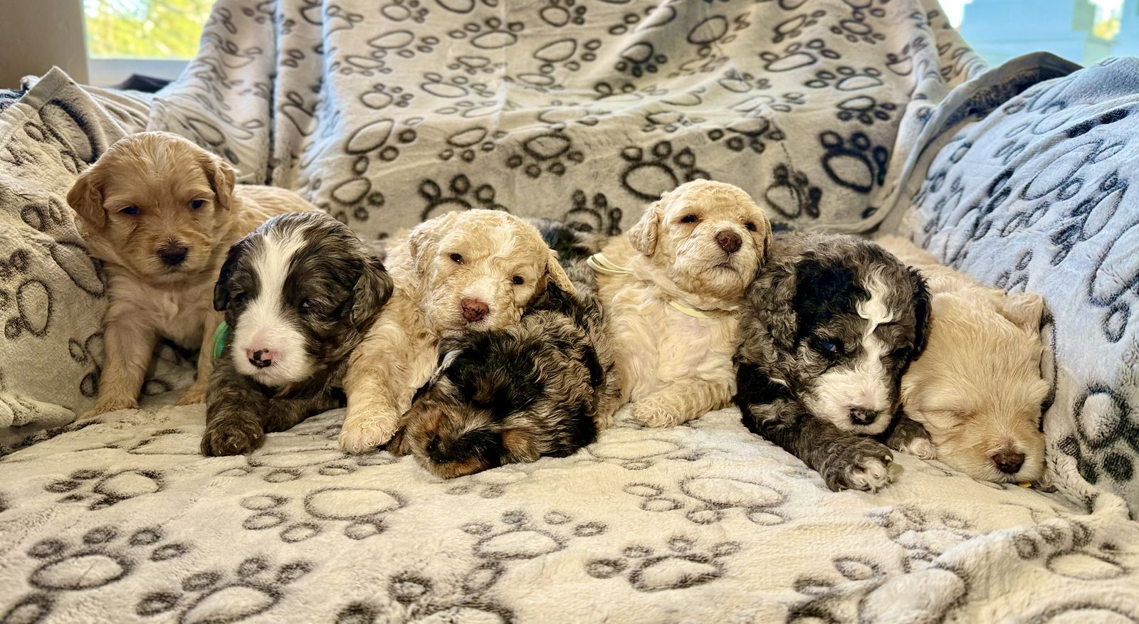 These pups have incredible genetics and really unique features you don’t see often—apricot, cream, golden, yellow, white, blue merle, and merle coats, plus a mix of brown and blue eyes. Some have curly coats, some are straighter… all of them are ridiculously soft.