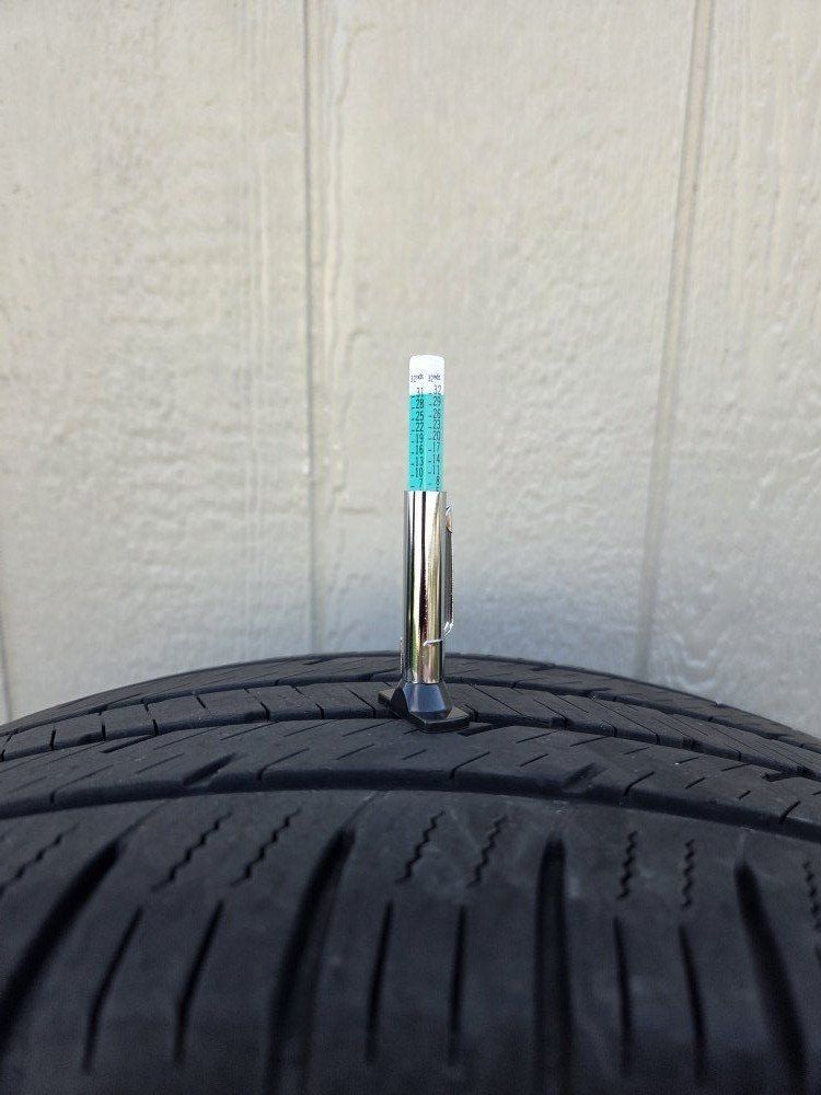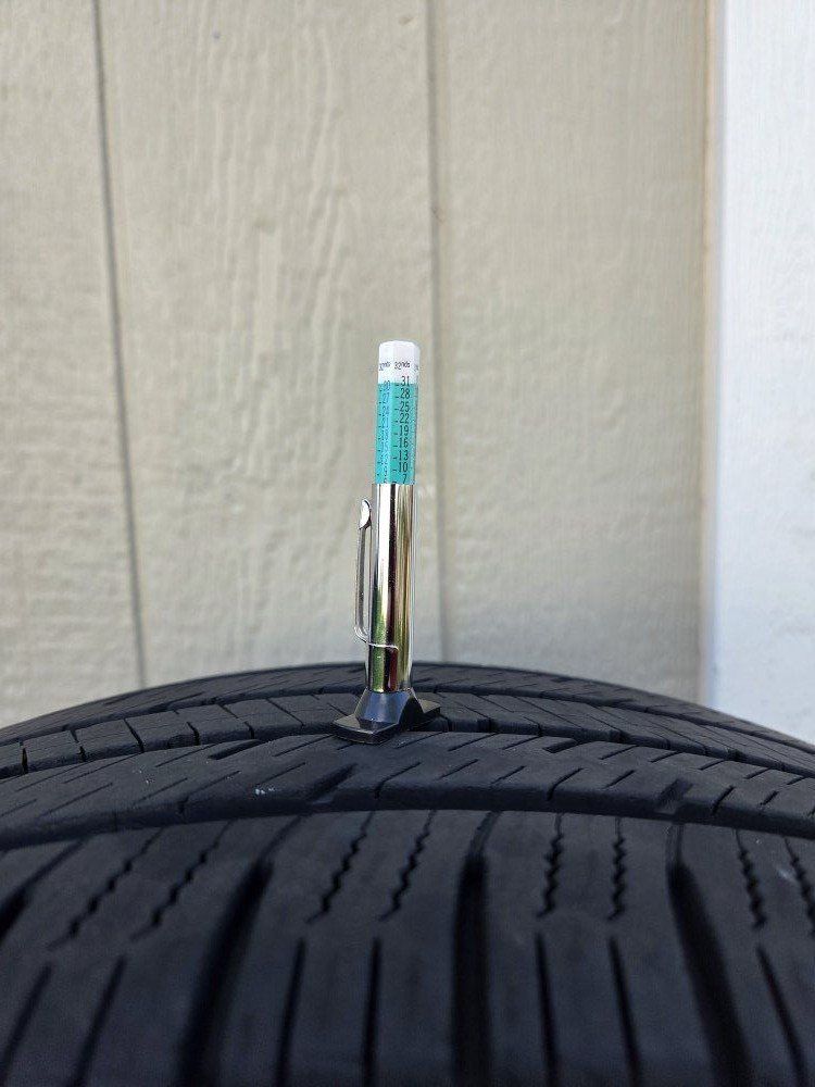 Even wear and plenty of tread life on all four. From the factory they have ~10.5/32 inches of tread depth and these still have ~7/32 inches.