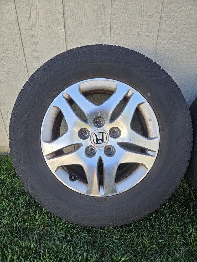 Set of 4 Mazama Reputation Tires mounted and balanced on Honda OEM 16” Alloy wheels. These were on our 2006 Honda Odyssey EX-L. We traded in the van this winter while it still had its dedicated snow tires and wheels mounted so we don’t need these anymore.