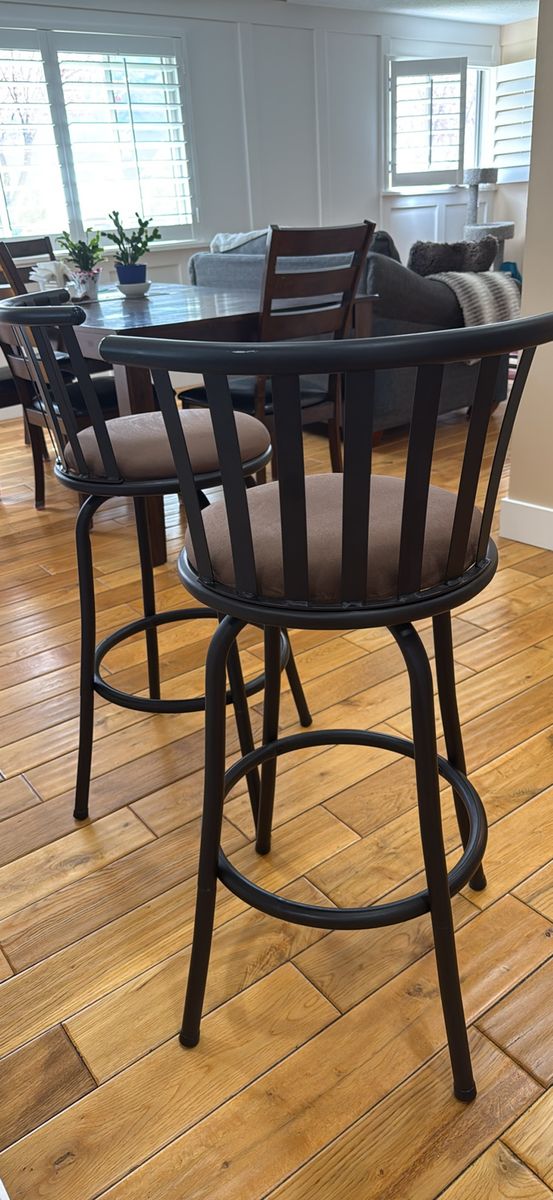 2 swivel bar stools in great shape. Bought on FB but too tall for my counter top. Ht floor to top of seat cushion : 28”, from floor to top of seat back: 37.25”. Cash only. Pick up in Orem.