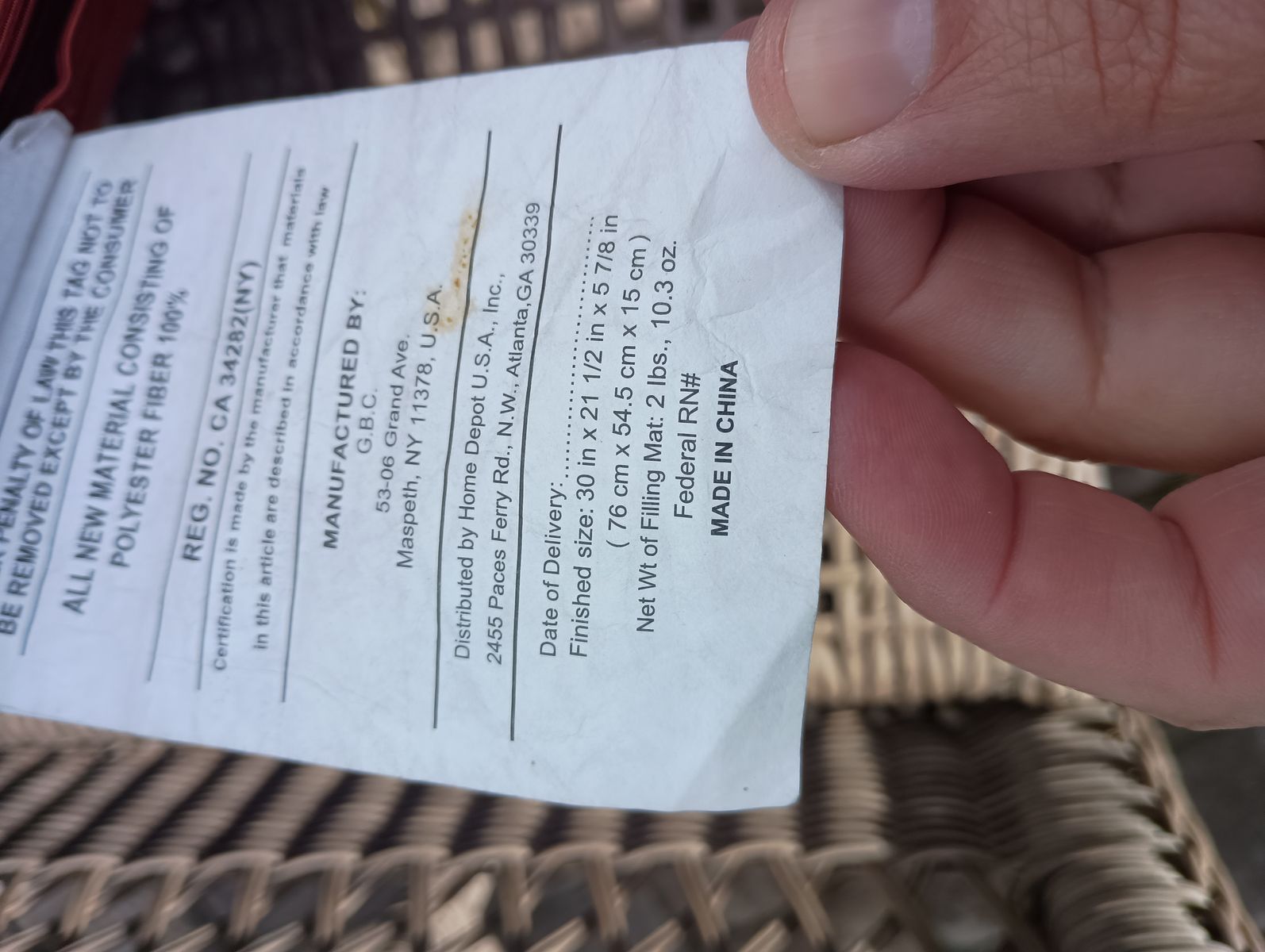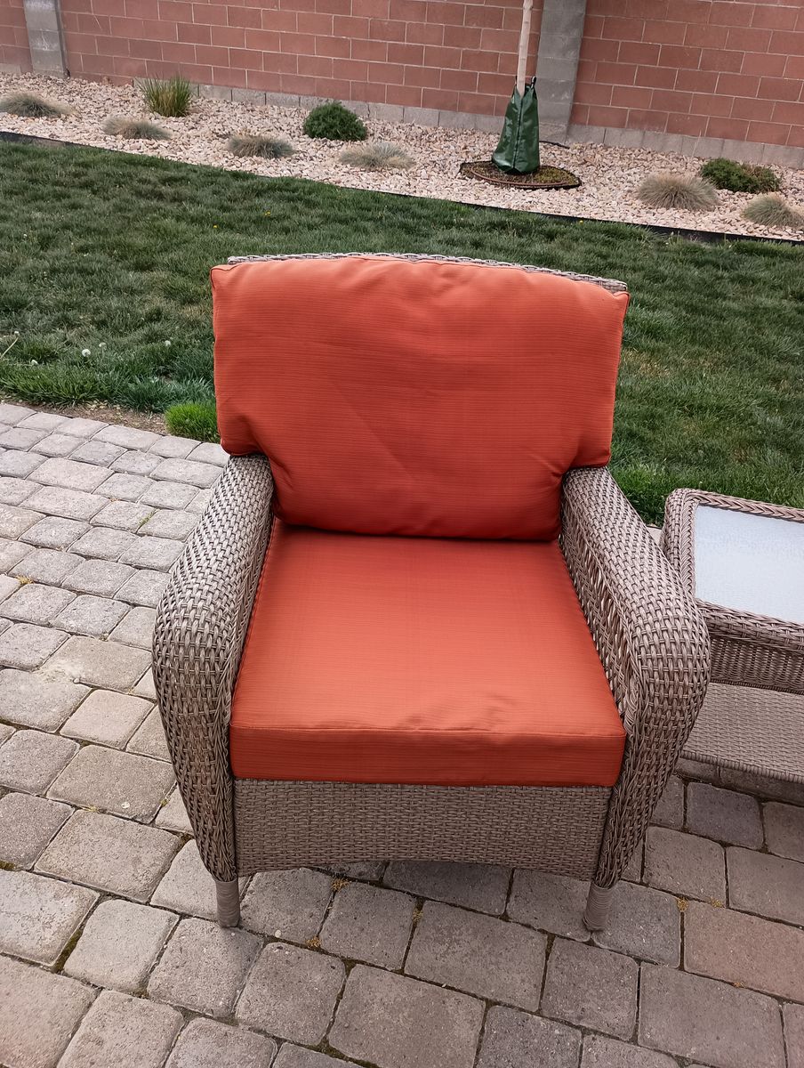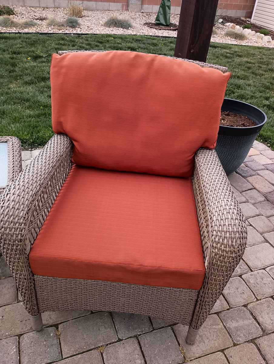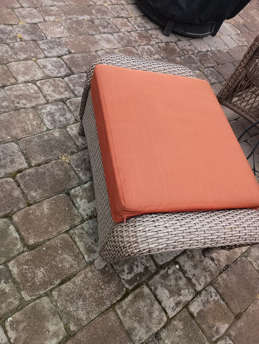 Outdoor cushions (cushions only) 2 chair set, sofa set (4) and ottoman (1), 9 total. In good condition just a little sun faded. Kept put away when not in use. Picture of tag is size of the bottom cushion.