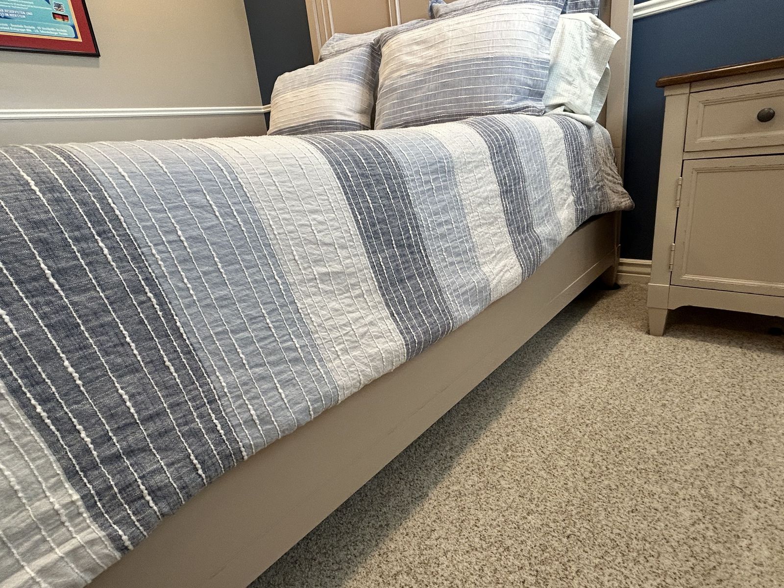 Entire set is is good condition, and ready to use immediately (with the addition of a mattress). (Comforter and linens in photo are not included.)