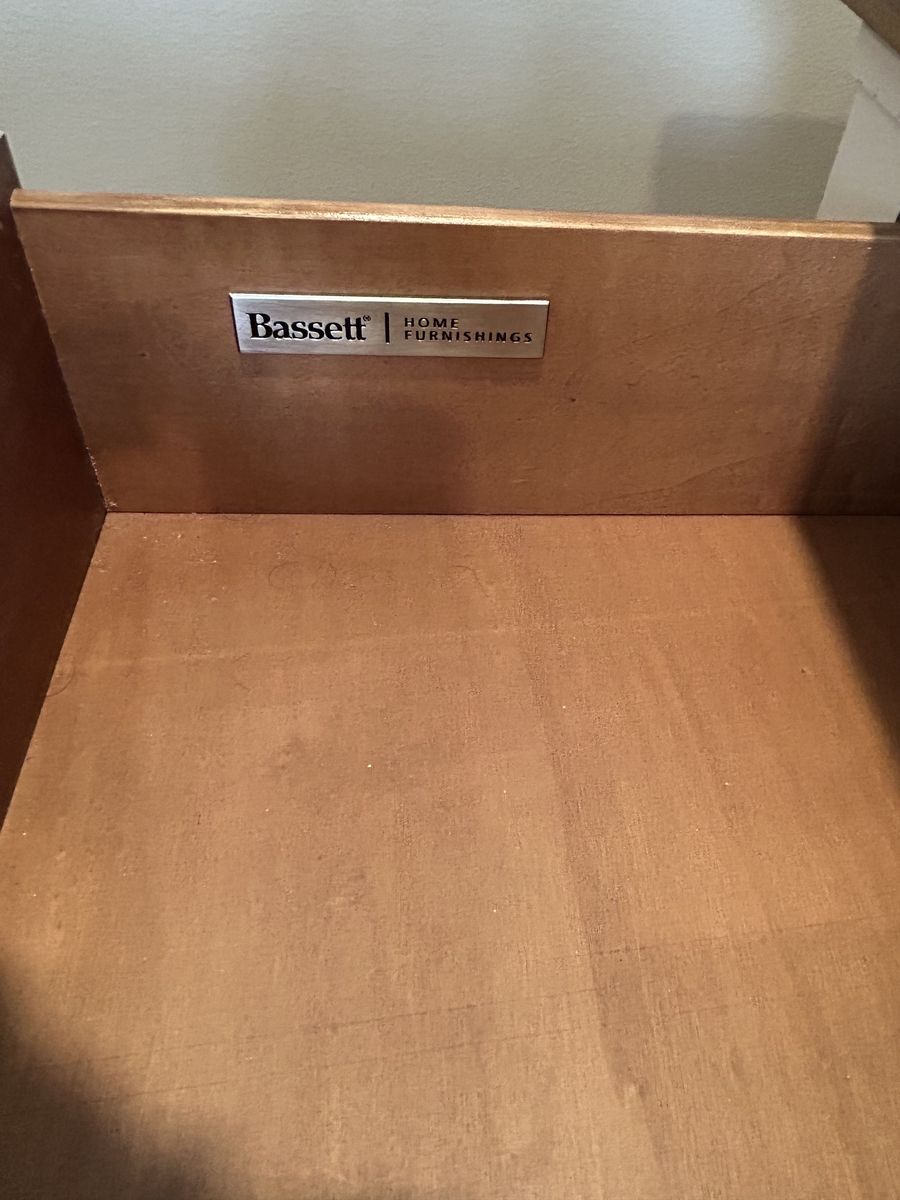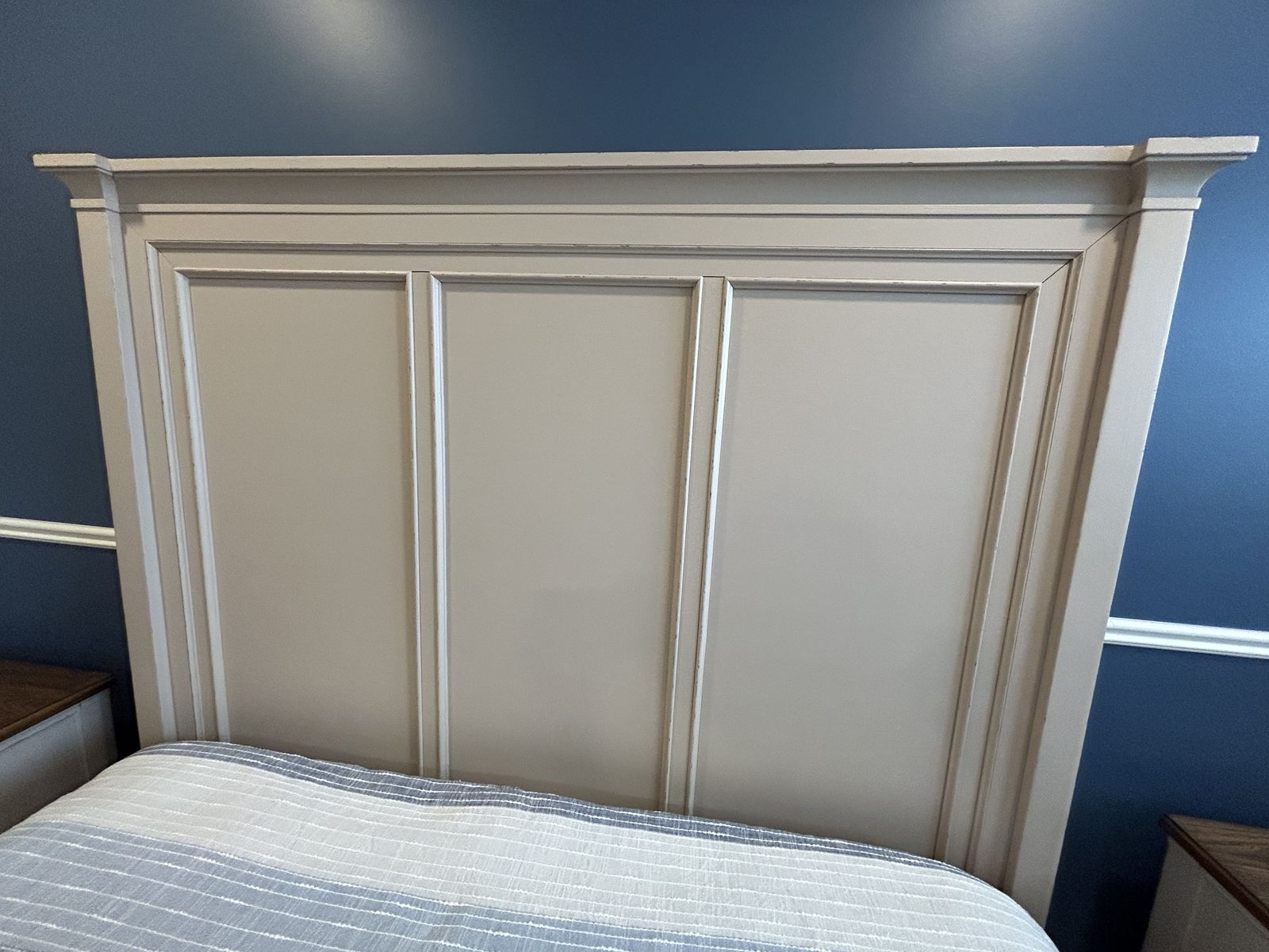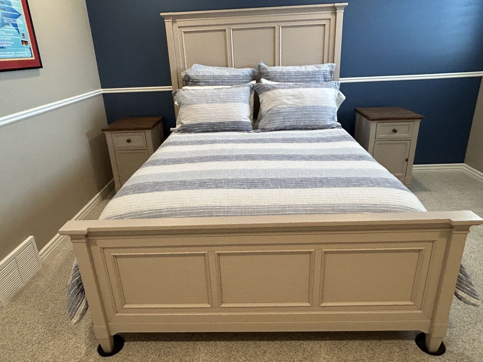 VenmoVaughan-Bassett bedroom set, including queen bed (no mattress) and two nightstands.