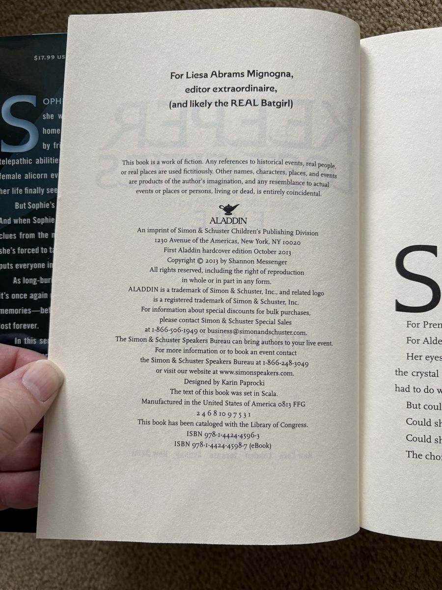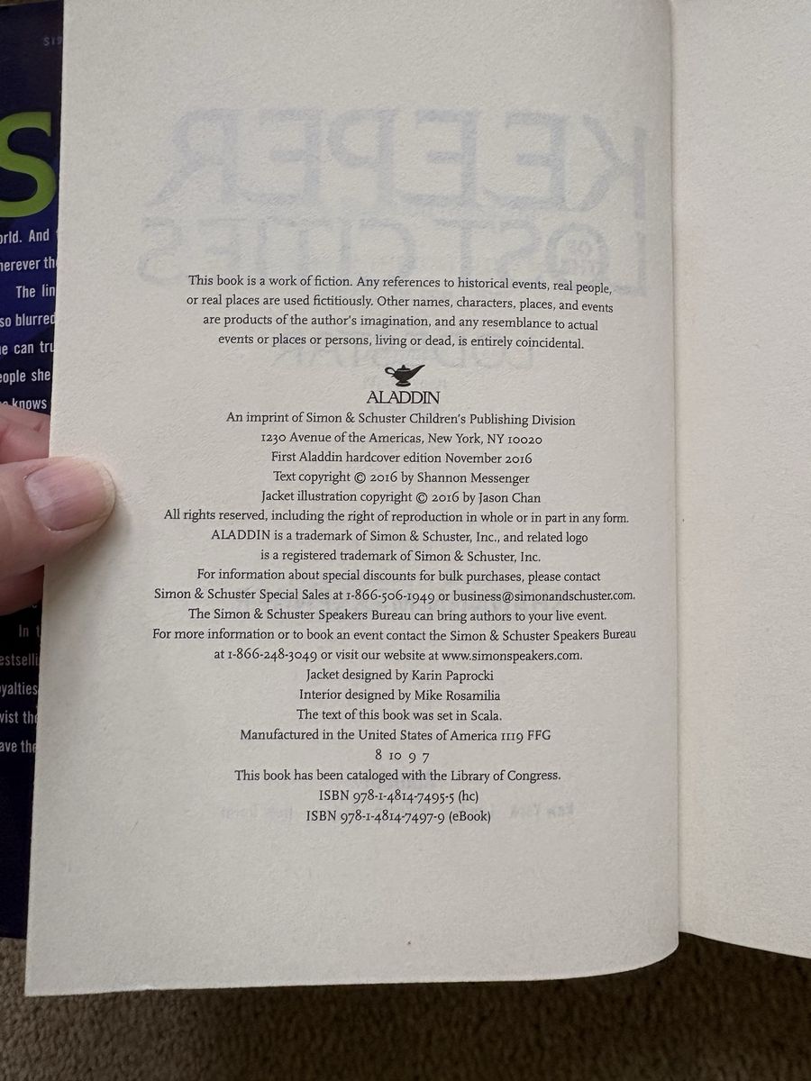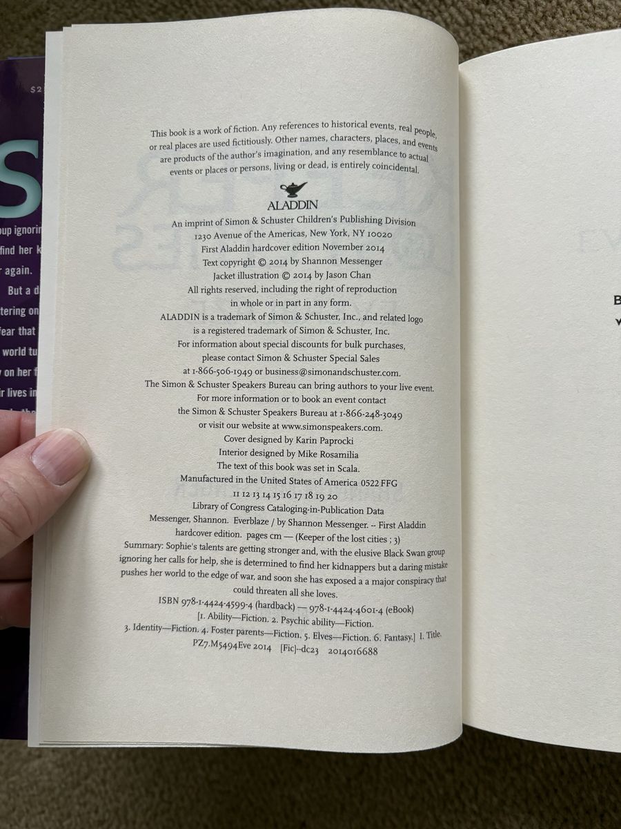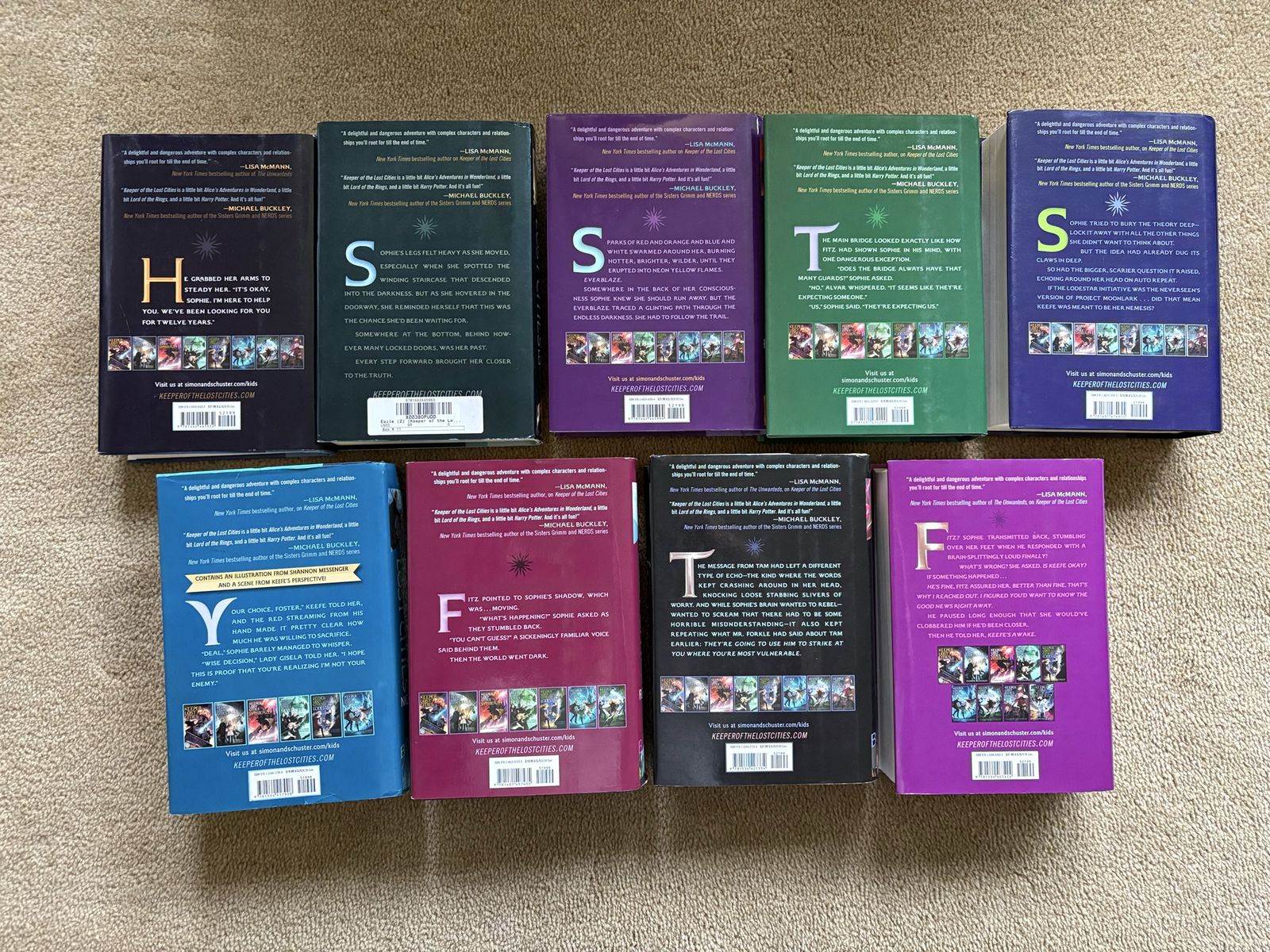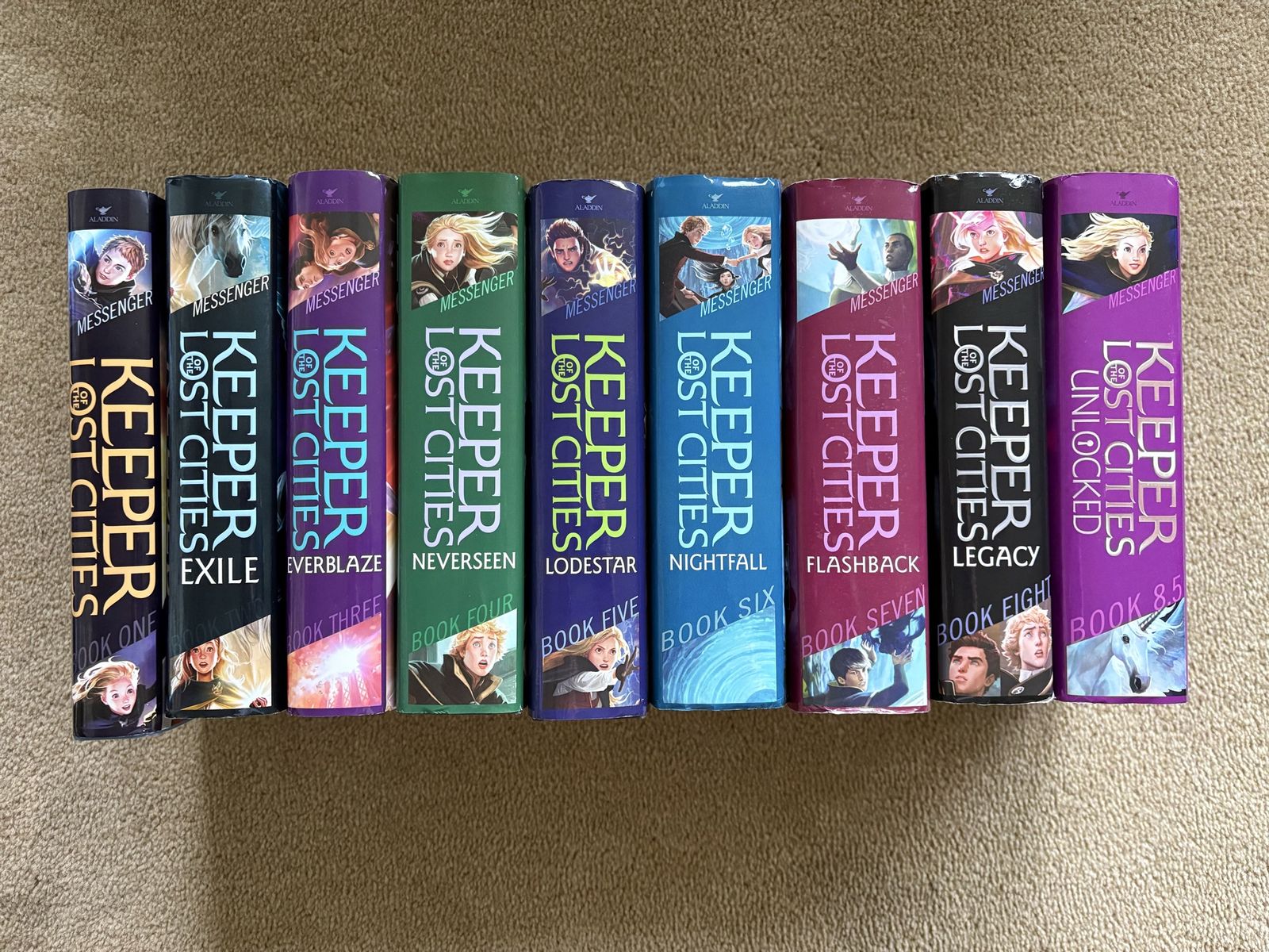 Keeper of the Lost Cities series, by Shannon Messenger, books 1-8.5 (9 books): Keeper of the Lost Cities (2012, 488 pages), Exile (2013, 568 pages), Everblaze (2014, 609 pages), Neverseen (2015, 672 pages), Lodestar (2016, 668 pages), Nightfall (2017, 794 pages--Barnes & Noble exclusive edition), Flashback (2018, 845 pages), Legacy (2019, 789 pages), and Unlocked (2020, 747 pages). First edition hardcovers in excellent condition, including dust jackets. Text only. Cash or Venmo. Discount on multiple items.