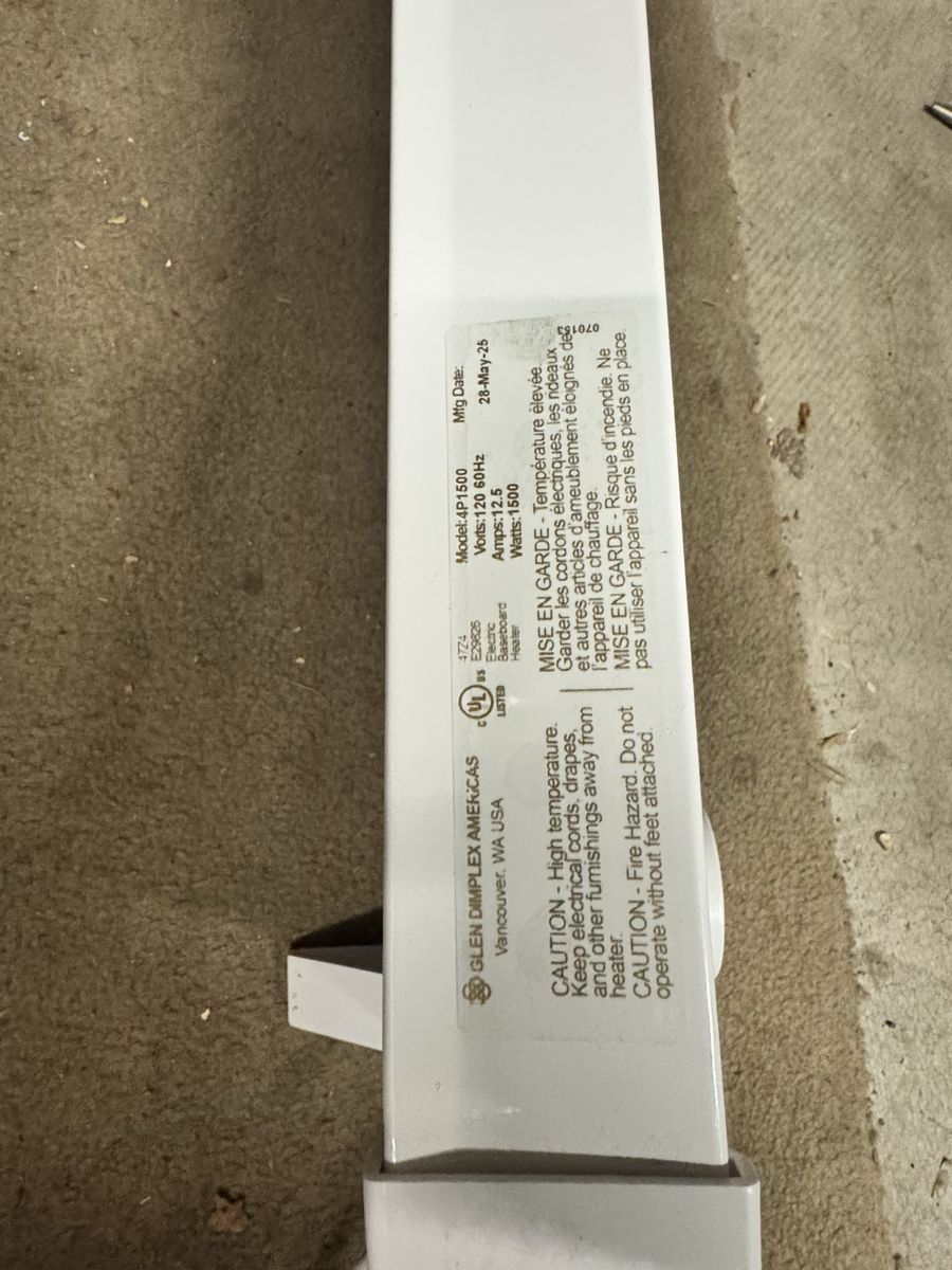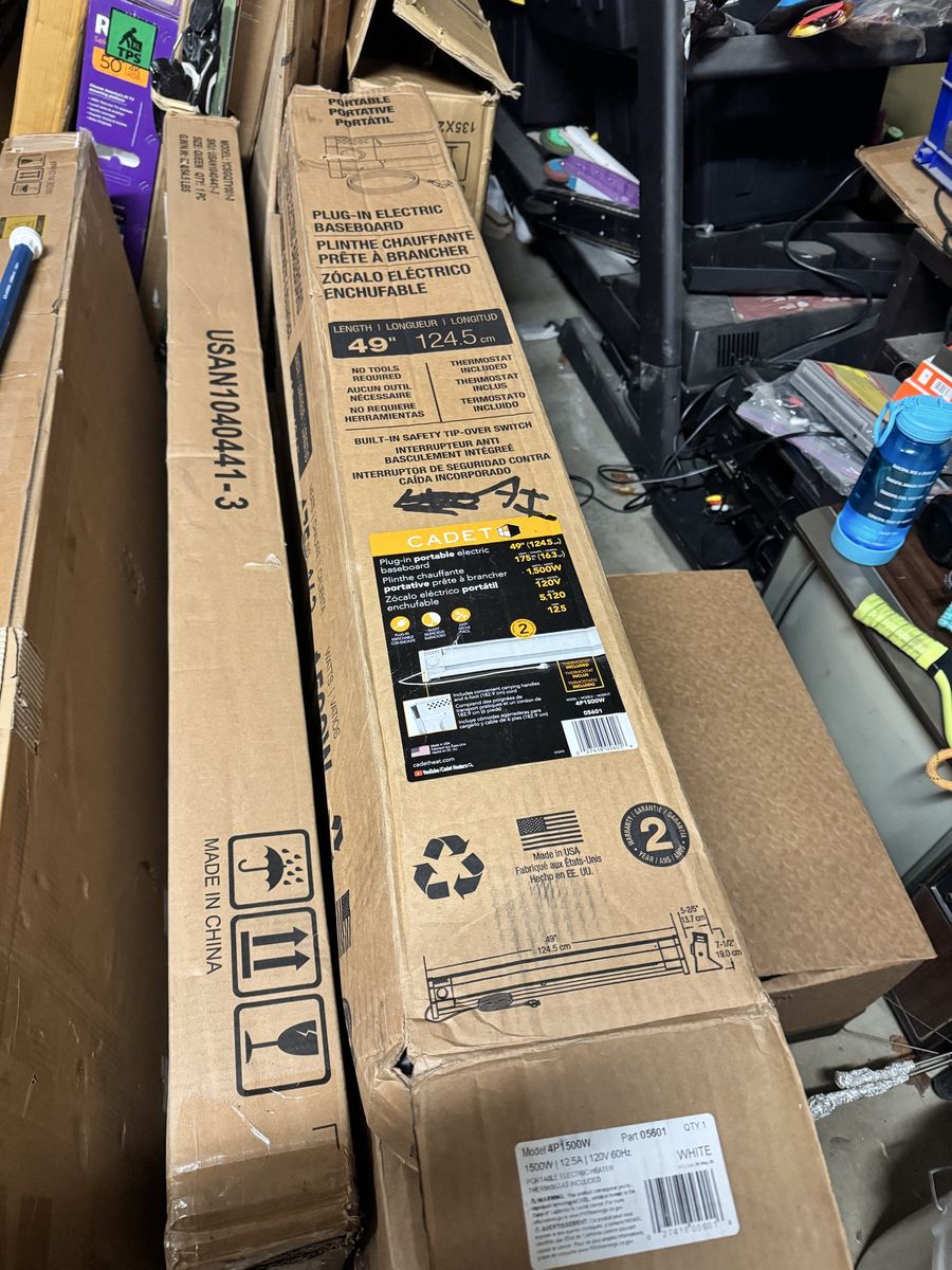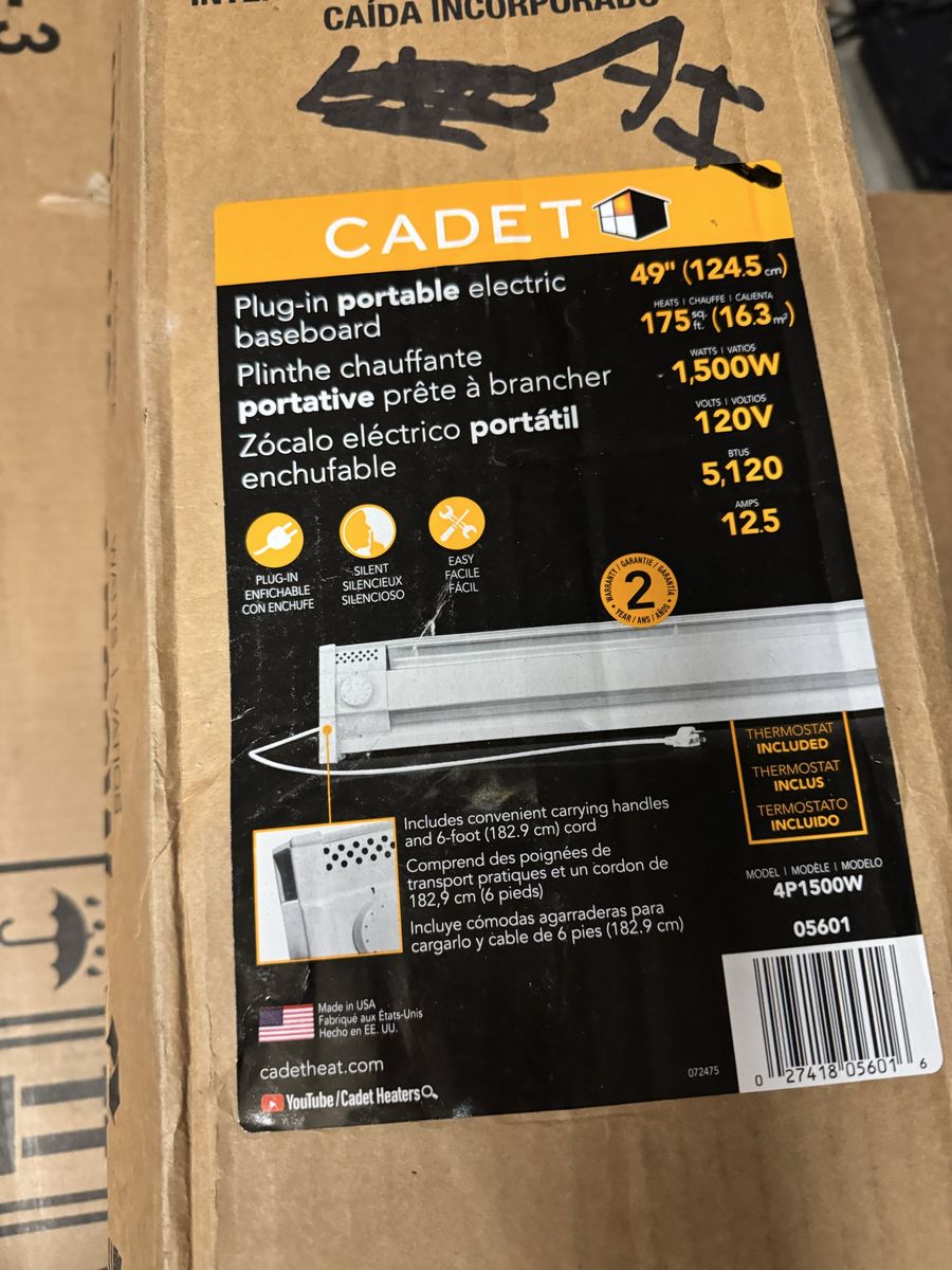 VenmoNew CADET portable electric baseboard heater. This one is 49 inches long and puts out 1500 watts, perfect for heating up to 175 square feet. It's 120V and has a thermostat built in. Comes with a 6-foot cord too. Super easy to just plug in and go!
