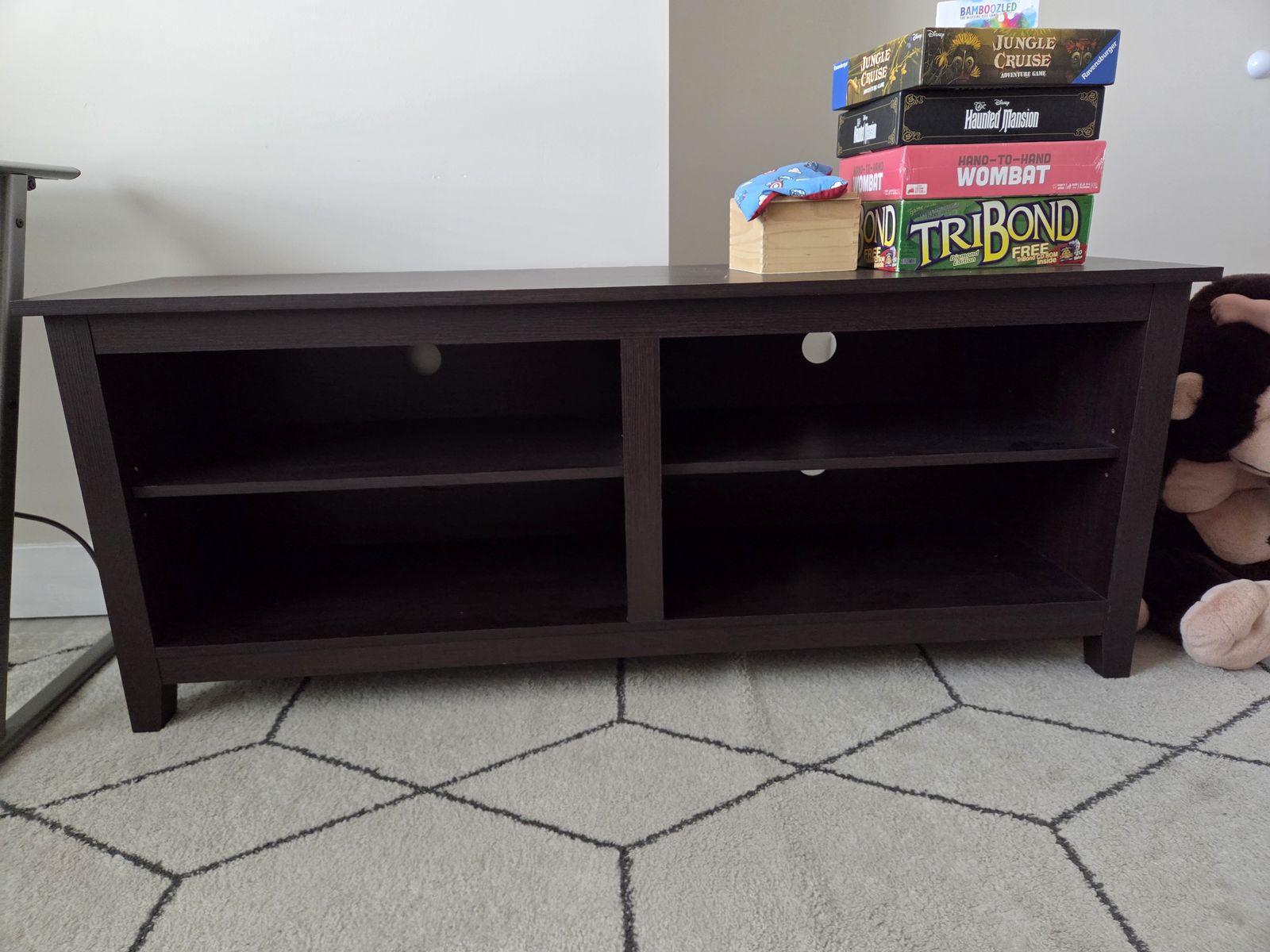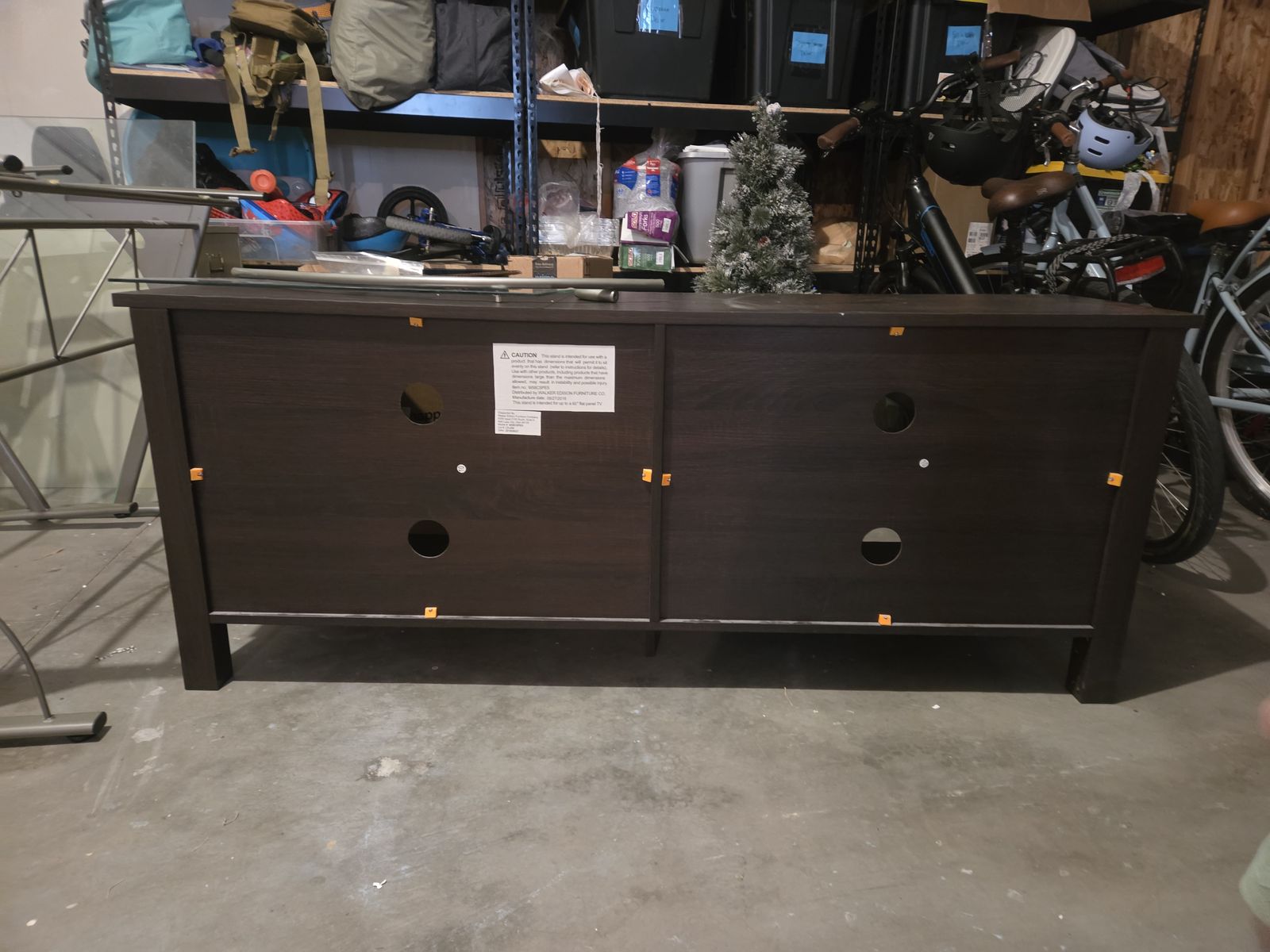 VenmoTv console table entertainment center. Good construction but moved and no longer need it in our current home. Light scratches on top from wear. 4 large sections for additional storage.