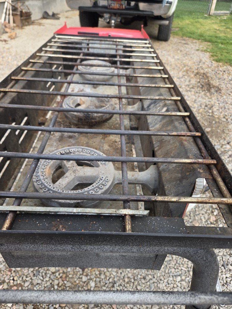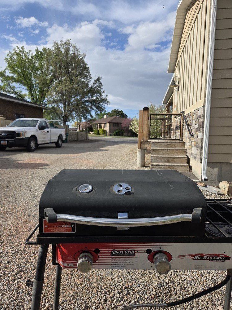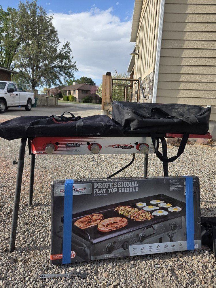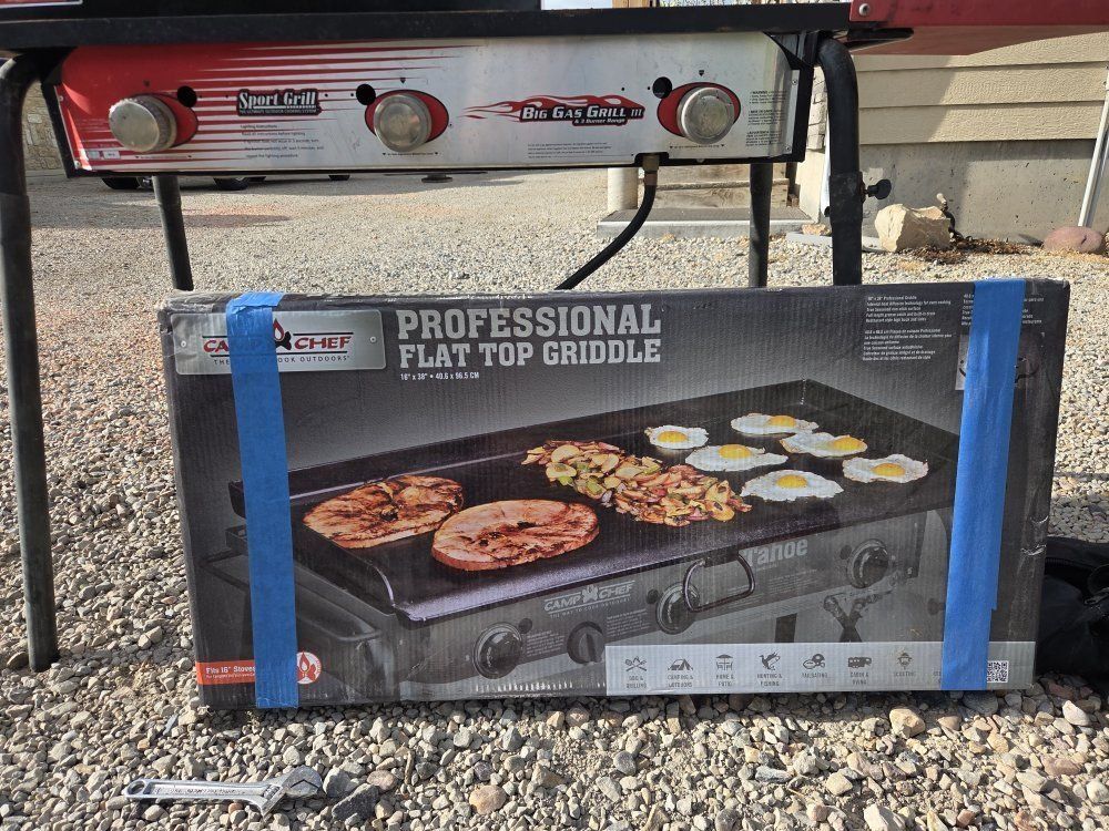 ZelleUsed Camp Chef Big Gas Grill 3 with Grill Box, 2 burner griddle, and 16x38 professional griddle.