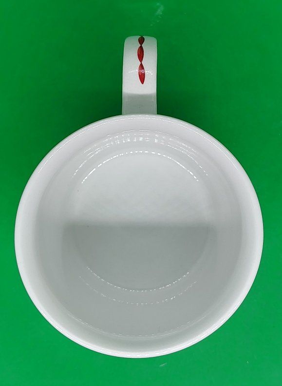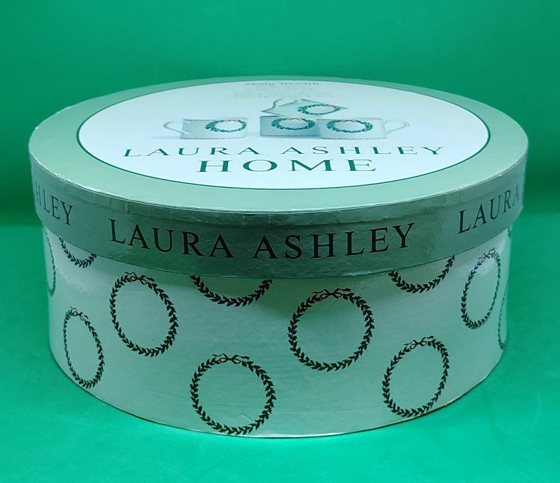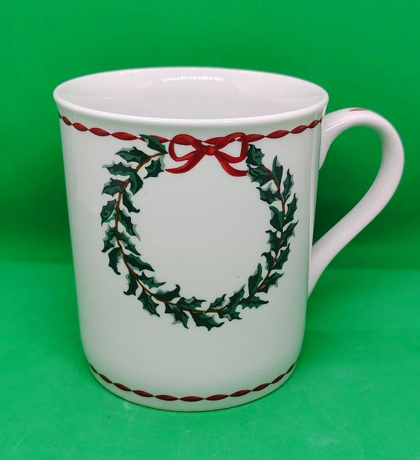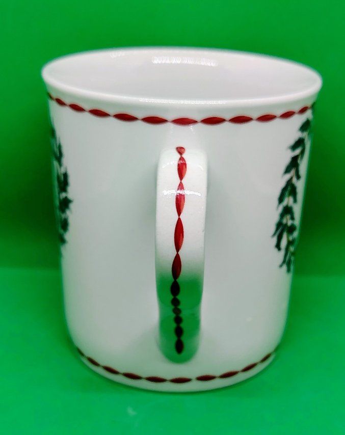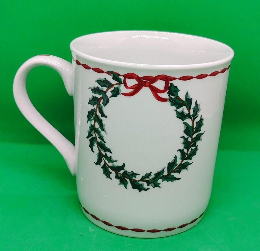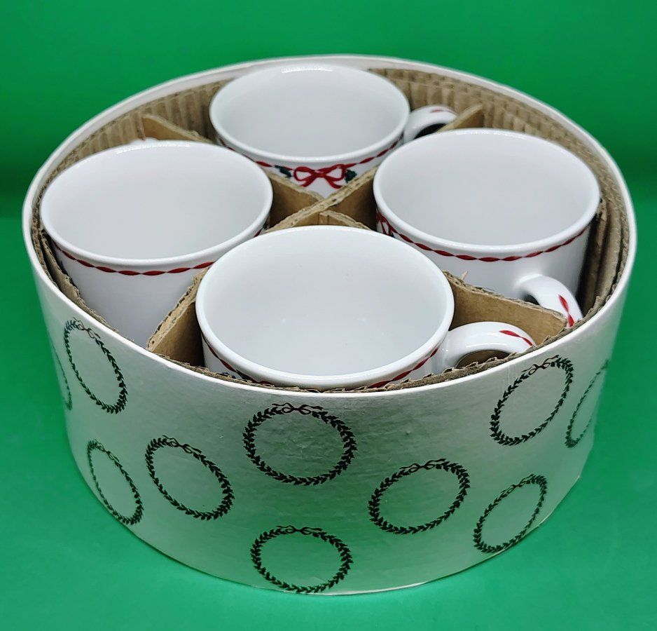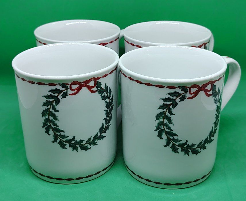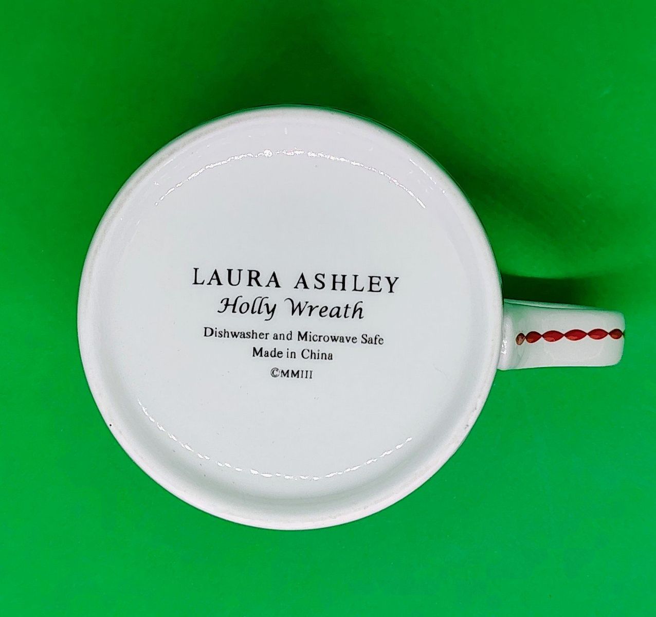This is a Laura Ashley "Holly Wreath" Porcelain Mug Set. It is a festive collection including four 12 oz (35.5 cl) mugs, packaged in a decorative round gift box. Design: Features a classic holiday holly wreath motif with a red ribbon on a white porcelain background, accented by red pinstripes around the rim. Material: Crafted from high-quality porcelain, which is generally durable and has a glossy finish. Pattern History: This specific "Holly Wreath" pattern was manufactured around 2006–2007 and is currently a retired/discontinued line. Each mug is , 4 inches H, 3.5 inches Dia. A little abrasion on the box.