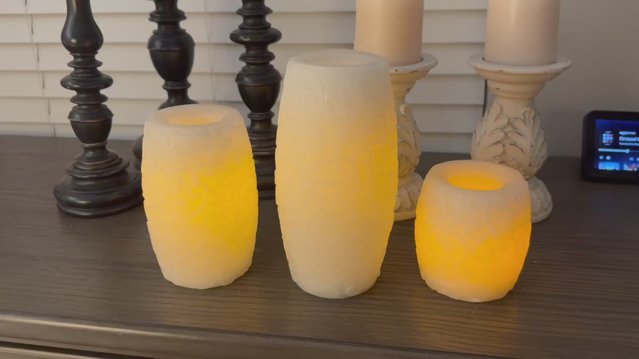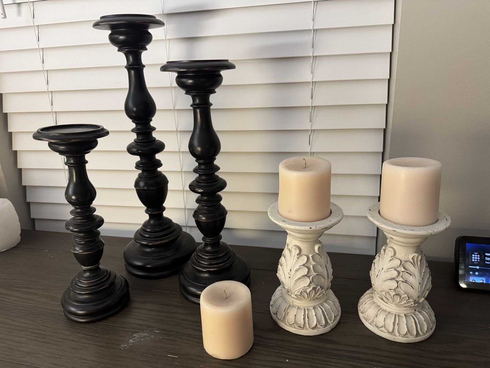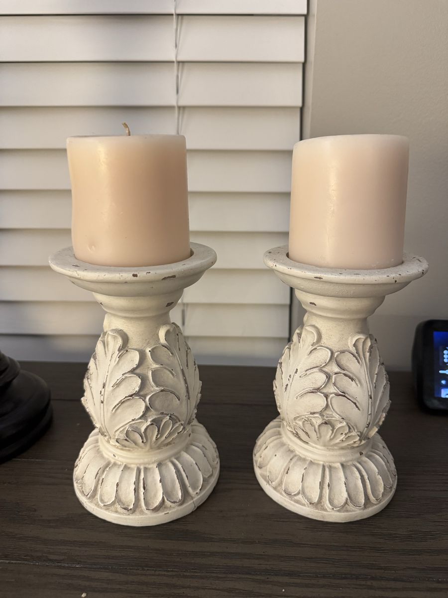 ApplePayHeavy wooden decorative candle holders. The three electric candles run on batteries. Make an offer.