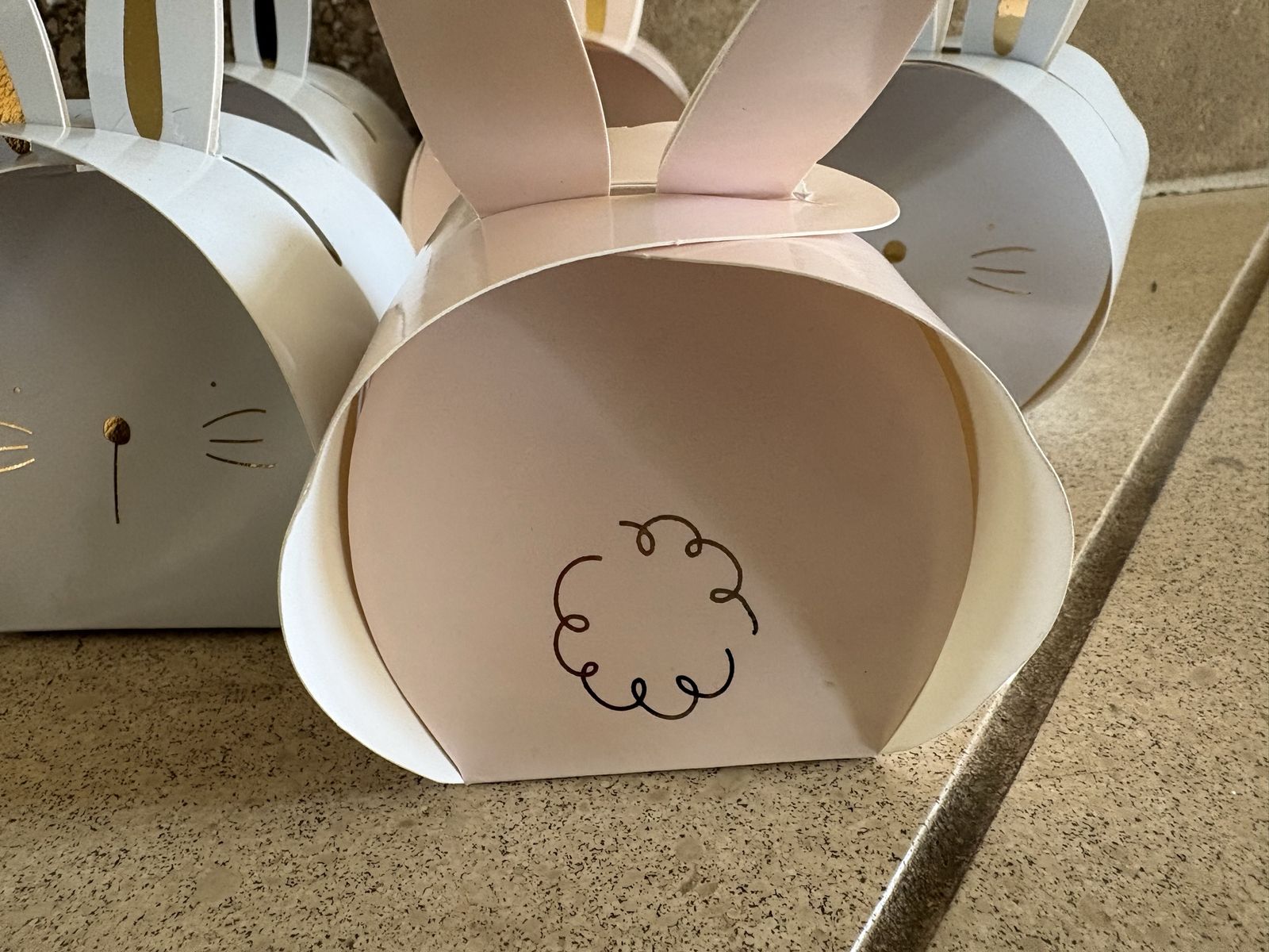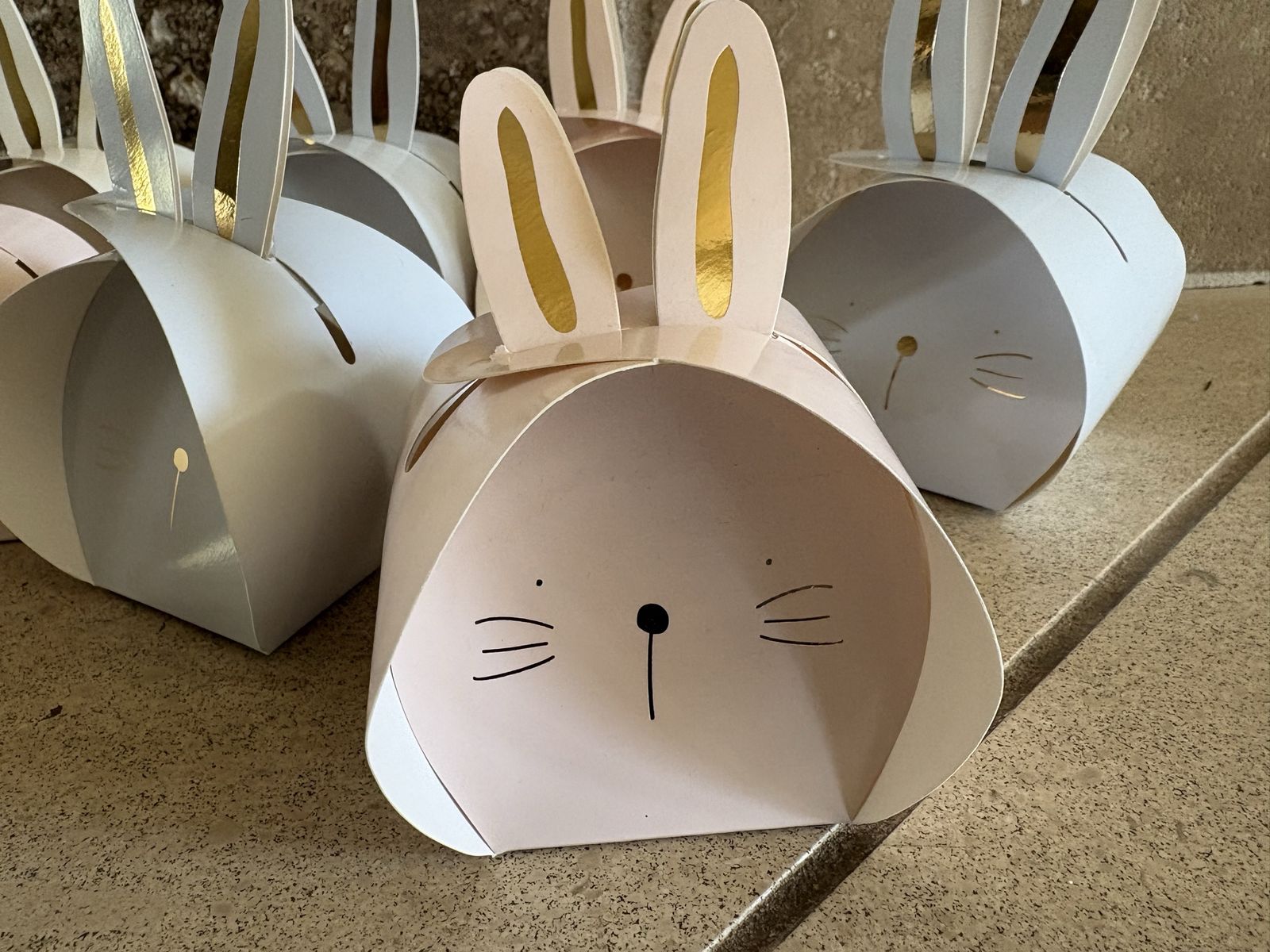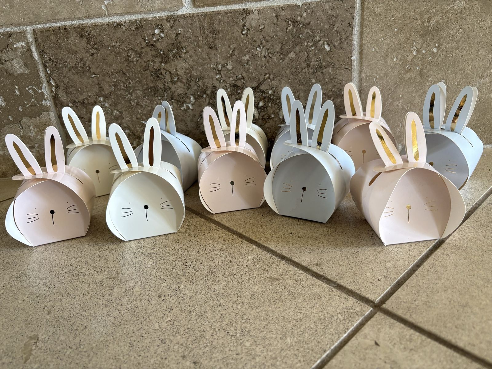 I have 11 paper bunny rabbit boxes for treats or party favors. They are light pink, light blue and white. They have a face on one side and a fluffy tail on the other. They are 3 inches wide. The box part with out the ears is 2 1/2 inches tall. The ears are another 2 inches. They were made by My Mind’s Eye. The price is for all of them together. See my other ads for jewelry, artwork, home decor and more.