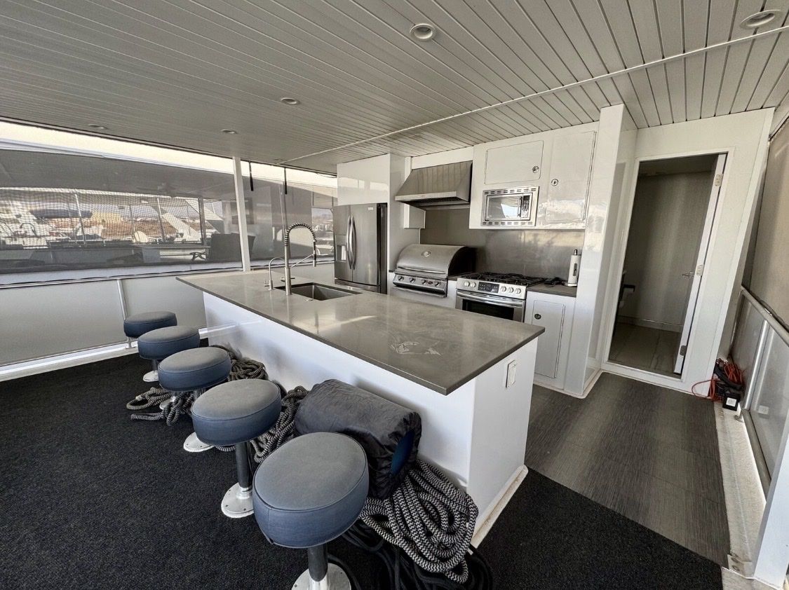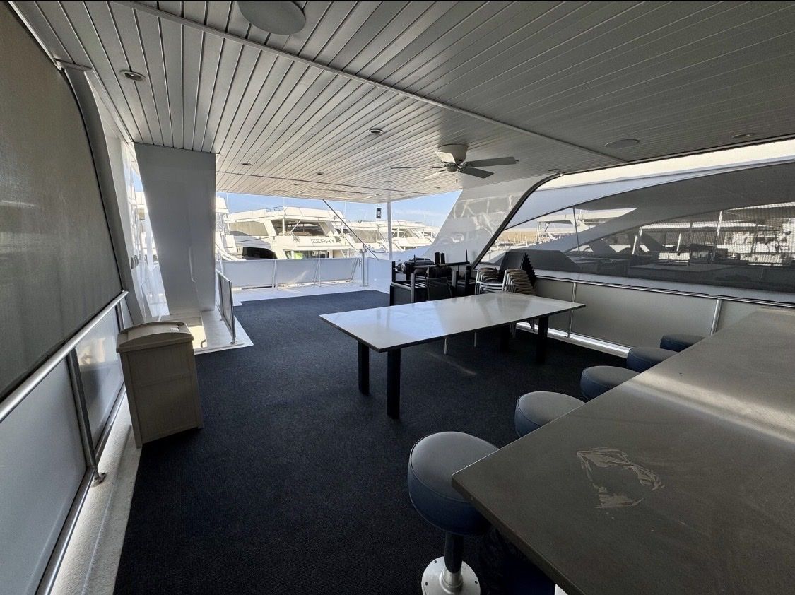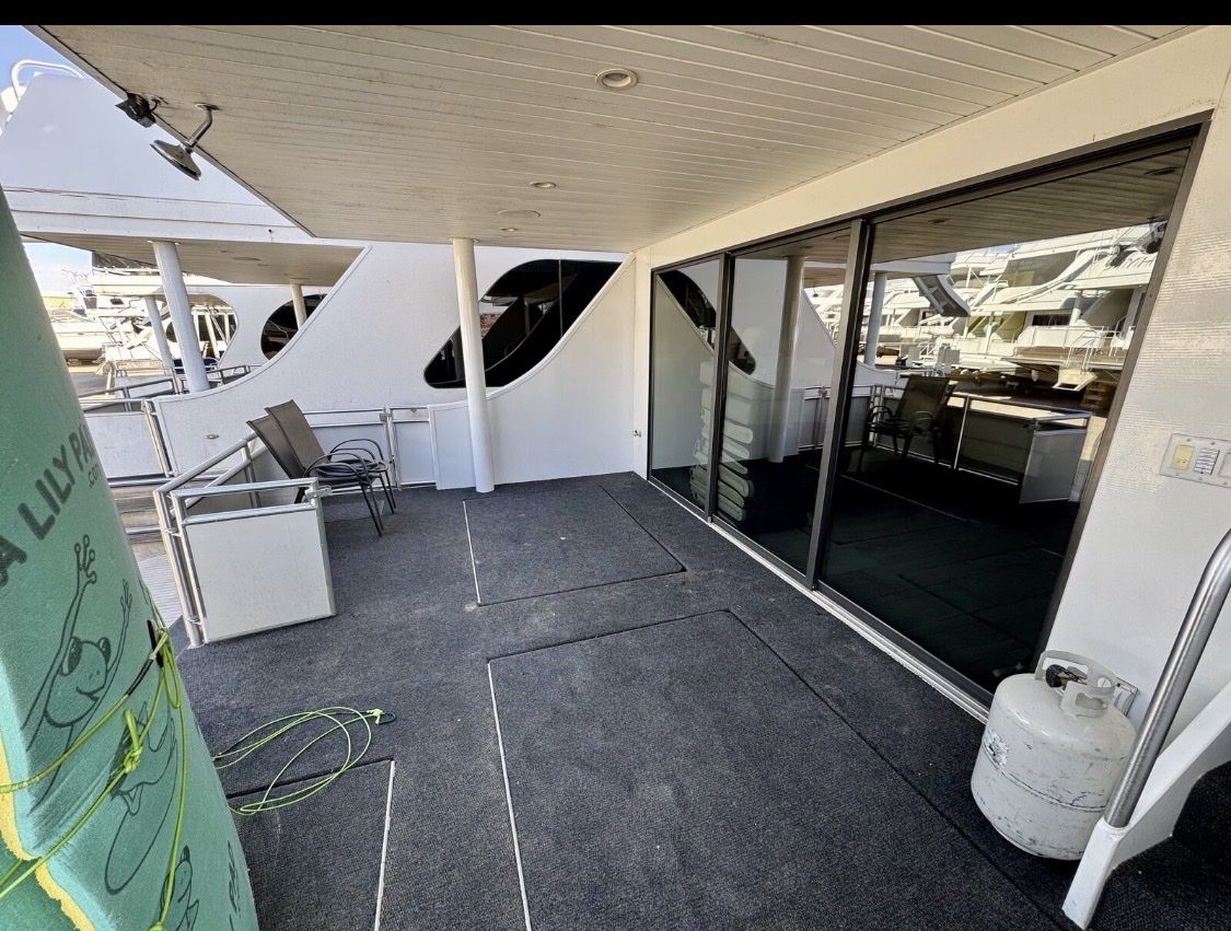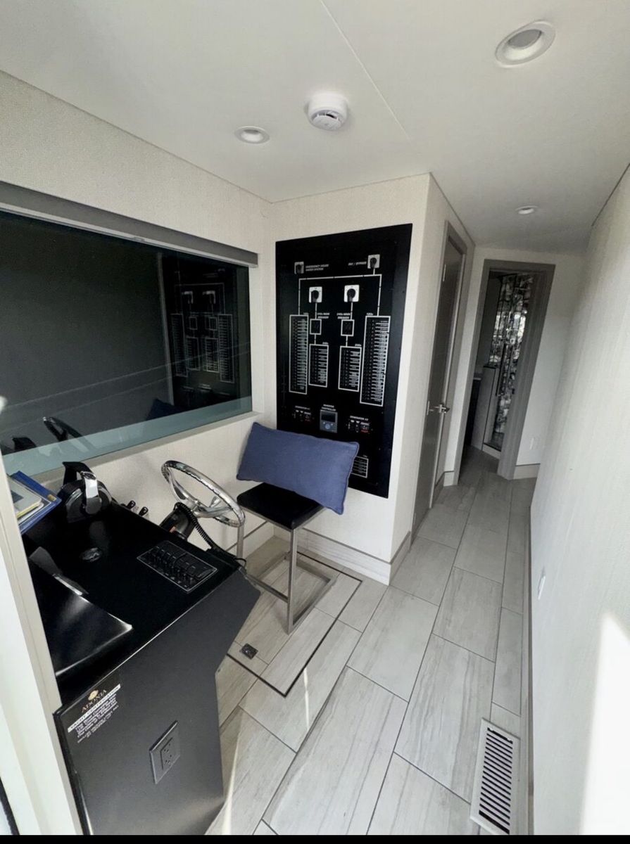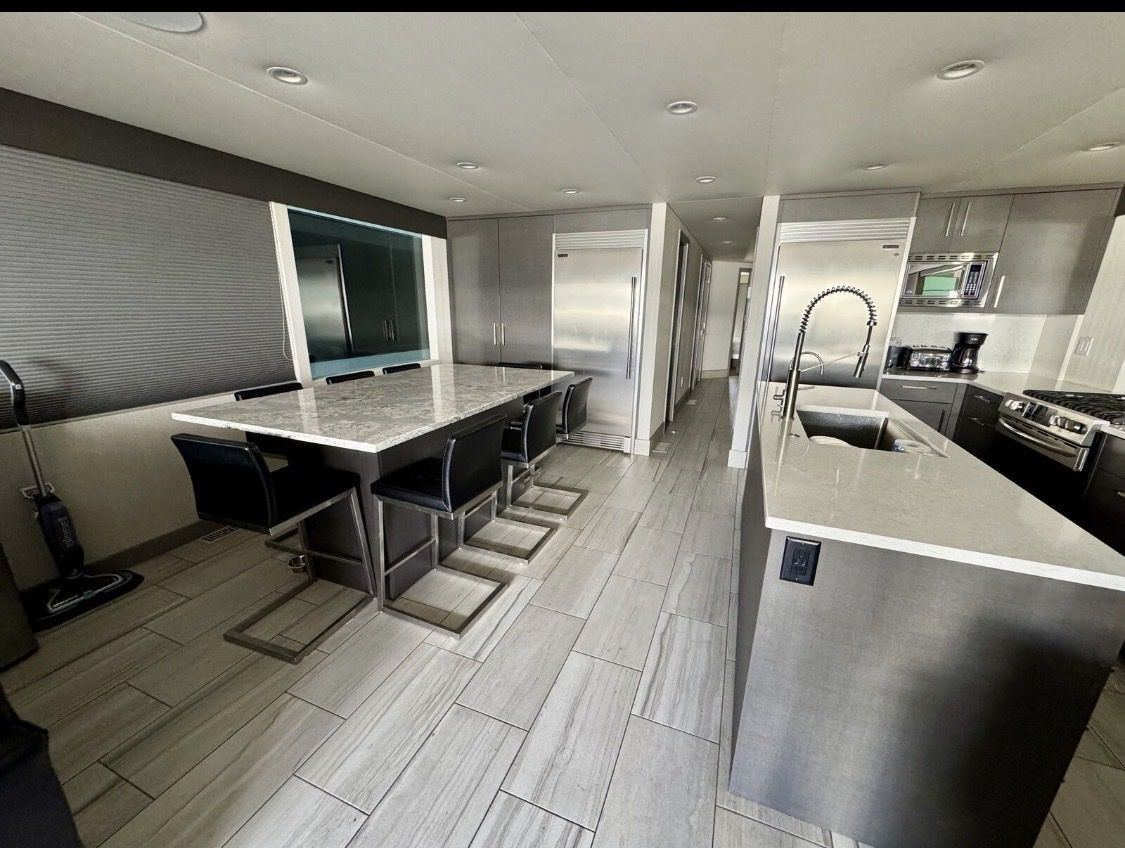 Sleeping Capacity: Easily sleeps 20 guests Rooms: 8 total Climate Control: Central air conditioning & heating Sleeping Accommodations 2 Private Primary Suites King-size beds Under-bed storage Full private bathrooms 2 Private Upper-Level Suites Queen-size beds 2 Private Cuddy Cabins Queen-size beds 2 Kid’s Cuddy Cabins Sunbrella padding TV/DVD combos Additional Sleeping (2) salon sofas (2) upper-deck sofas with 8 sleeping pads total Bathrooms Private bathrooms for both master suites Upper-deck bathroom pod with refrigerator/freezer & ice maker UVB fresh water processing system 780-gallon holding tank capacity Entertainment & Technology Custom ceiling drop-down 60” HD/LED TVs with surround sound in: Main salon Mid-deck entertainment lounge with custom sofa LED TV/DVD combos in both master suites Intellian in-motion, self-tracking satellite TV Complete electronic navigation system (2) ship-to-shore marine radios Backup cameras at both main and upper helms Deck & Outdoor Living Upper deck hardtop canopy with inset lighting Upper & lower safety rails with hard sides Upper-deck breakfast bar with: Sink Dishwasher Microwave Range (5) bar stools Outdoor patio & deck furnishings Front deck BBQ grill Rear deck slide with water pump Full 5-foot extended swim platform Custom water stairs Front & upper deck screening Galley & Interior Complete galley with service for 20 guests Custom cabinetry throughout Custom countertops in galley Coffee maker, toaster, blender & electric skillet Full-size stainless-steel range & oven Microwave & dishwasher 66” stainless steel refrigerator/freezer combo Commercial-grade ice maker Trash compactor Washer/dryer combo Custom upgraded finishes throughout the interior Mechanical & Power Engines: Twin Diesel Mercruiser 180 HP with Bravo II drives Generators: (2) Diesel generators – 25kW Fuel Capacity: 700 gallons diesel (main tanks) Toy tank with electric pump Battery System: 12V house system 4,000-watt inverter with easy-access hatch Safety & Systems Windlass anchoring system Anchors, lines, docking & mooring equipment Life jackets & full safety equipment Below-deck storage