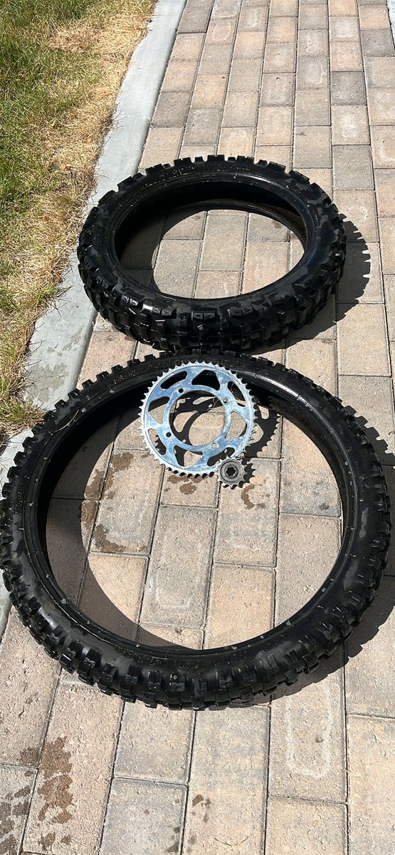 It currently has dot approved hybrid tires that have great traction. I will include the original tires in the sale as well as the original sprockets but the current setup is great.