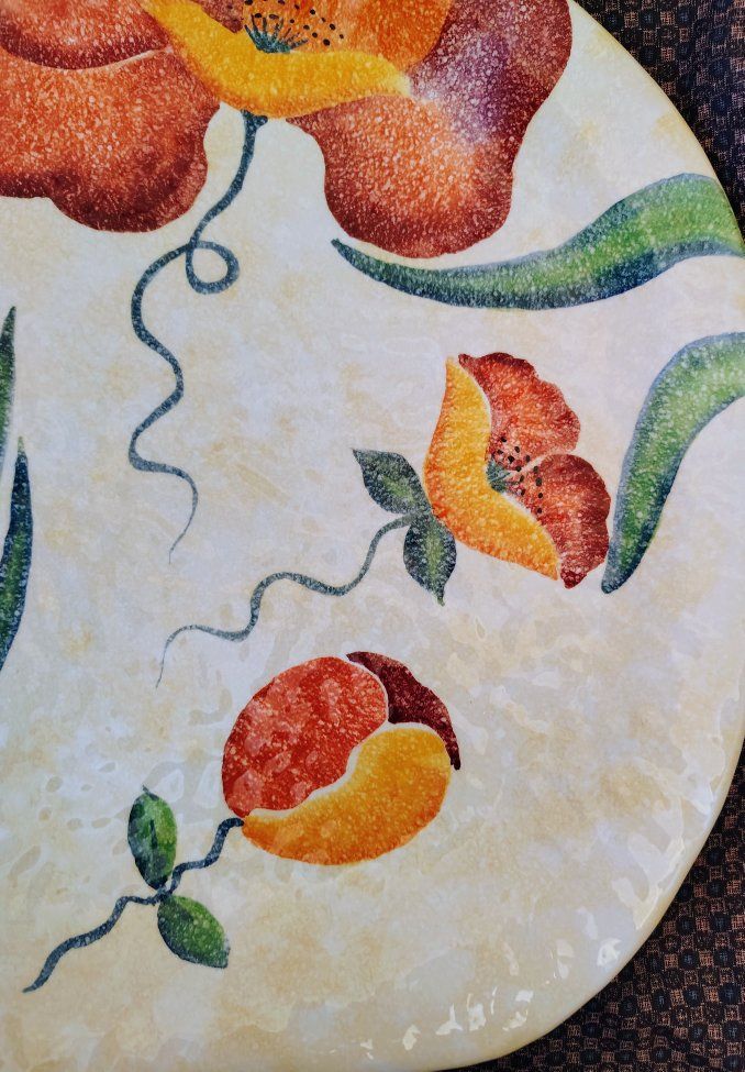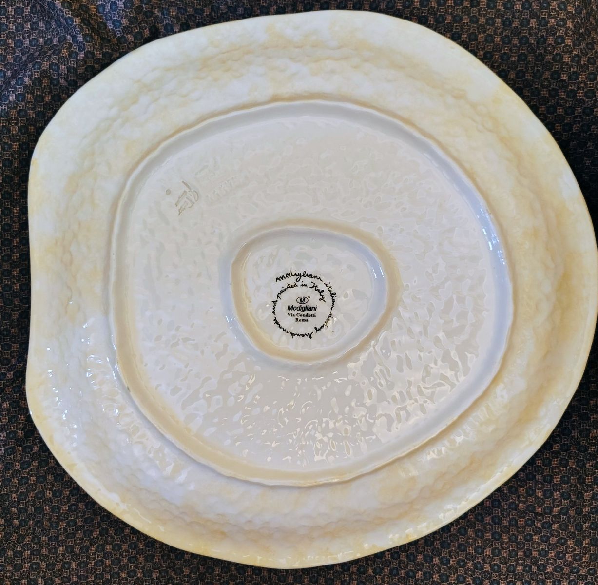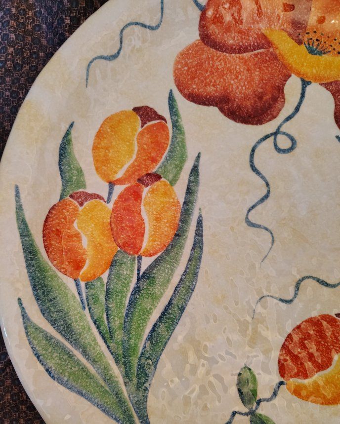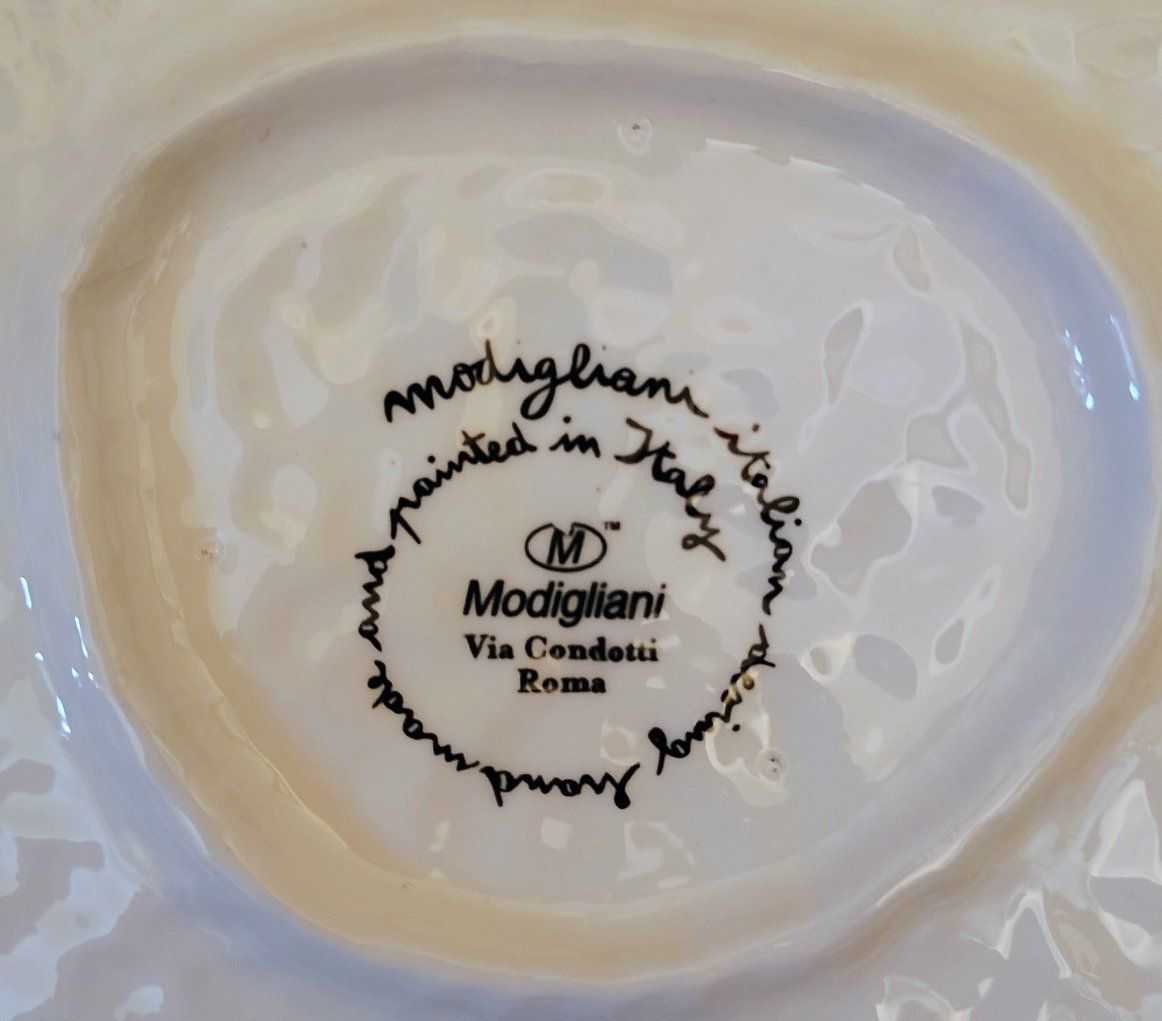 This ceramic plate appears to be part of the Terra Fiorita collection by the Italian artisan ceramics brand Modigliani.Design DetailsThe plate features a hand-painted floral design with vibrant orange, red, and yellow blossoms. The style is characteristic of Modigliani's work, which often utilizes a "stippled" or textured painting technique and whimsical, squiggly stems.About the BrandModigliani is a renowned Italian brand specialized in handmade and hand-painted ceramics.Origin: The company is based in Italy, with notable presence in Rome (Via Condotti).Craftsmanship: Their pieces are entirely handmade by Italian artisans, making each piece unique.Other Notable Collections: In addition to floral patterns like "Terra Fiorita," they are well-known for fruit-themed collections such as Frutta Laccata. Dimensions (inches): Approximately L 15 3/16, W 14 7/8