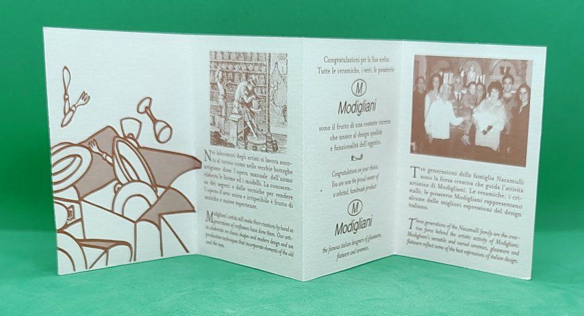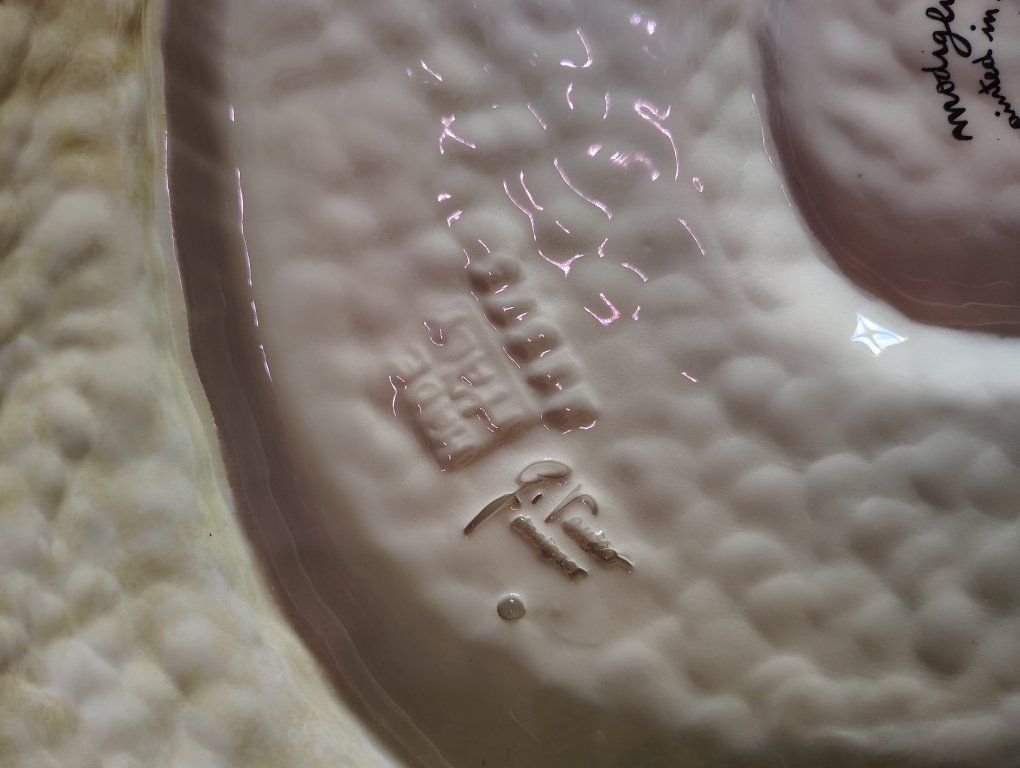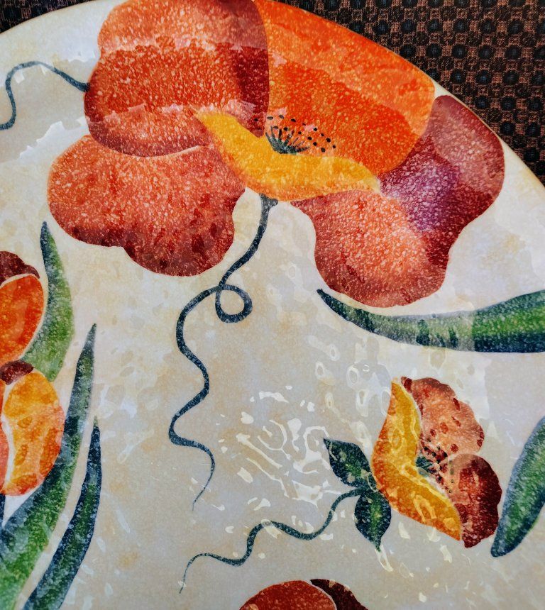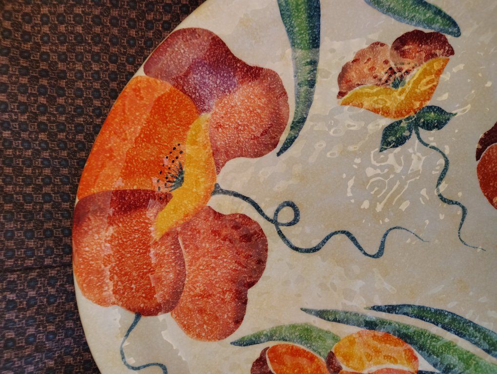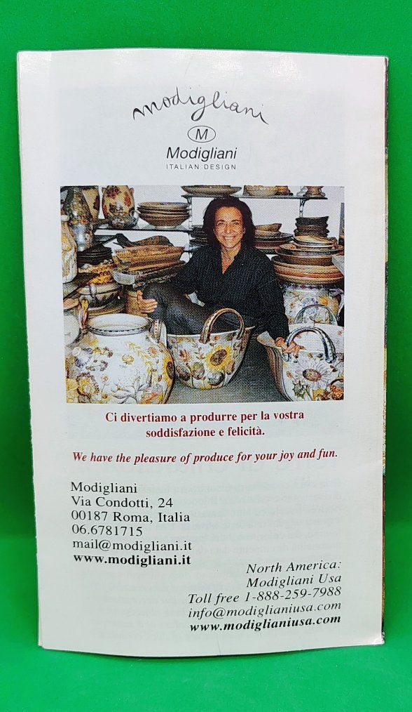 This ceramic plate appears to be part of the Terra Fiorita collection by the Italian artisan ceramics brand Modigliani.Design DetailsThe plate features a hand-painted floral design with vibrant orange, red, and yellow blossoms. The style is characteristic of Modigliani's work, which often utilizes a "stippled" or textured painting technique and whimsical, squiggly stems.About the BrandModigliani is a renowned Italian brand specialized in handmade and hand-painted ceramics.Origin: The company is based in Italy, with notable presence in Rome (Via Condotti).Craftsmanship: Their pieces are entirely handmade by Italian artisans, making each piece unique.Other Notable Collections: In addition to floral patterns like "Terra Fiorita," they are well-known for fruit-themed collections such as Frutta Laccata. Dimensions (inches): Approximately L 15 3/16, W 14 7/8