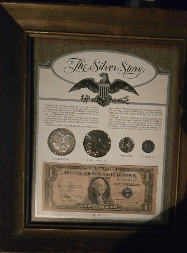 VenmoFrame SILVER STORY 1896 SILVER dollar SILVER granules 1944 war time nickel 1964 dime 150 dollars