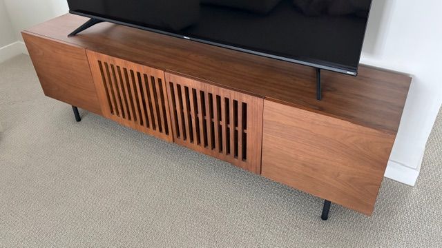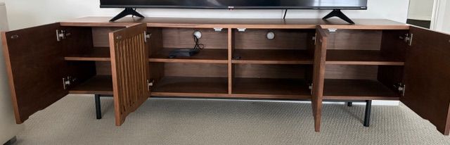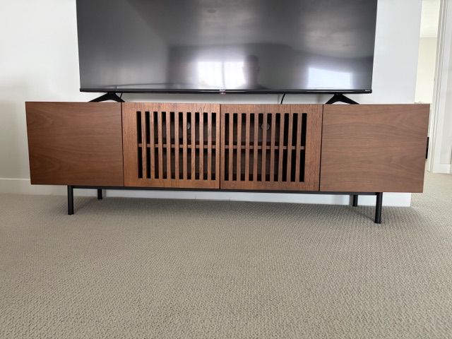 PayPalClean, modern TV stand in excellent condition. Walnut wood finish with slatted center cabinet doors and matte black metal legs — a mid-century modern aesthetic that works great in most living rooms. Asking $150.