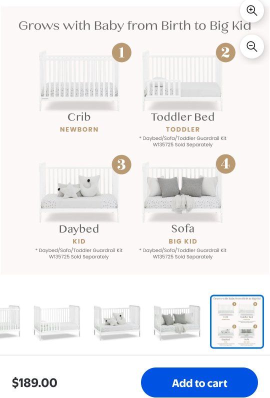 VenmoWhite Convertible Crib, the various ways of using it are shown in pictures. Sells for $190, Im asking $100. Brand new still in sealed box