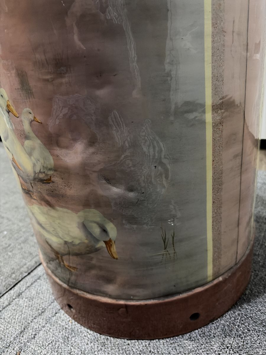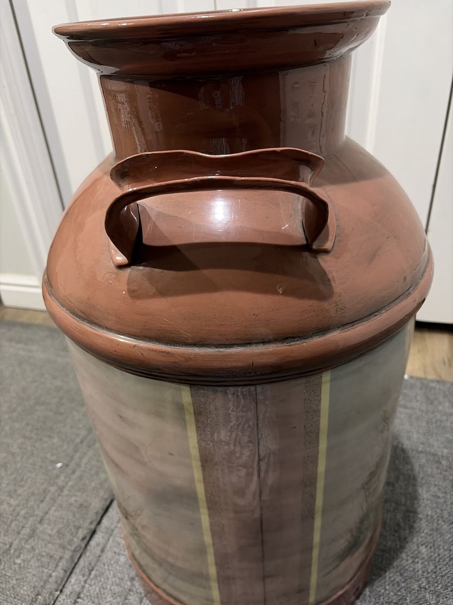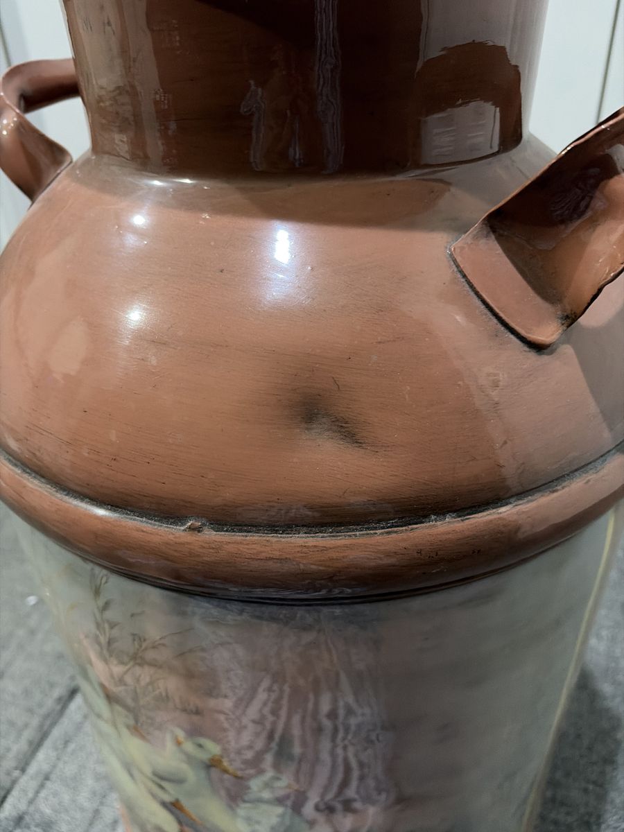 Darling milk jug. (!Has three small dents in it shown in pictures) see all pictures. No rust!! It’s actually in good condition compared to most I see. 24 inches tall by 9 inches around in diameter around the opening. Has ducks all around. Cleaned. Smoke free/pet free house. Please see my other listings :) Thanks for looking :) NO CODES