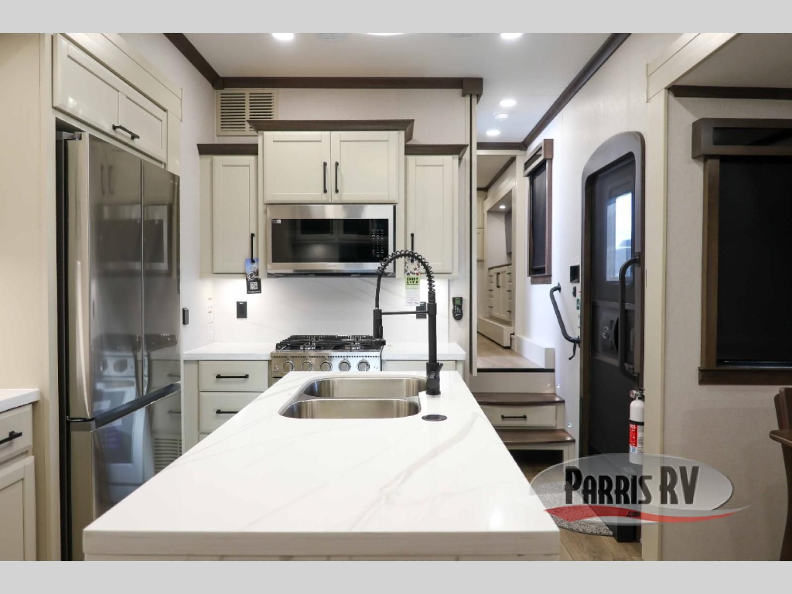 The Forest River RiverStone fifth wheels and toy haulers are luxurious units that have it all! You'll find an automatic six-point hydraulic level-up system to keep your unit in place, and there is preparation for a four-camera observation system. The TravlFi Journey XTR 4G/LTE router and WiFi extender will help you stay connected to the outside world, and you'll never have to overpack again since the Splendid "Astral" stackable washer and dryer will let you clean the small amount of clothes you've brought with you. Another high luxury is the Fischer Paykal dishwasher which will allow you to spend more time enjoying your camp life and less time cleaning up. Each unit is built with a LCI Road Armour suspension system, dual-pane frameless windows, a full docking station, a 200W solar panel, and a BMPro touch control system.