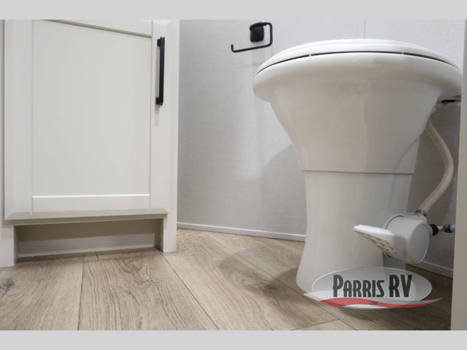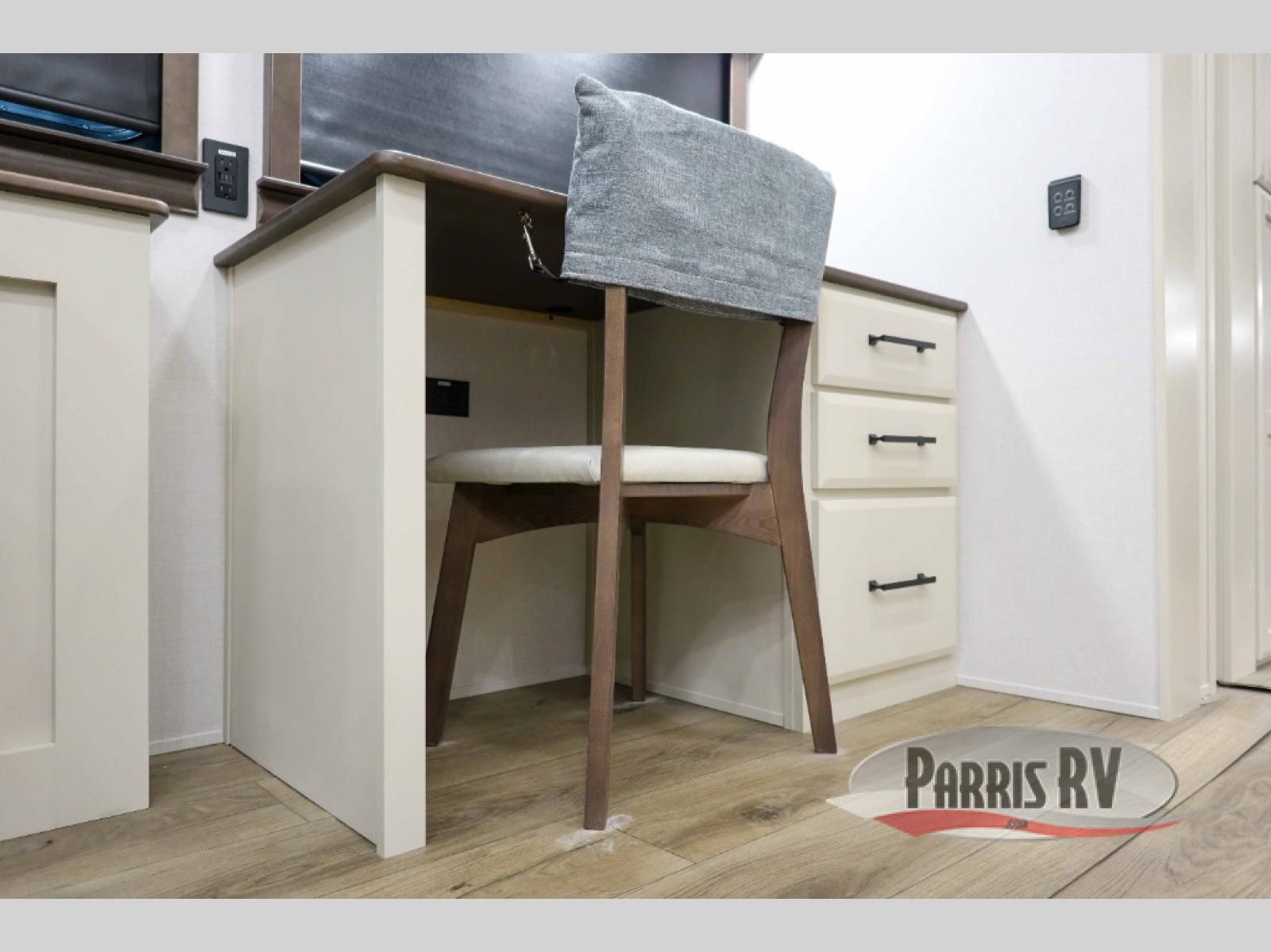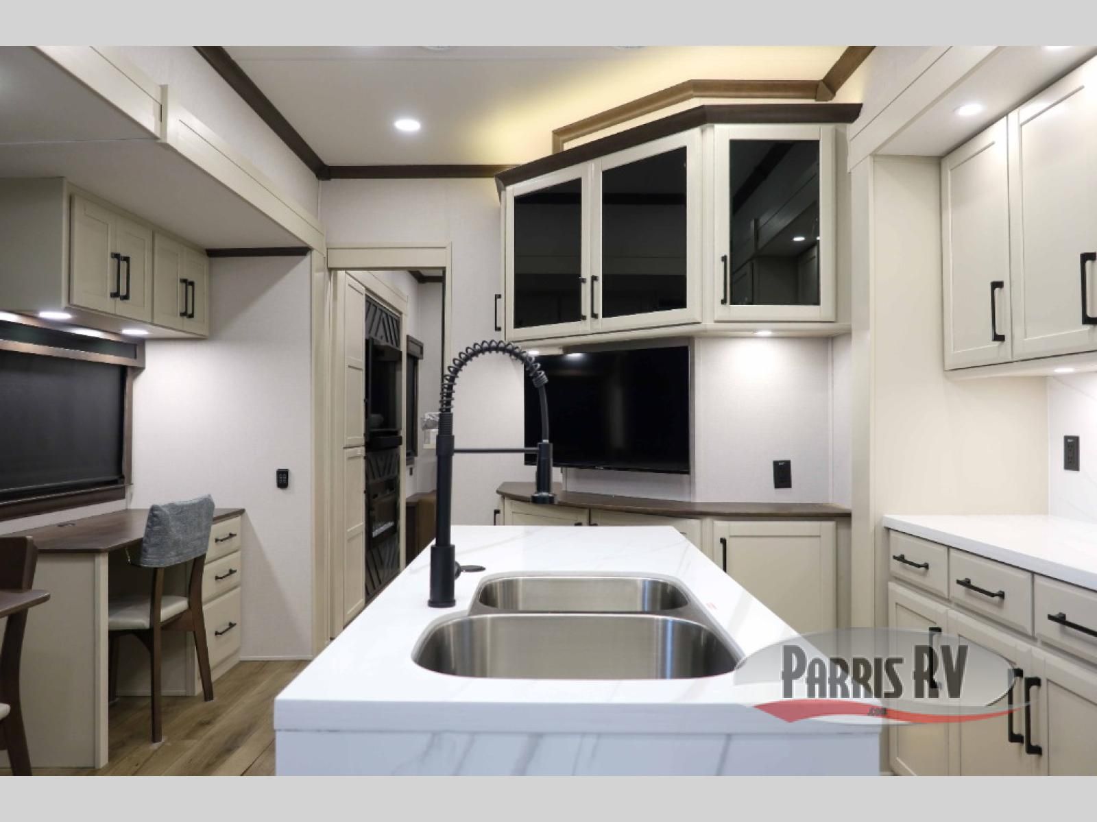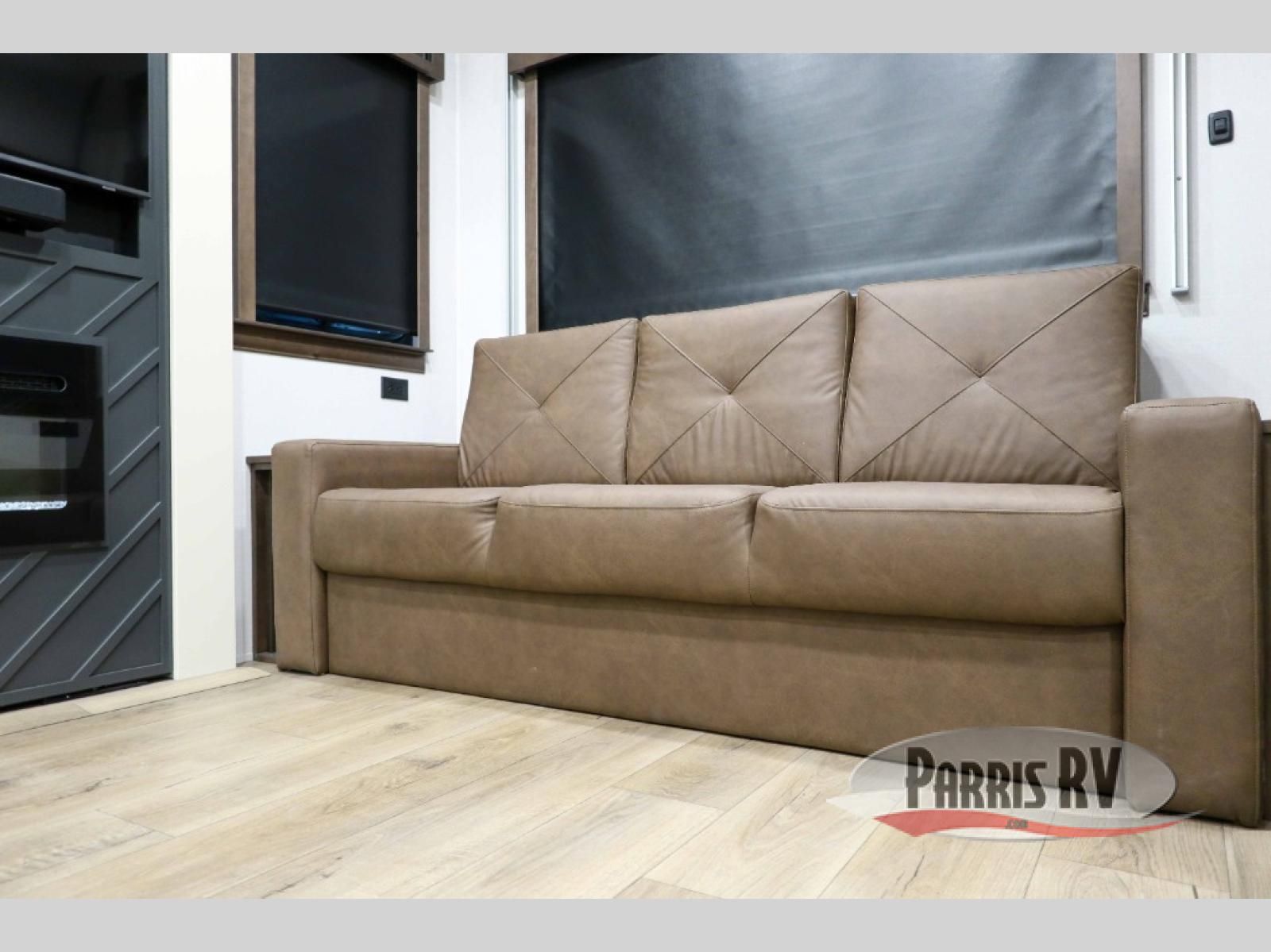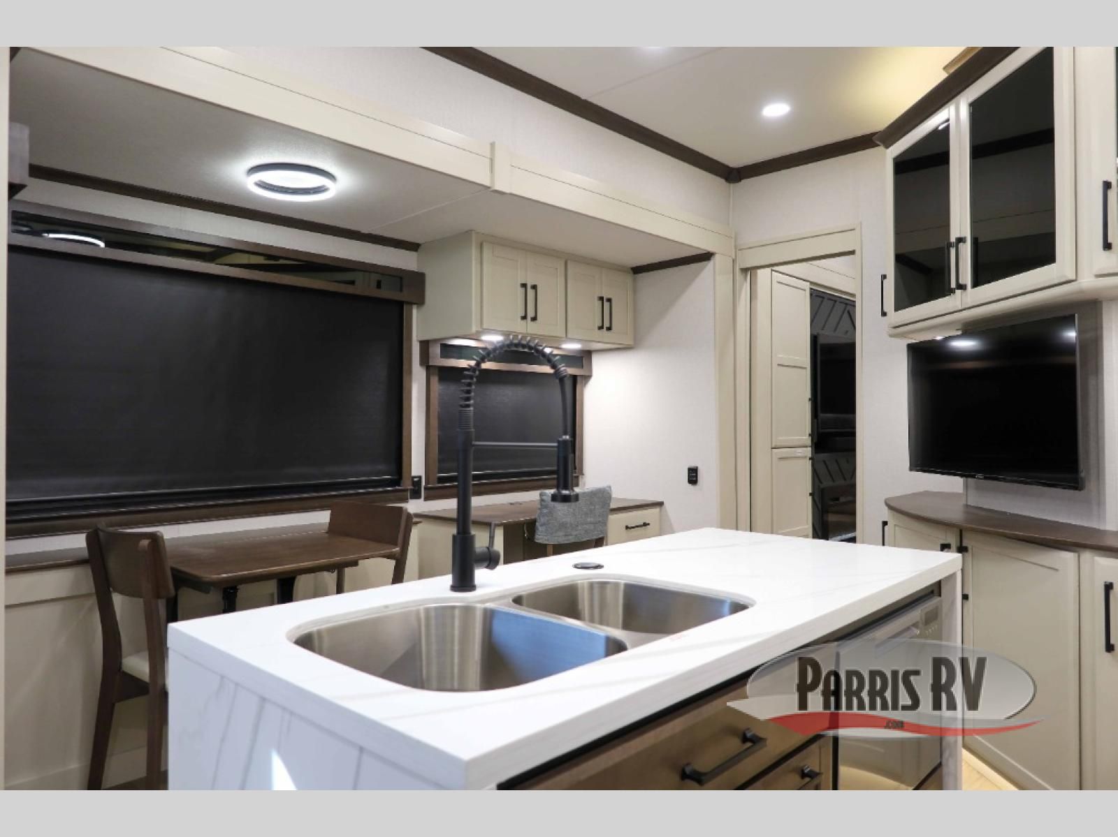 This RiverStone fifth wheel has an amazing den in the back! This area is not only an excellent lounging space with its theater sofa, hide-a-bed sofa, and entertainment center, but it is also a comfortable guest suite because it contains its own half bathroom and a drop-down queen bed. Each section of this unit has opposing slides, so you'll have plenty of living space, and the kitchen area has a pull-out dinette so that you can sit down with hot meals each night. You have a large pantry for snacks and an 18-cubic foot French door refrigerator with ice maker for cold beverages. The ceiling fan allows you to cool off the interior without overworking the AC, and the cordless vacuum will help you clean up messes.