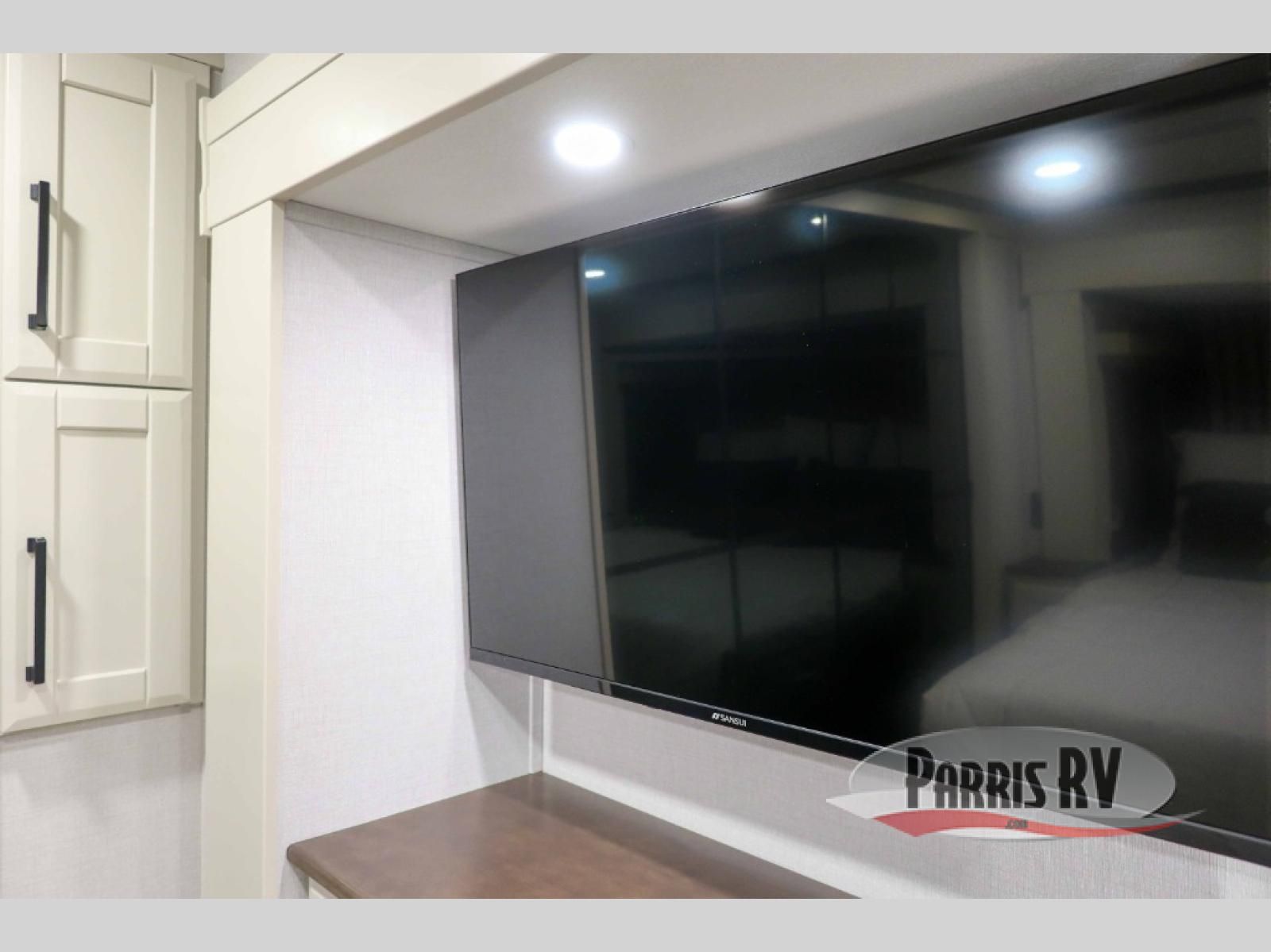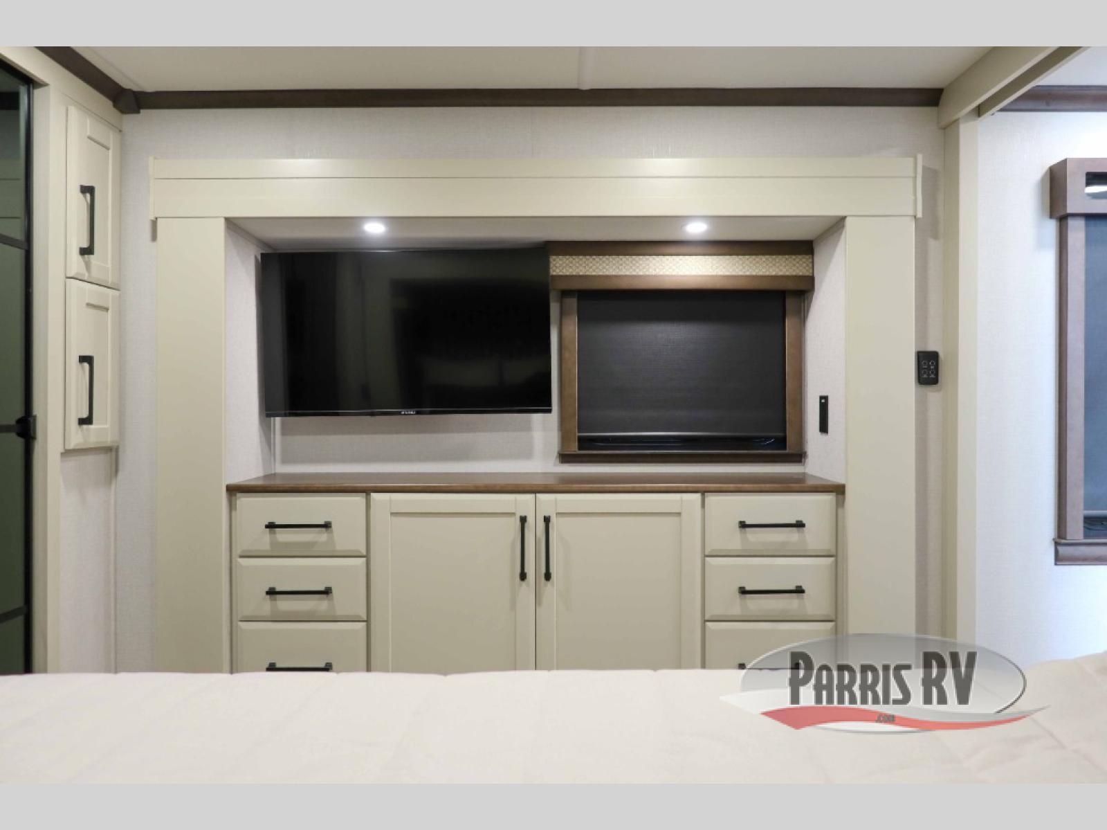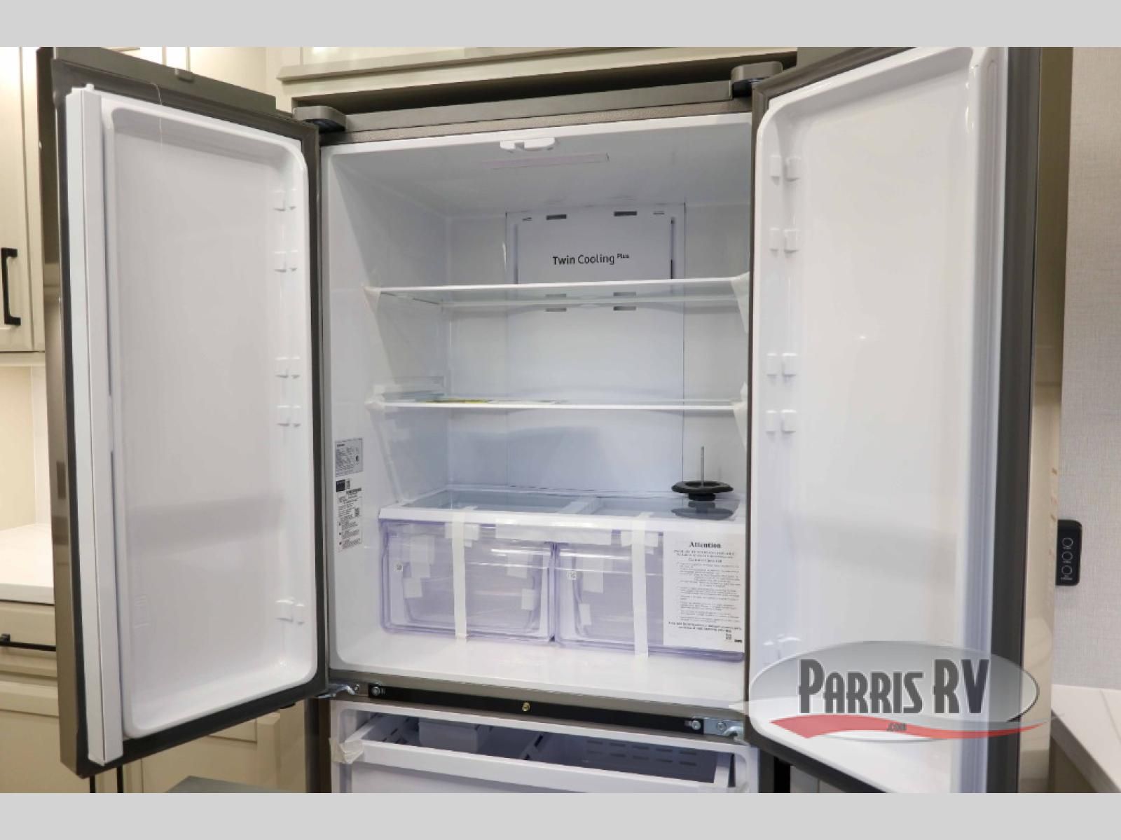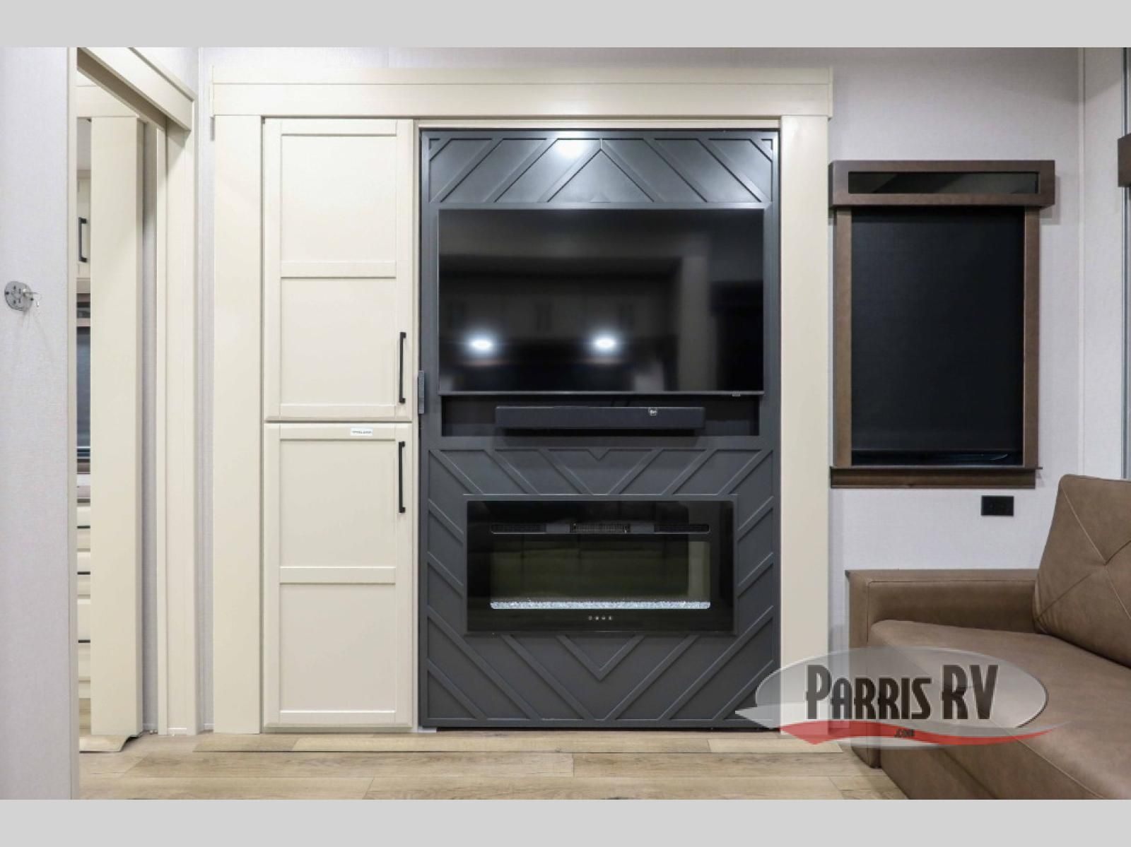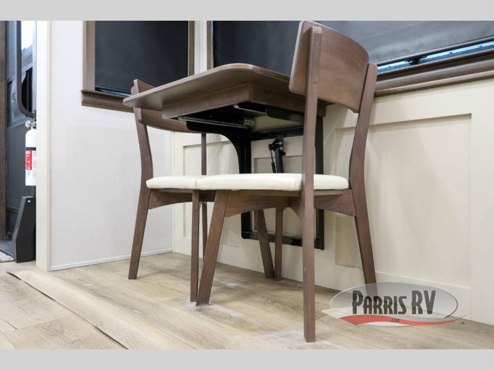 This RiverStone fifth wheel has an amazing den in the back! This area is not only an excellent lounging space with its theater sofa, hide-a-bed sofa, and entertainment center, but it is also a comfortable guest suite because it contains its own half bathroom and a drop-down queen bed. Each section of this unit has opposing slides, so you'll have plenty of living space, and the kitchen area has a pull-out dinette so that you can sit down with hot meals each night. You have a large pantry for snacks and an 18-cubic foot French door refrigerator with ice maker for cold beverages. The ceiling fan allows you to cool off the interior without overworking the AC, and the cordless vacuum will help you clean up messes.