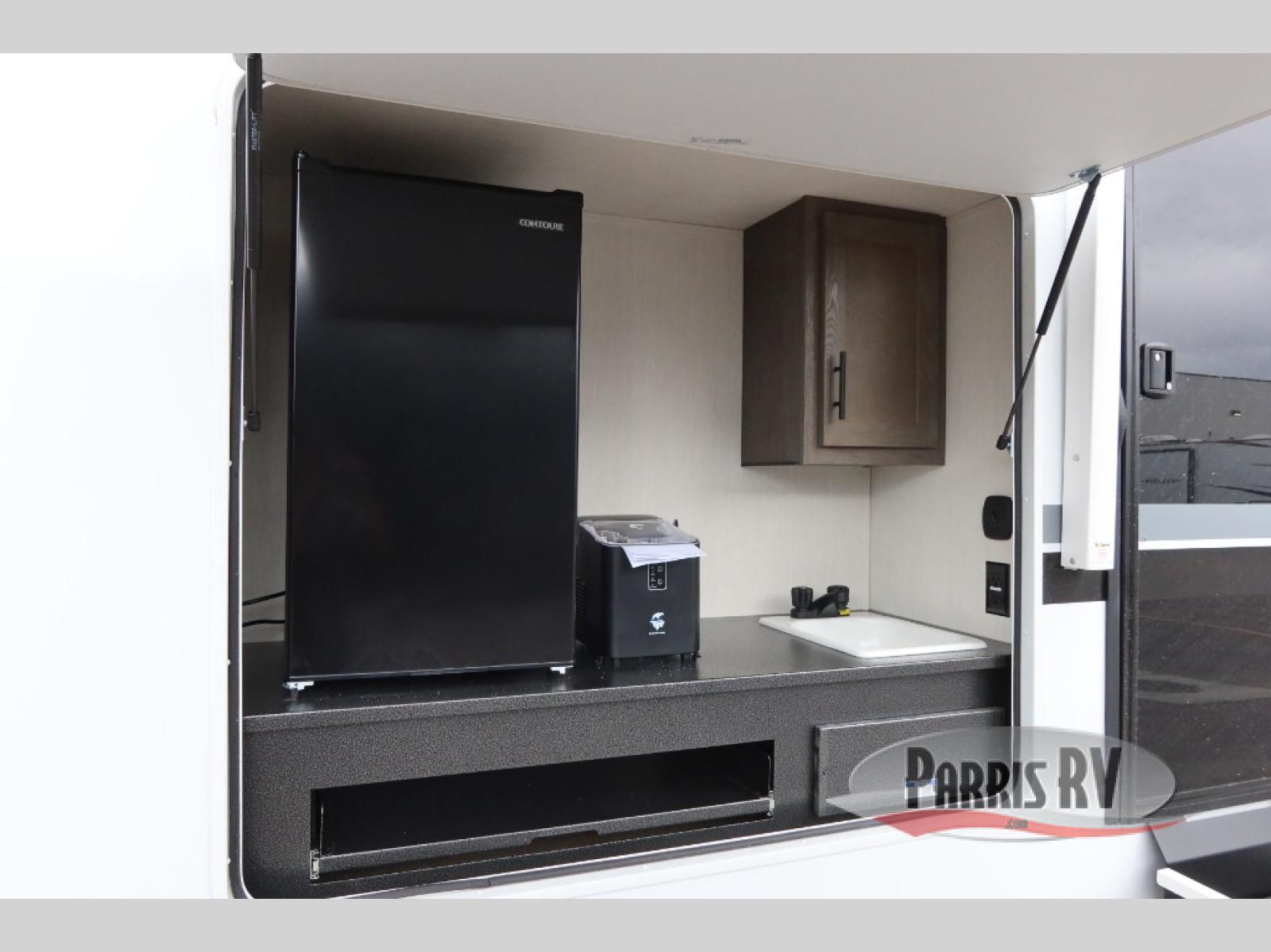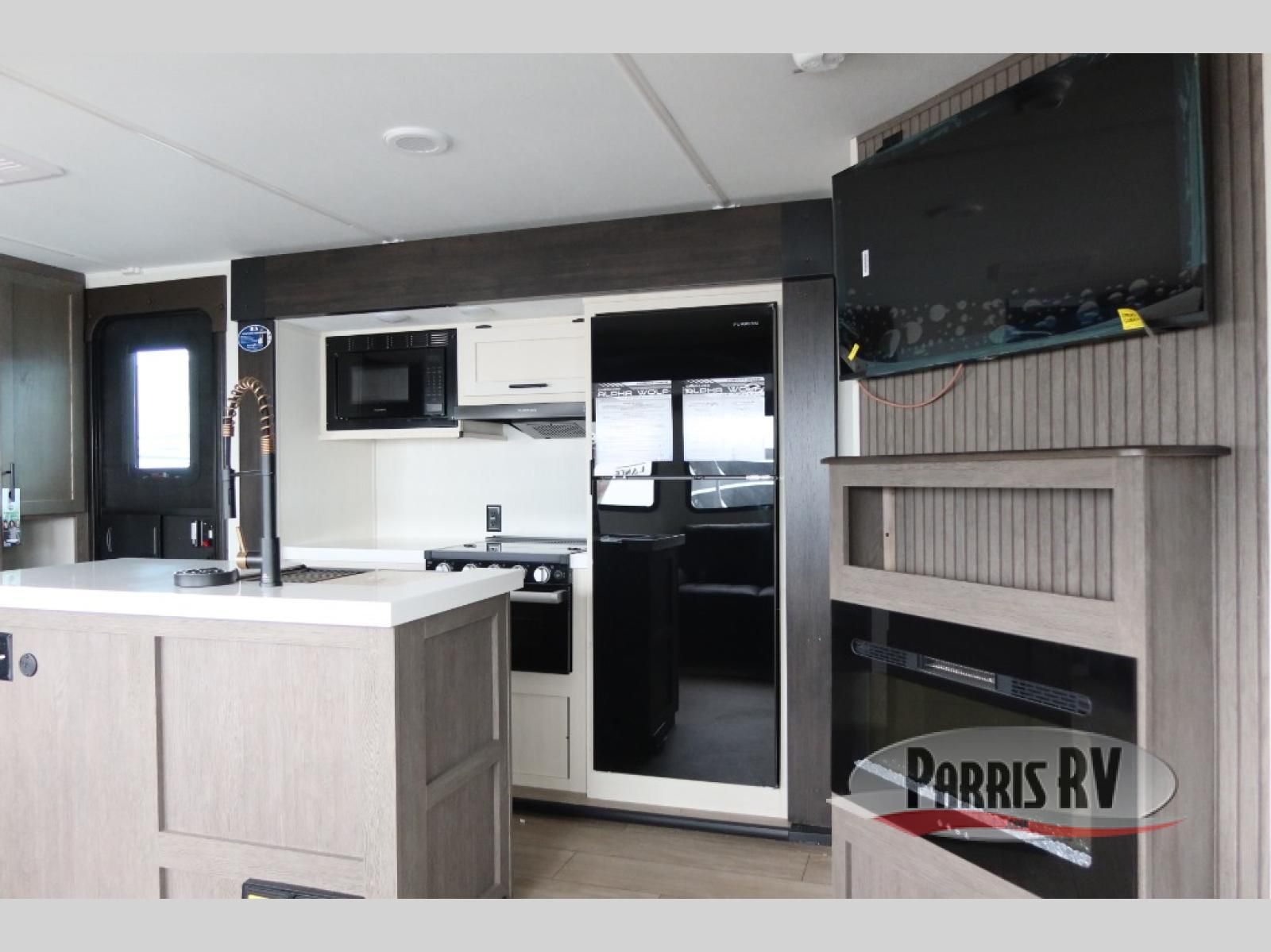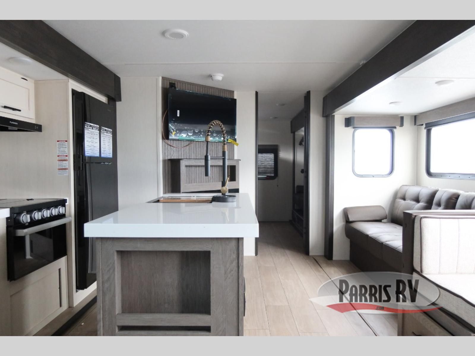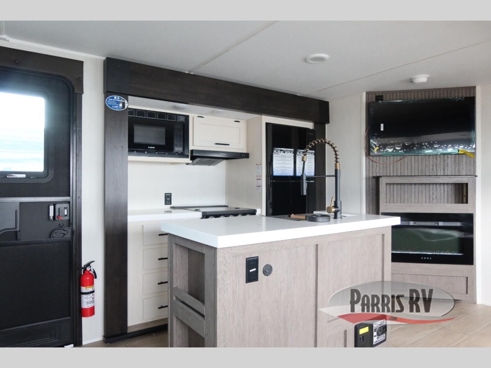 Load up your clothes, food, and outdoor gear to enjoy a long weekend away from the city in this travel trailer! There are triple slide outs, a private bunkhouse with a half bathroom with a second exterior entry/door for convenience, plus an outside kitchen! The bunkhouse also has two bunks, a jackknife sofa and a trundle bed, plus a slide out for more interior floor space. The main living and kitchen area is spacious as well with two opposing slides, a kitchen island with a large sink, a pantry, plus a cozy fireplace. The full walk-through bathroom allows double access, and the front bedroom allows you to sleep like royalty.