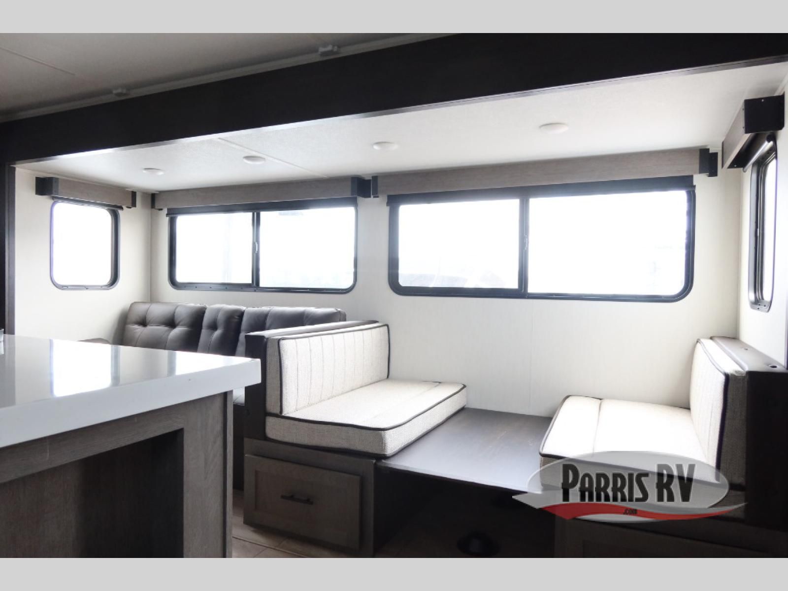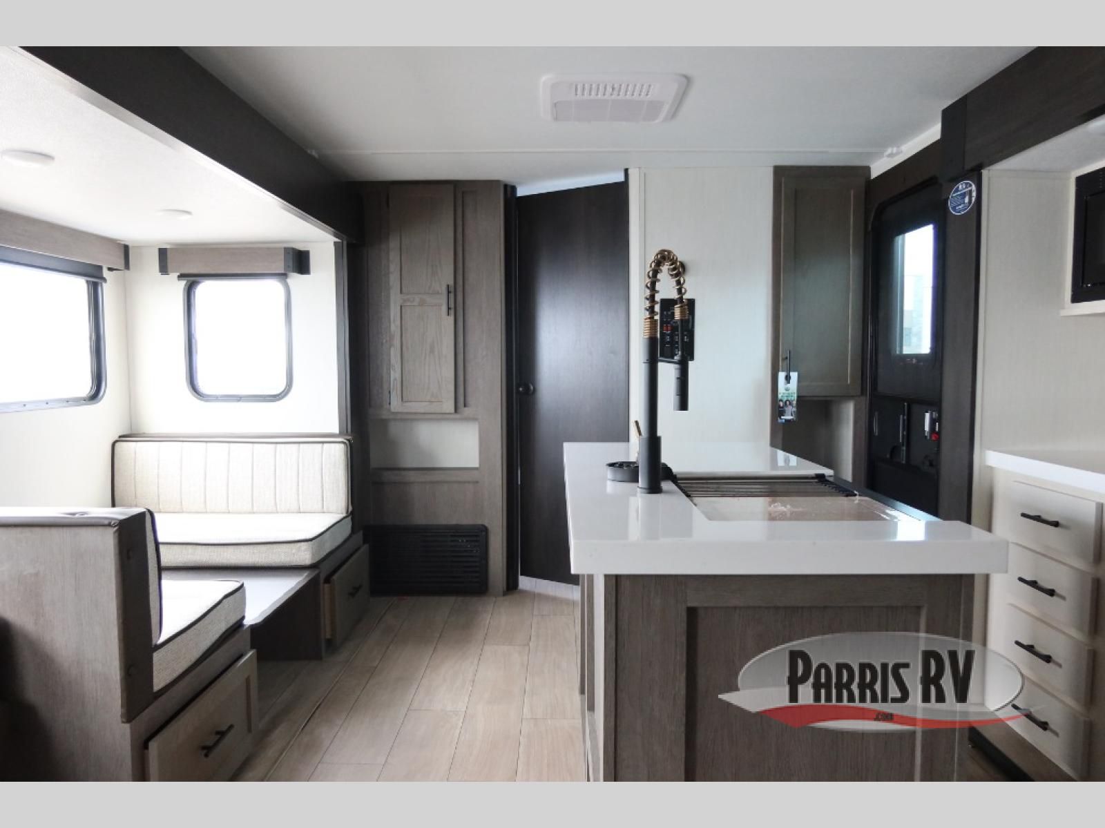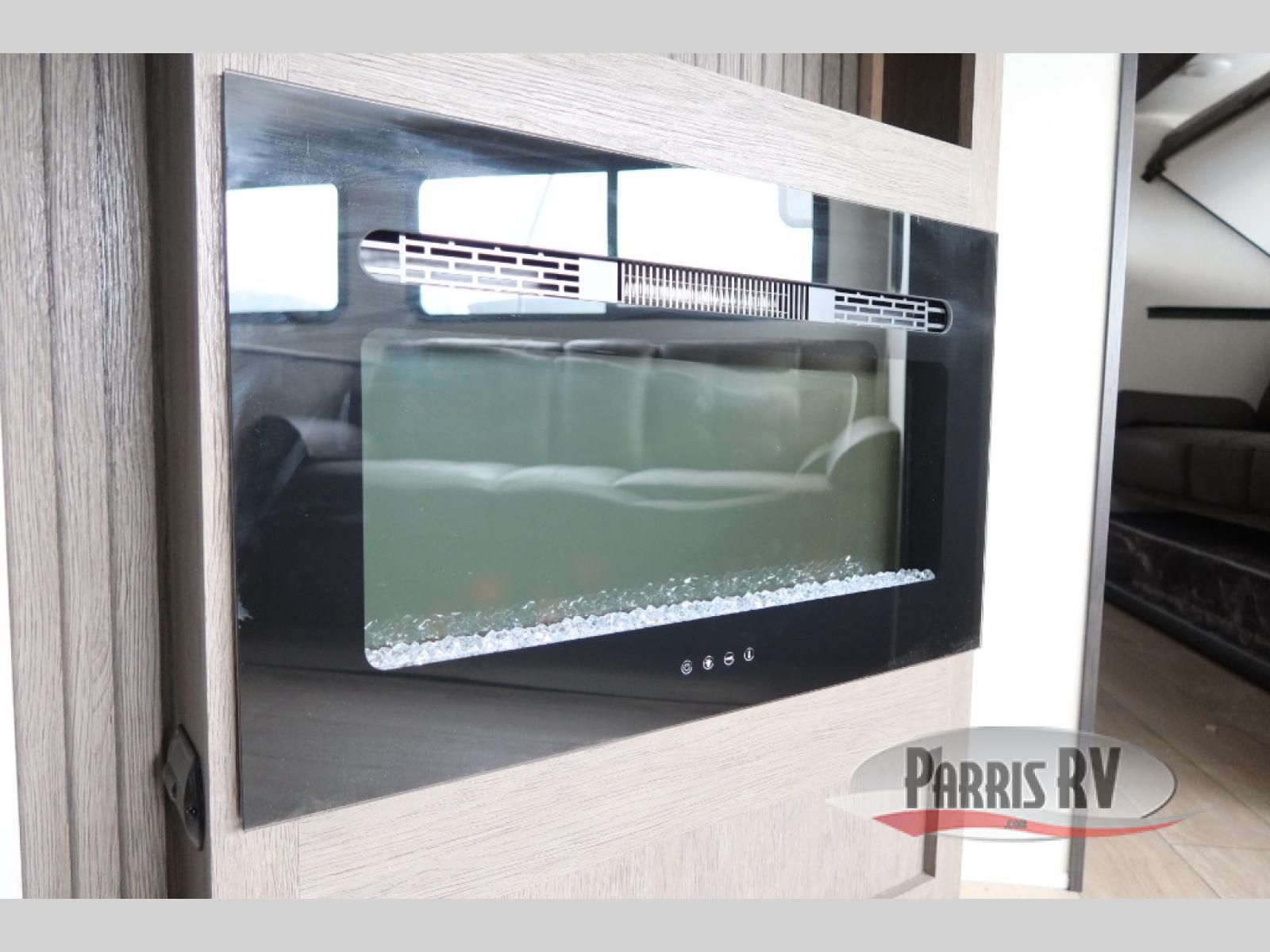 Load up your clothes, food, and outdoor gear to enjoy a long weekend away from the city in this travel trailer! There are triple slide outs, a private bunkhouse with a half bathroom with a second exterior entry/door for convenience, plus an outside kitchen! The bunkhouse also has two bunks, a jackknife sofa and a trundle bed, plus a slide out for more interior floor space. The main living and kitchen area is spacious as well with two opposing slides, a kitchen island with a large sink, a pantry, plus a cozy fireplace. The full walk-through bathroom allows double access, and the front bedroom allows you to sleep like royalty.