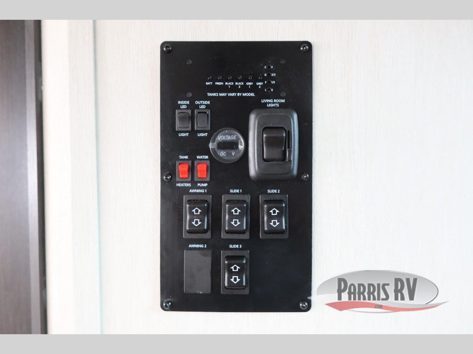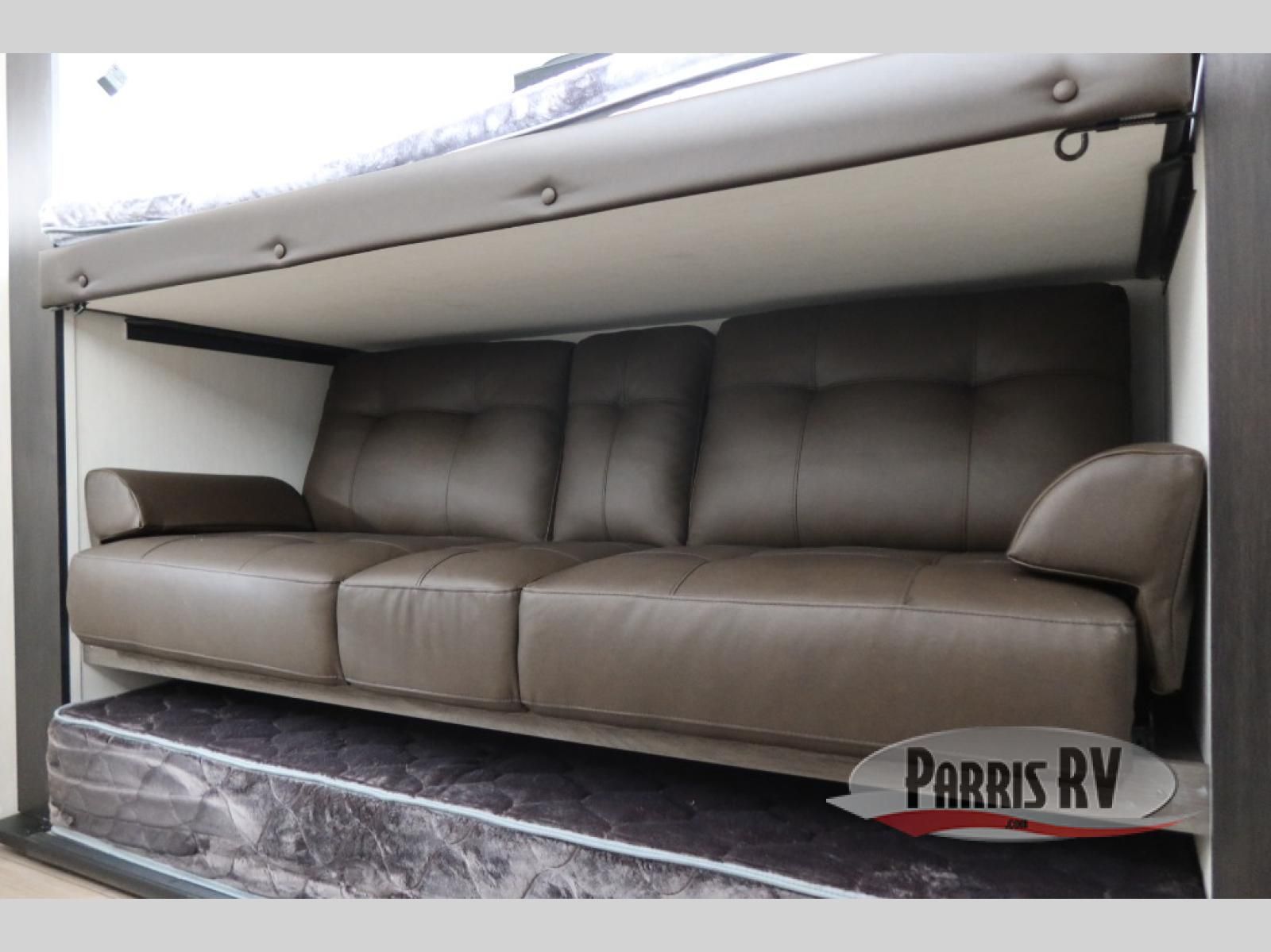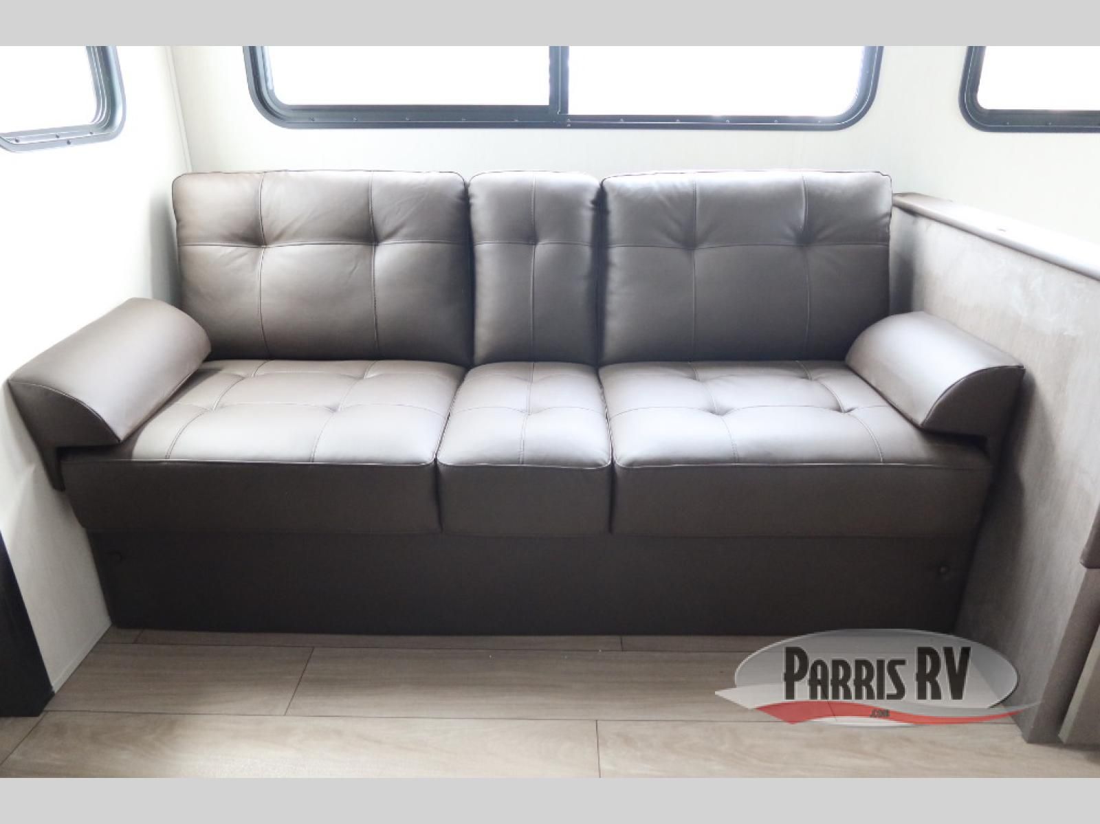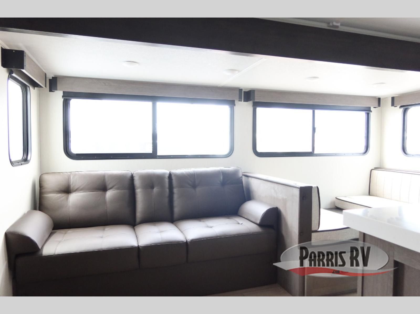 Load up your clothes, food, and outdoor gear to enjoy a long weekend away from the city in this travel trailer! There are triple slide outs, a private bunkhouse with a half bathroom with a second exterior entry/door for convenience, plus an outside kitchen! The bunkhouse also has two bunks, a jackknife sofa and a trundle bed, plus a slide out for more interior floor space. The main living and kitchen area is spacious as well with two opposing slides, a kitchen island with a large sink, a pantry, plus a cozy fireplace. The full walk-through bathroom allows double access, and the front bedroom allows you to sleep like royalty.