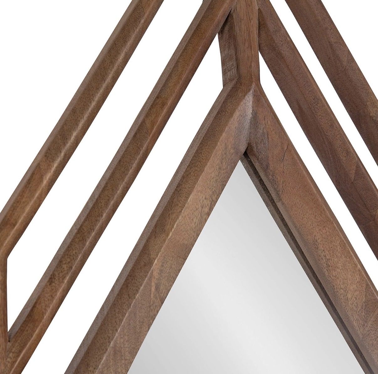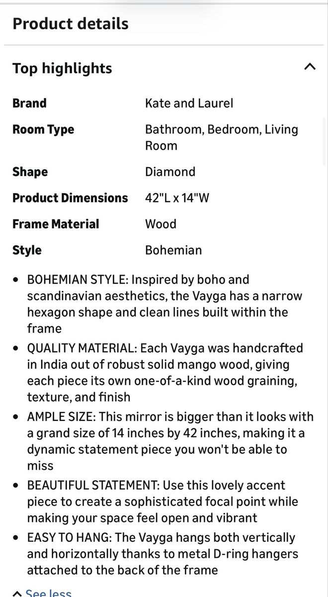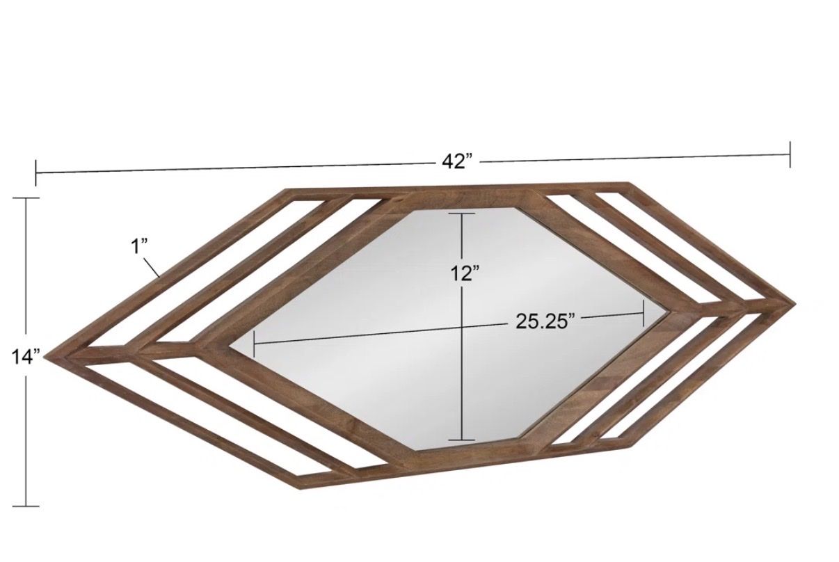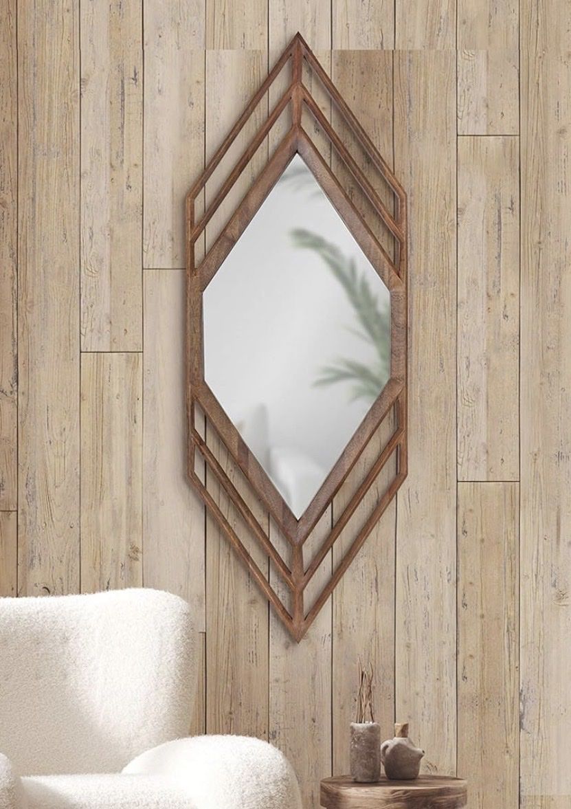 The Vayga wall mirror is a sophisticated accent piece to add to any room of your home. Inspired by both bohemian and Scandinavian aesthetics, the Vayga mirror features a slim hexagon shape, utilizing the wooden slats within the frame to create an echo-like effect starting from the interior mirror glass. This wall mirror was handcrafted in India out of solid mango wood, giving it a one-of-a-kind quality in terms of wood grain, finish, and texture. Its slim hexagon shape is perfect for a narrow wall, with dimensions of 14 inches by 42 inches. The slim shape is great for a large wall, whether you showcase it on its own as a bold statement or in multiples for a grand display. Its tall size is perfect for creating a commanding focal point and boho presence while drawing in more light to make your space feel larger. The elegant Vayga wall mirror is fantastic in both vertical and horizontal orientations with convenient and no-hassle metal D-ring hangers attached to the back of the frame.