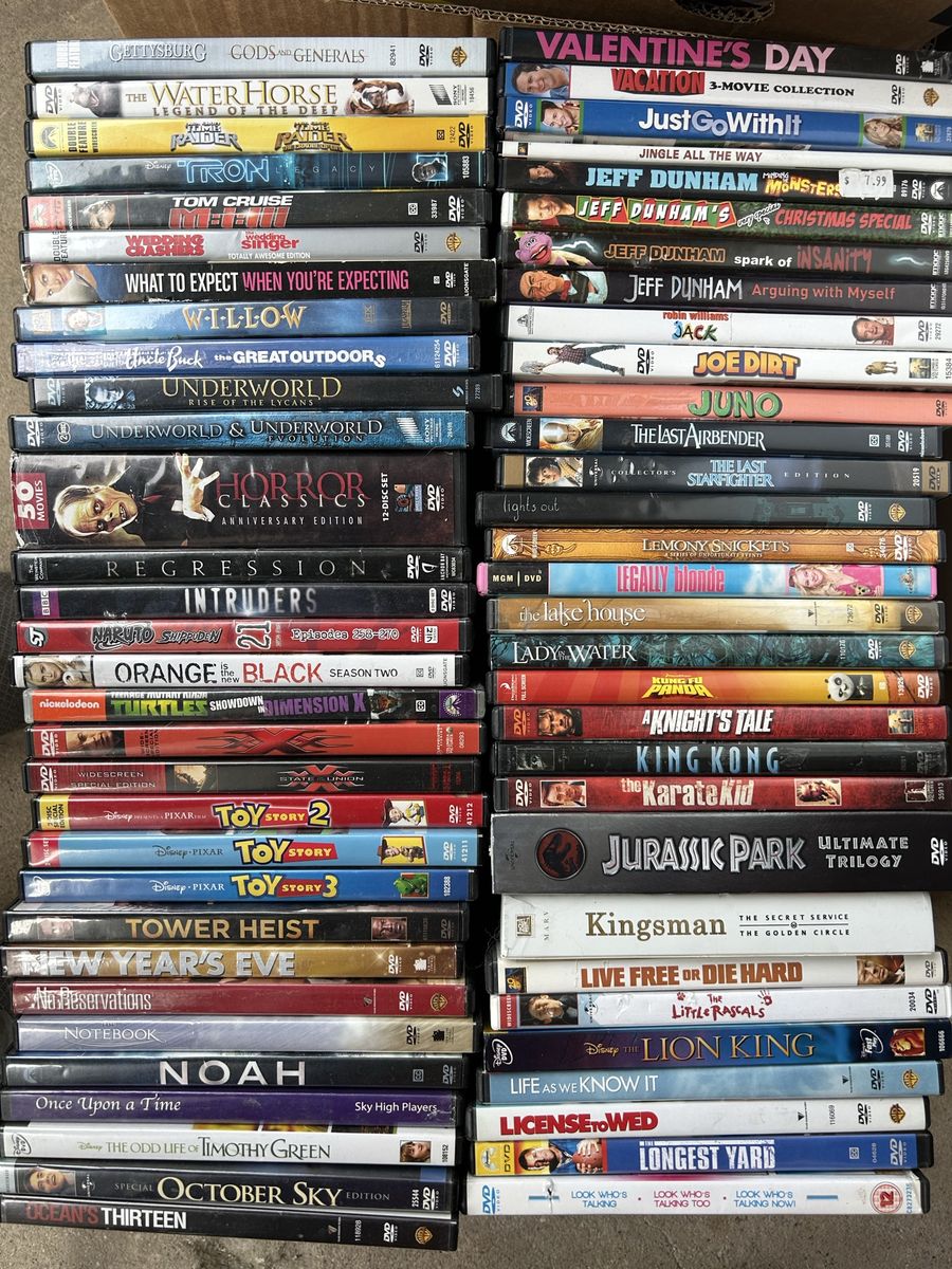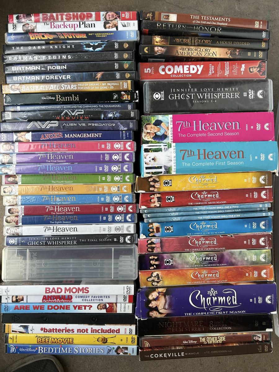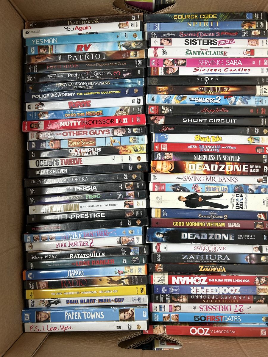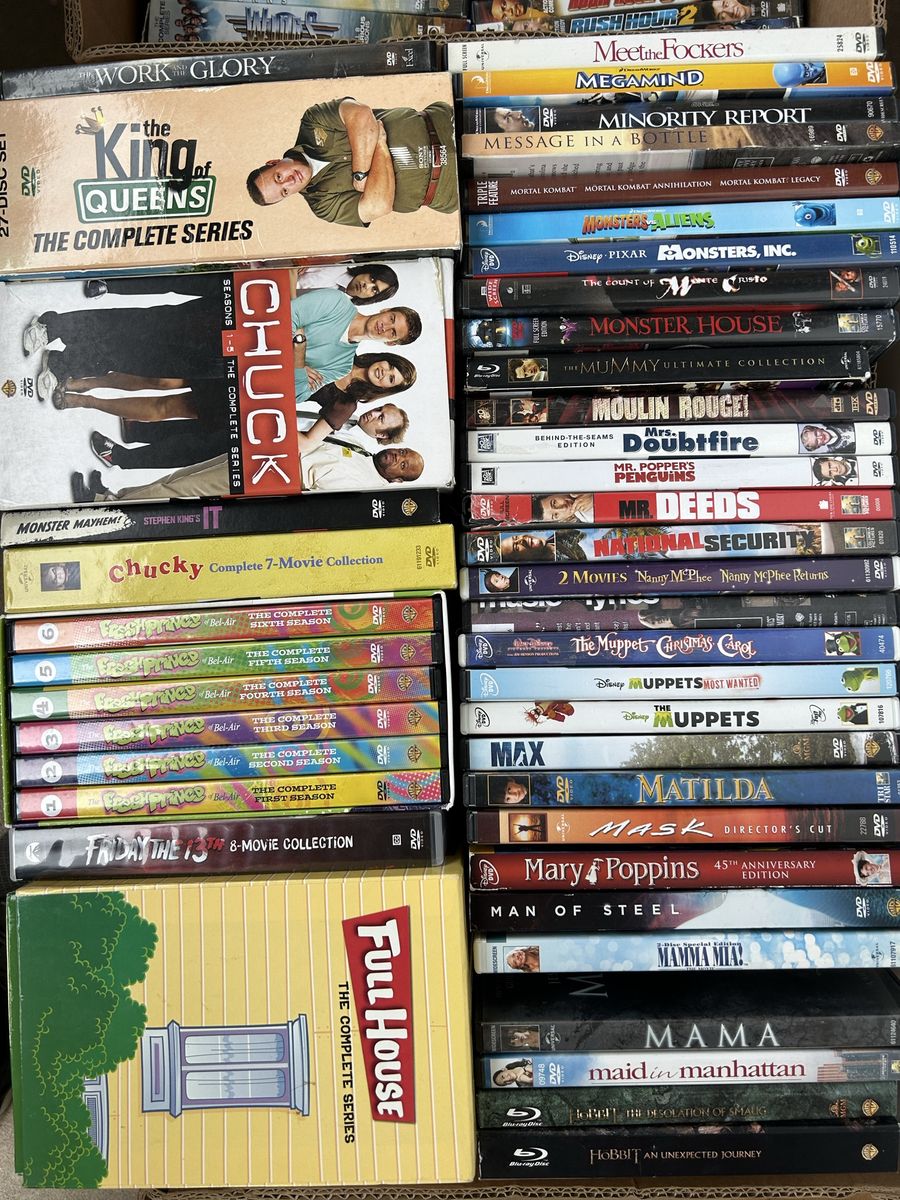 VenmoToo many to list, not selling them individually, must buy them all. Lot includes three and half banana boxes of movies, some are TV series and boxed sets that are counted as one dvd, see pictures for titles. Cash or Venmo only.