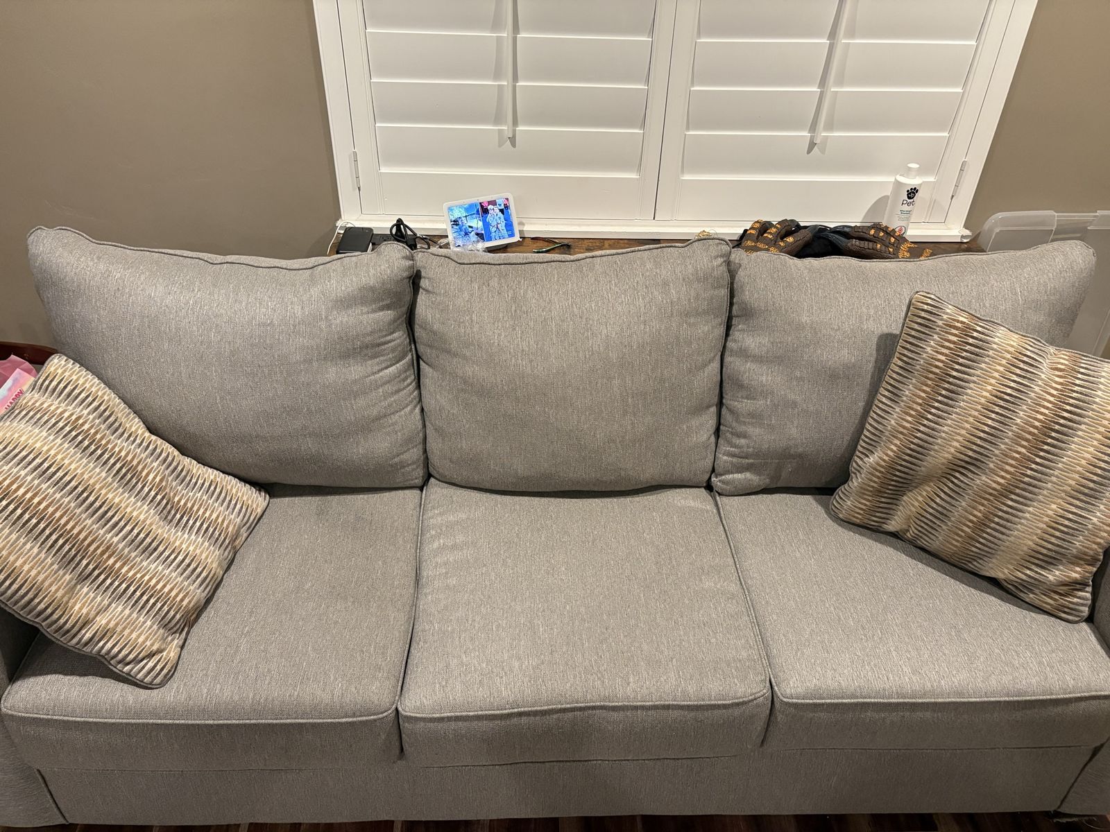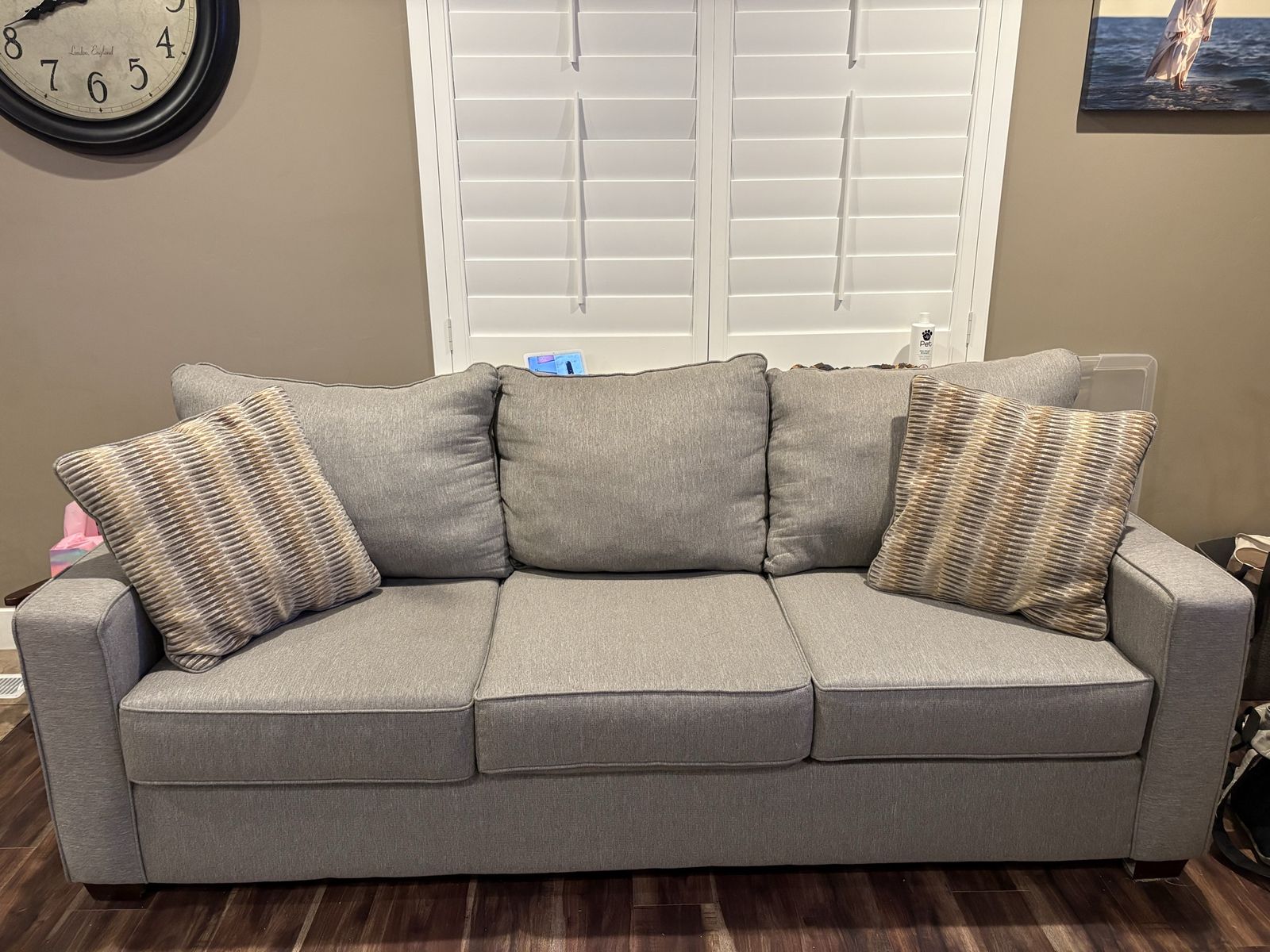PayPalWell taken care of and just recently steam cleaned. It is gray but more of a light gray. Comes with pillows. Measurements: 86”x39”x38”h. Price is not firm, but reasonable offers. Paid $1100.
