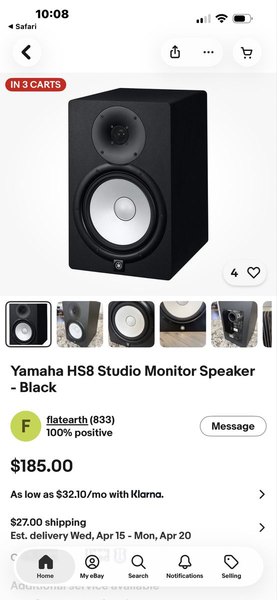 Yamaha hs8 studio monitor speaker in good working condition! These produce awesome sound! Comes as shown with power cord only!! This exact speaker is 185.00 for sale right now on eBay as shown in photos! don’t pay retail prices, call Dustin instead at 801-205-3404, I need it gone!