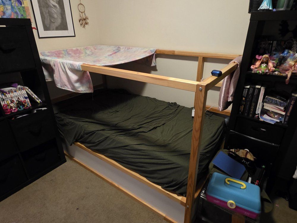 Venmoreversible Ikea loft bed. can be on the ground or a loft. it's a nice height for parents to still across as a loft. matress not included