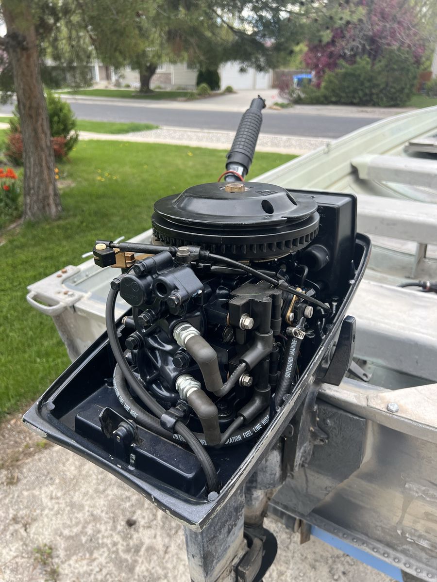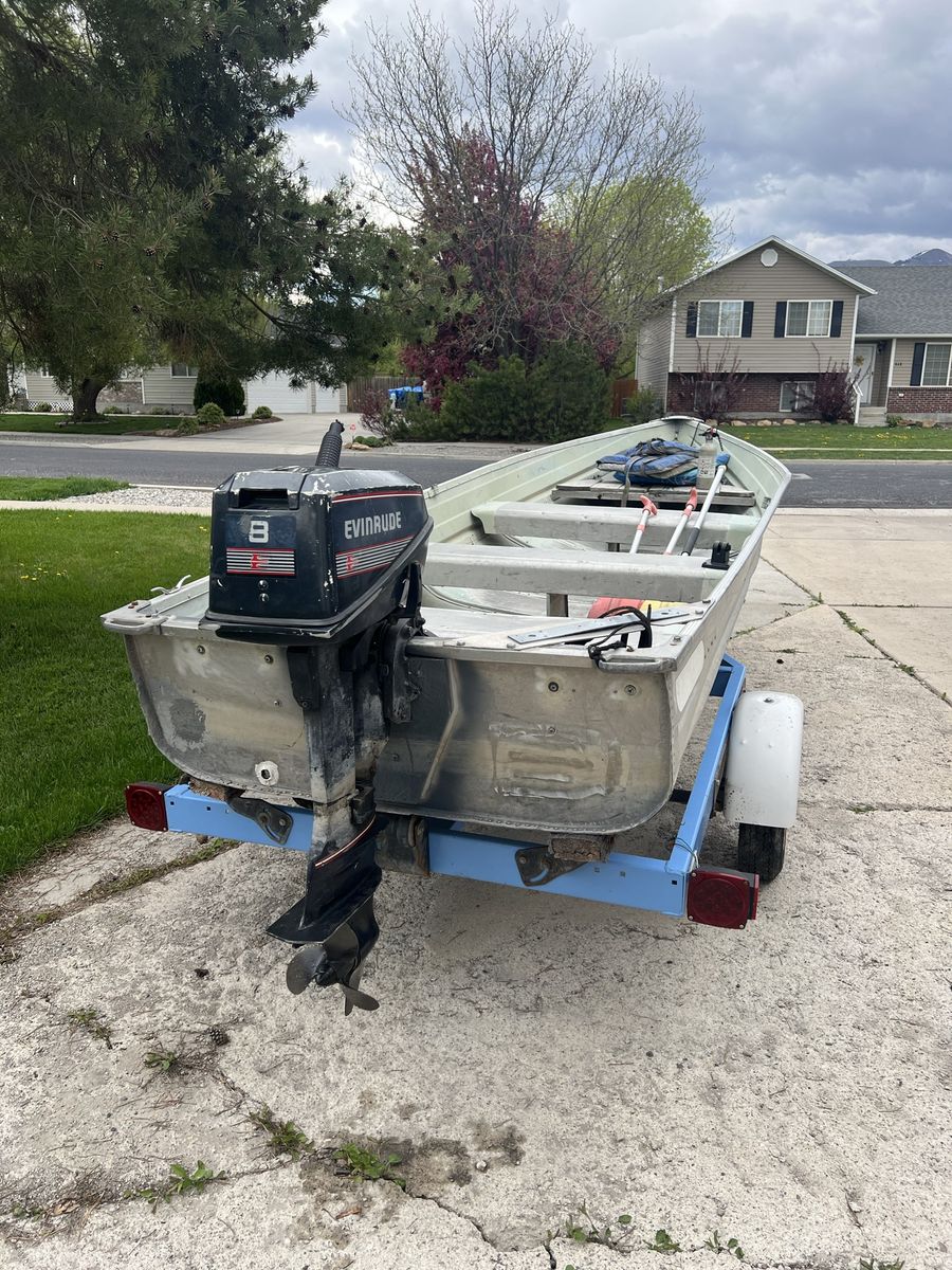 Powered by a 1989 Evinrude 8 HP outboard motor and a metal gas tank. Starts easily, runs strong, and has been well maintained. Extra parts will go with it also like trailer wheel hub and water pump for the motor.