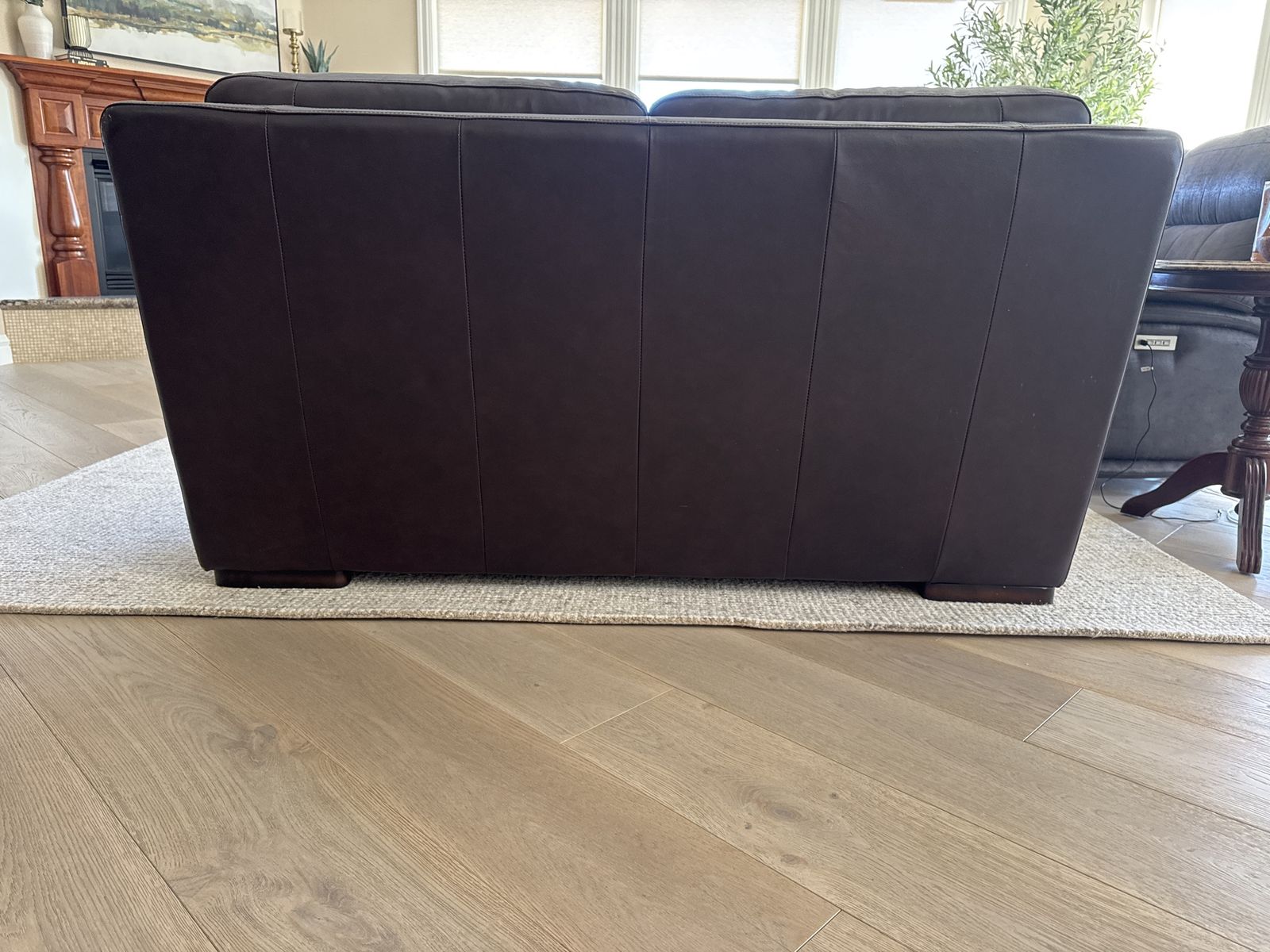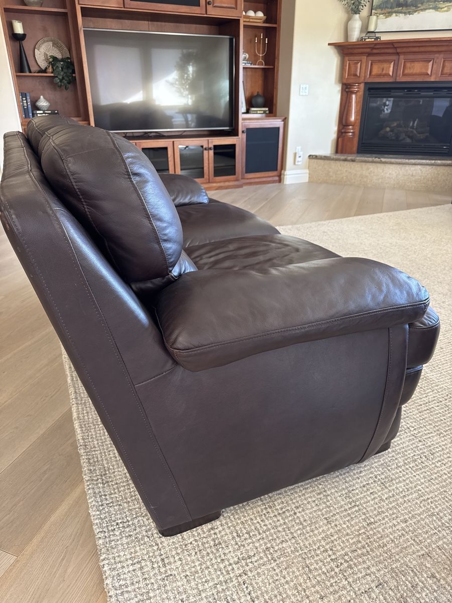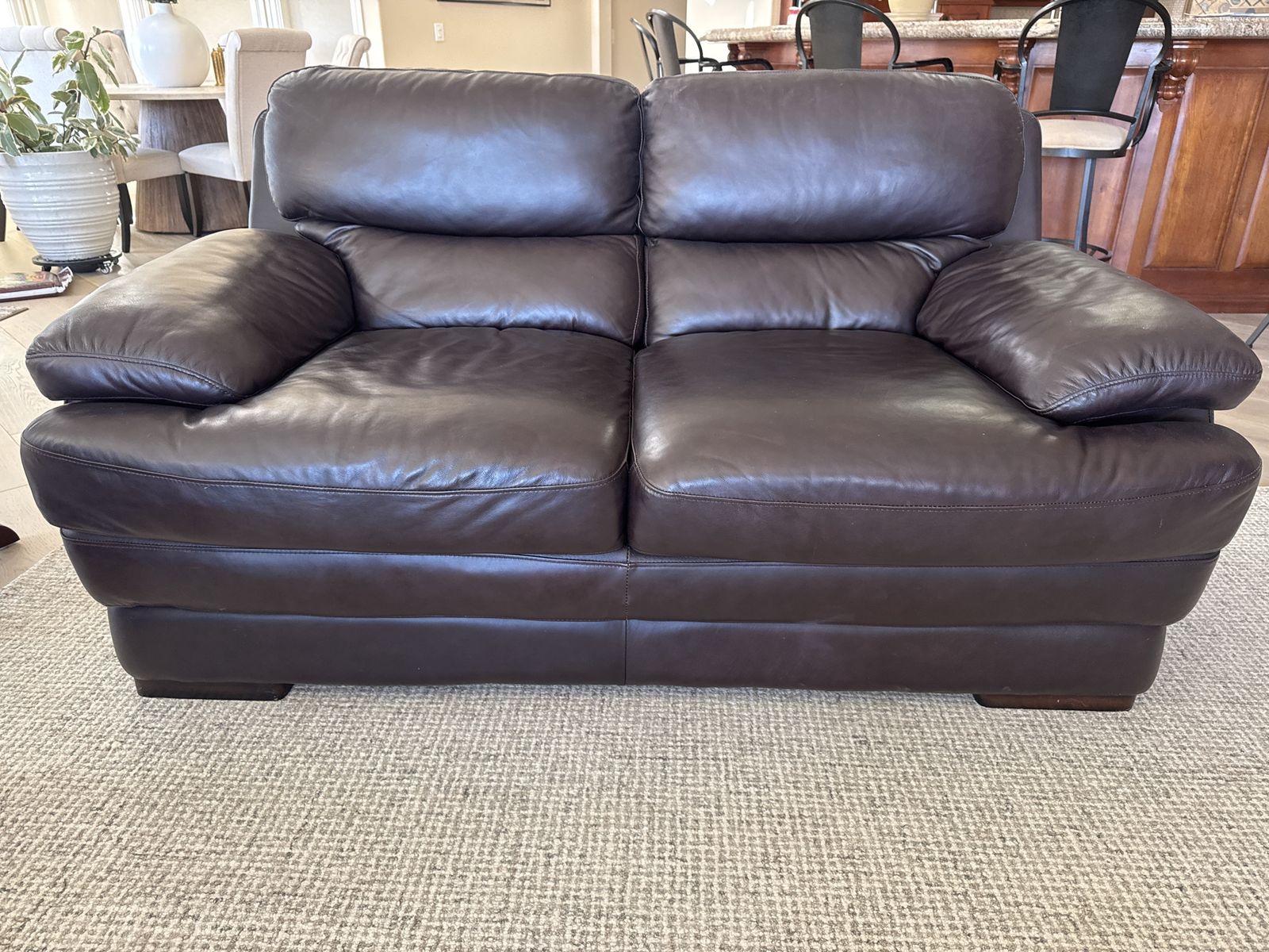 ZelleVery good condition brown leather loveseat. It is not real leather but looks like leather. Has deep seating and very comfortable. Very lightly used from pet free and smoke free home. Measures 6ft long and 3 1/2 feet deep.