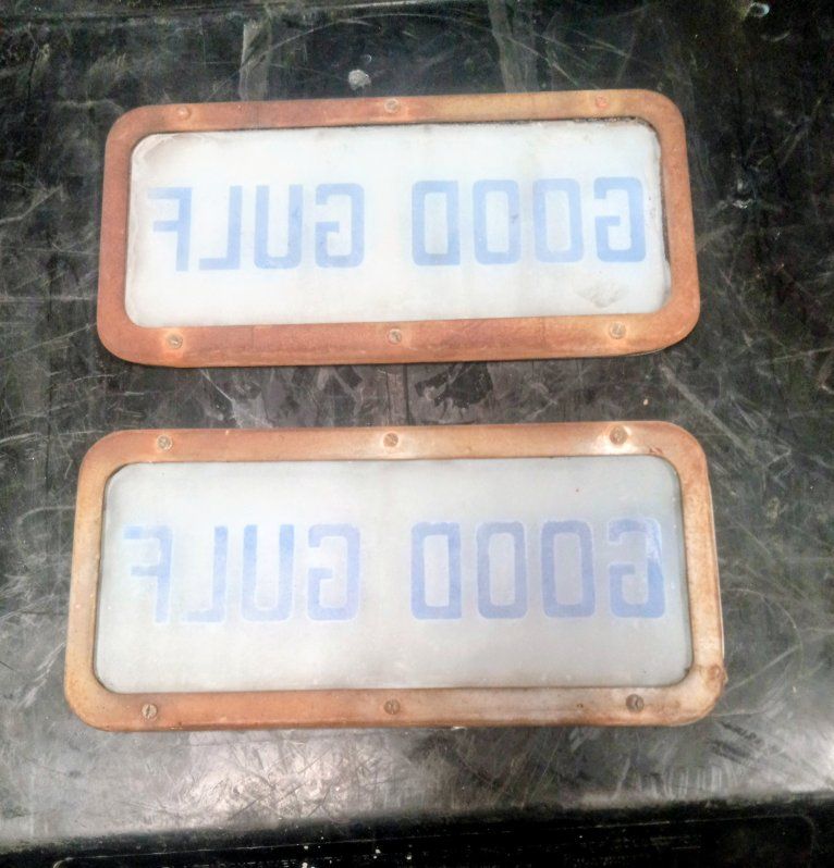 these came out of a Wayne 70. GOOD GULF Ad glass. with the stainless and retainers. 11 1/4 inches x5 1/4 inches outside measurement . Stainless needs to be straightened and polished. $175.00 cash.