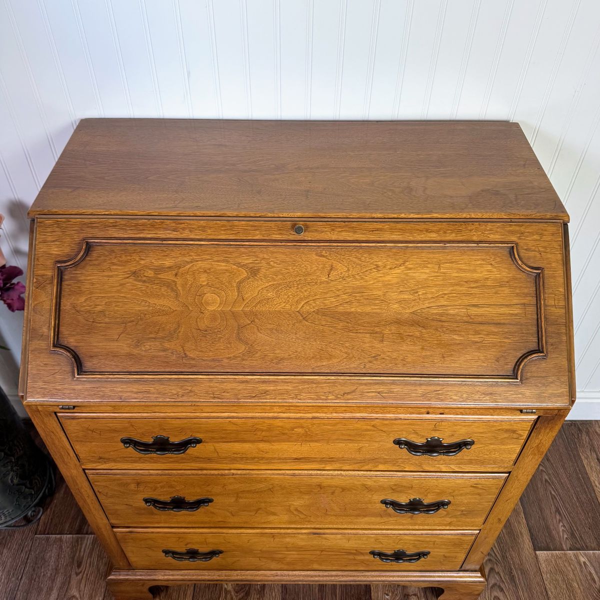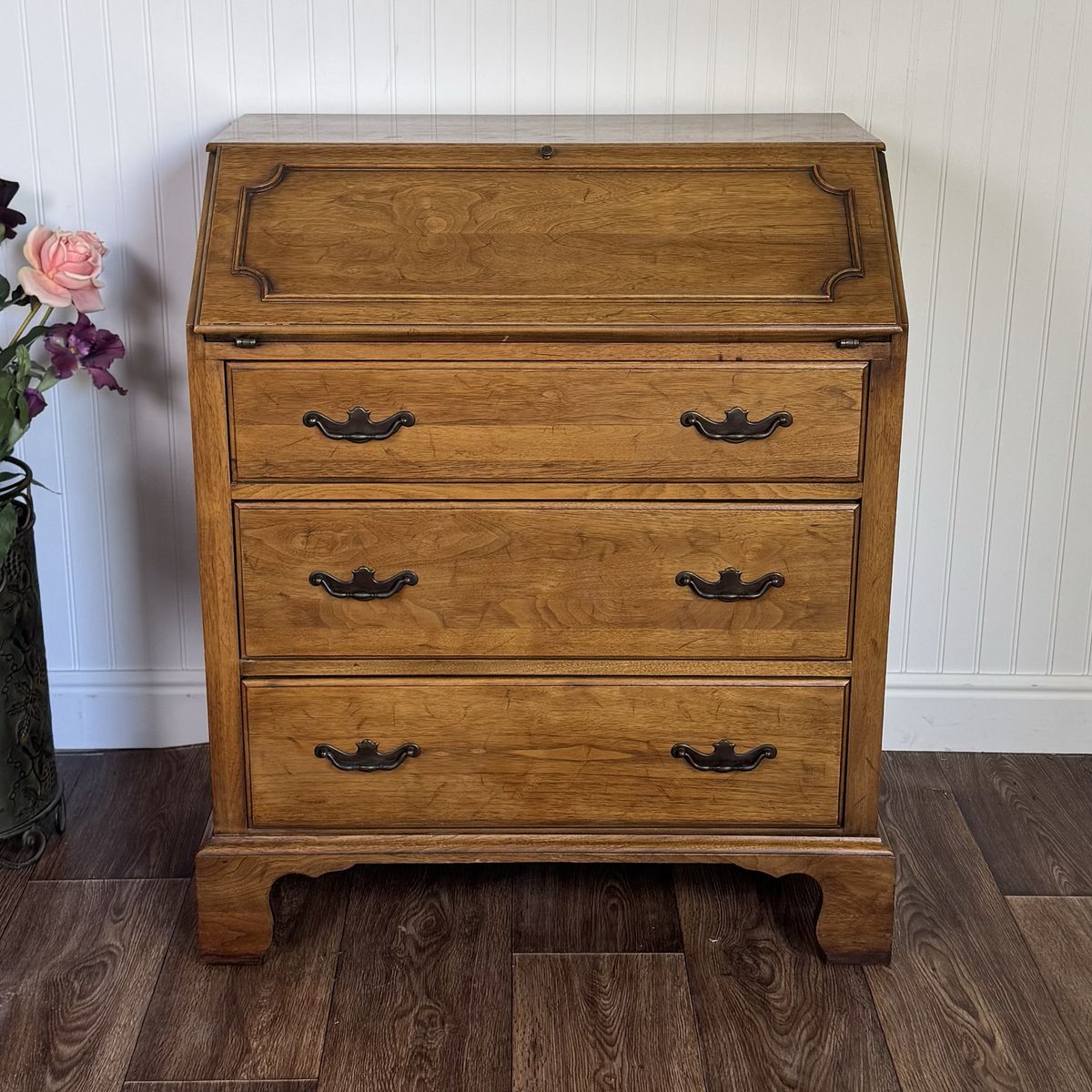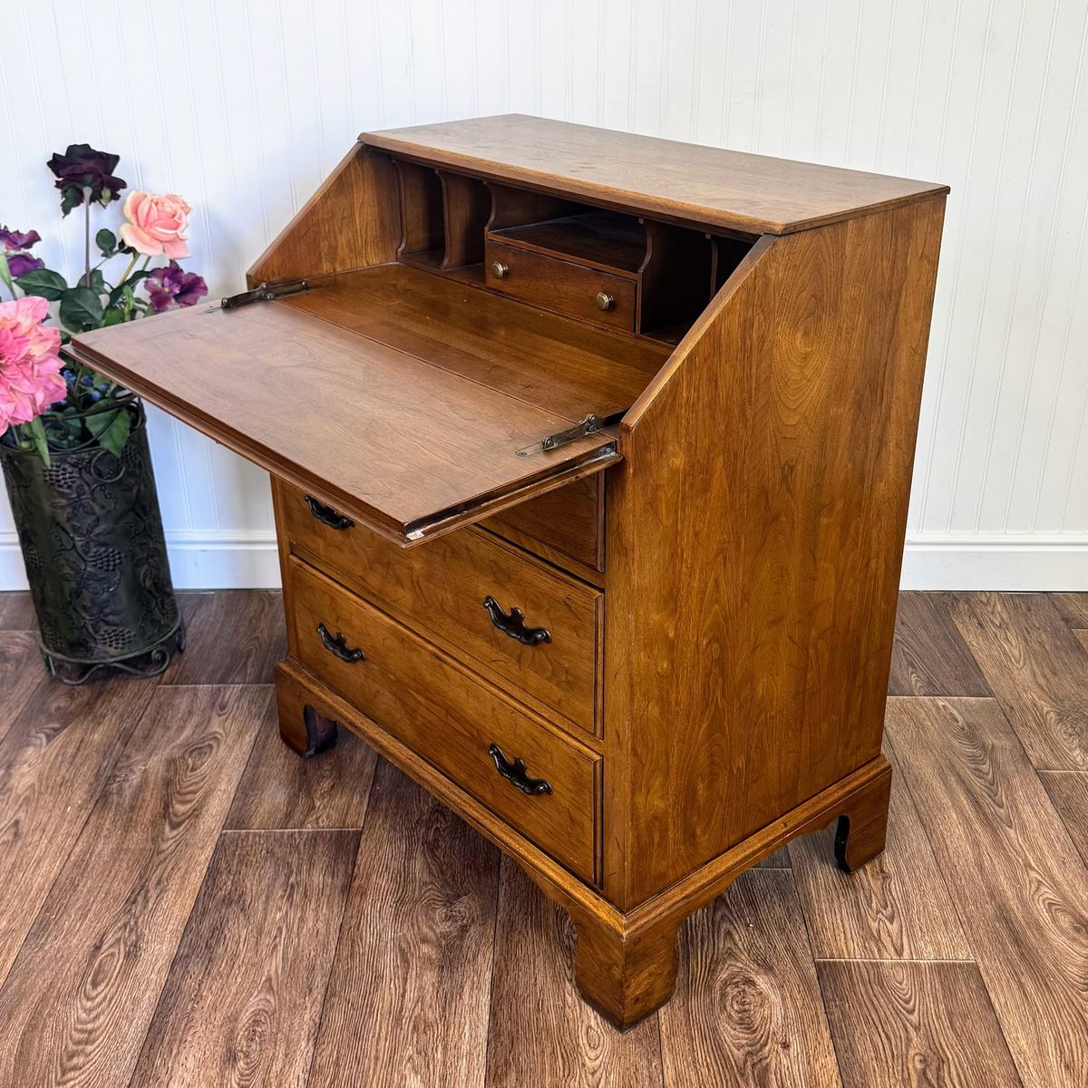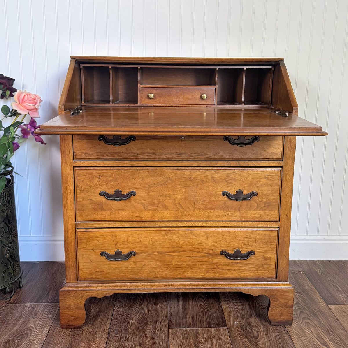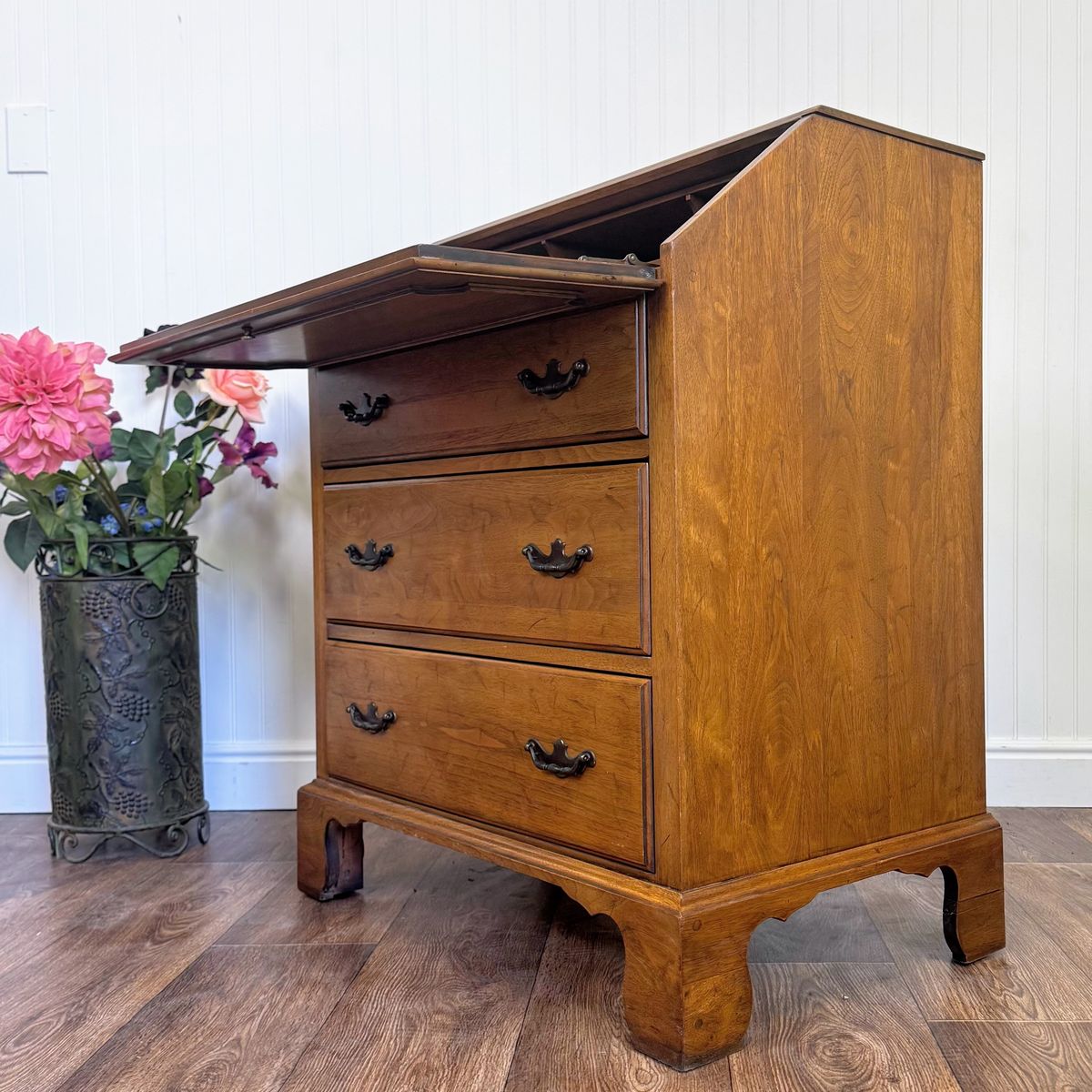 VenmoVintage solid wood slant-front secretary desk from the Davis Cabinet Company of Nashville, Tennessee, featuring a warm finish, classic Queen Anne-style bracket feet, and aged-brass batwing hardware.
