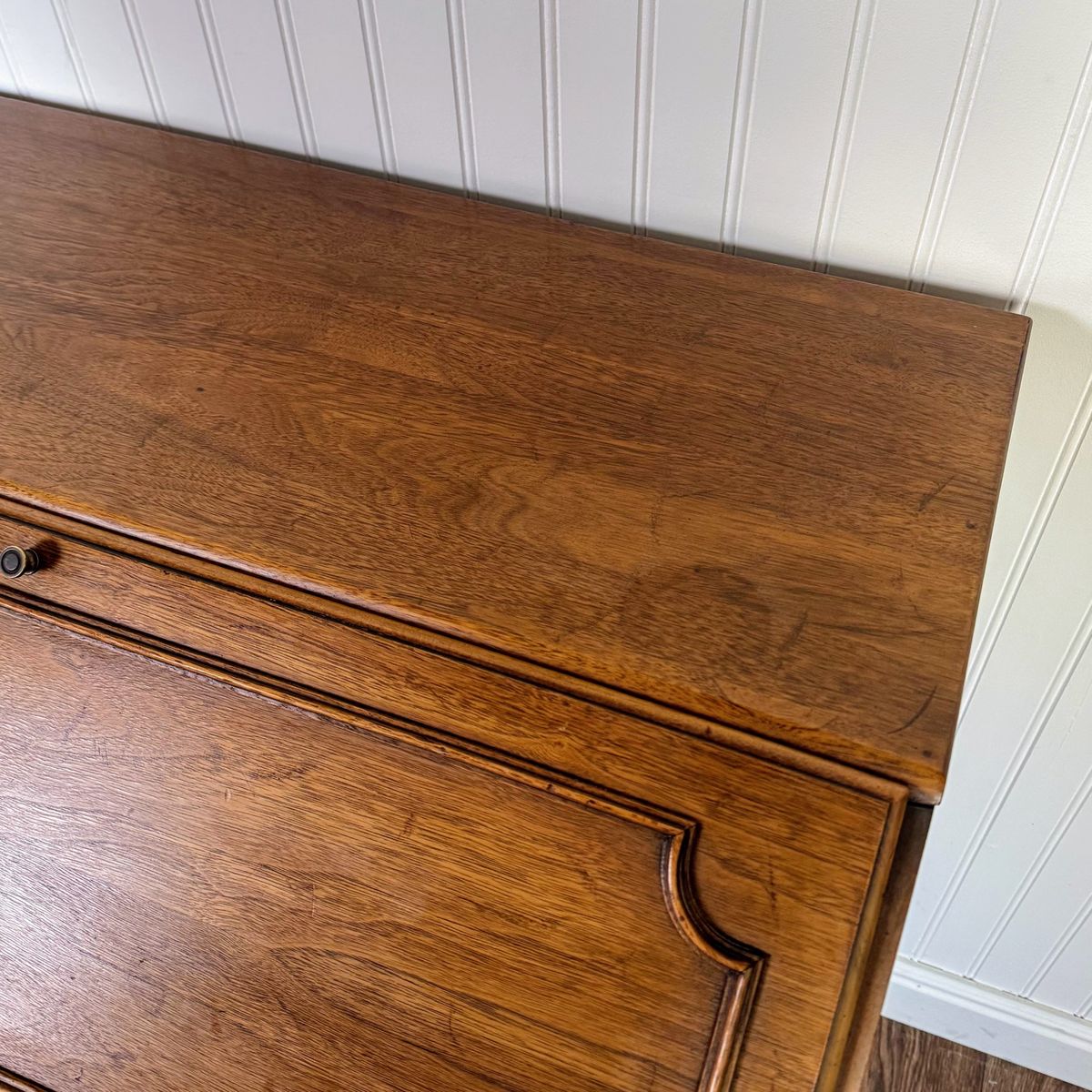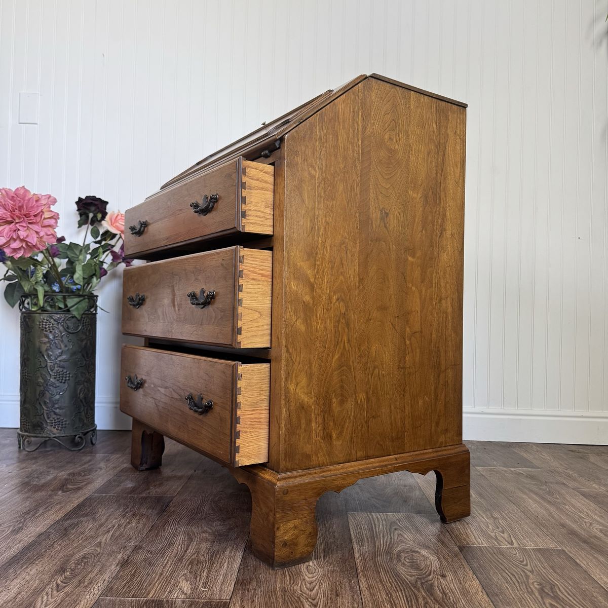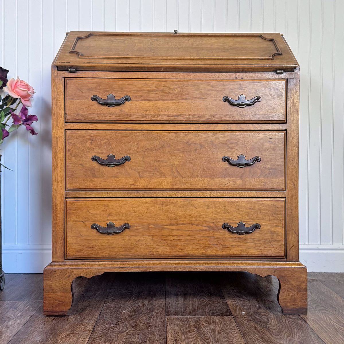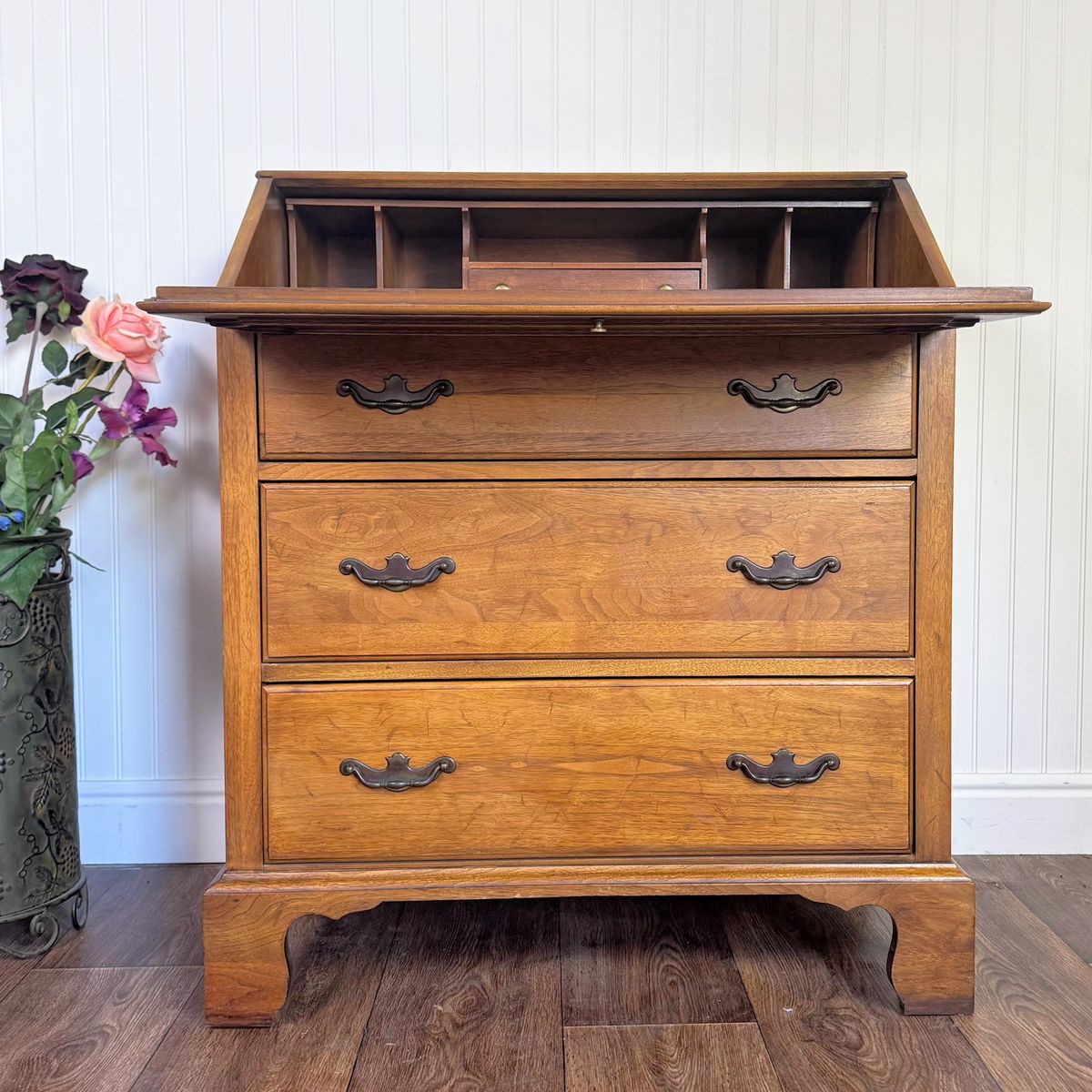 VenmoVintage solid wood slant-front secretary desk from the Davis Cabinet Company of Nashville, Tennessee, featuring a warm finish, classic Queen Anne-style bracket feet, and aged-brass batwing hardware.