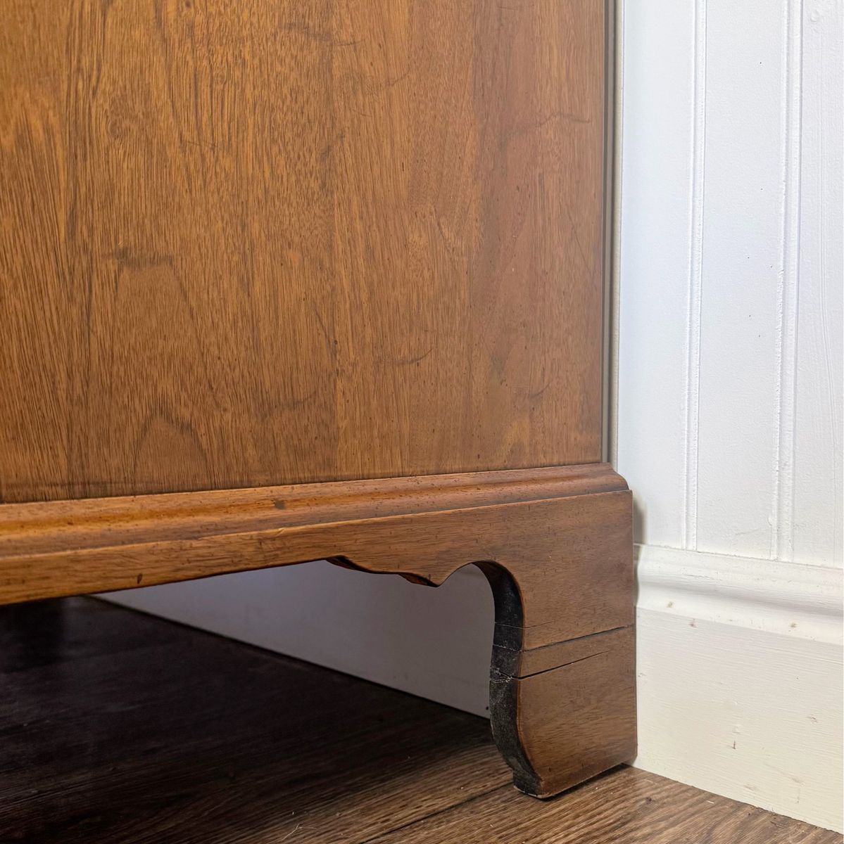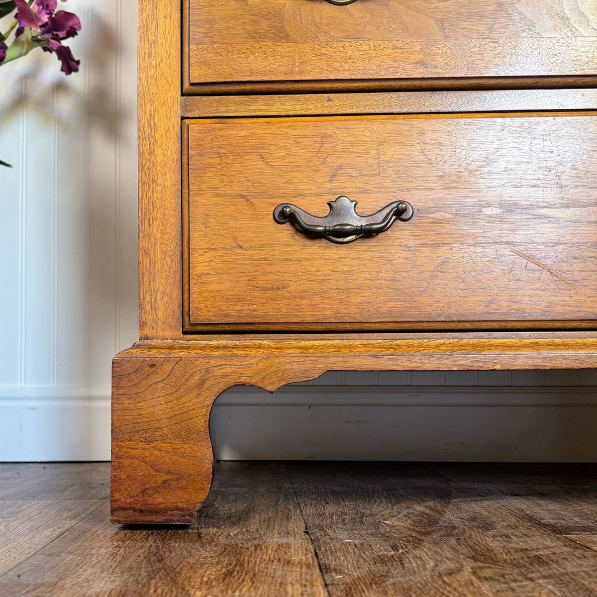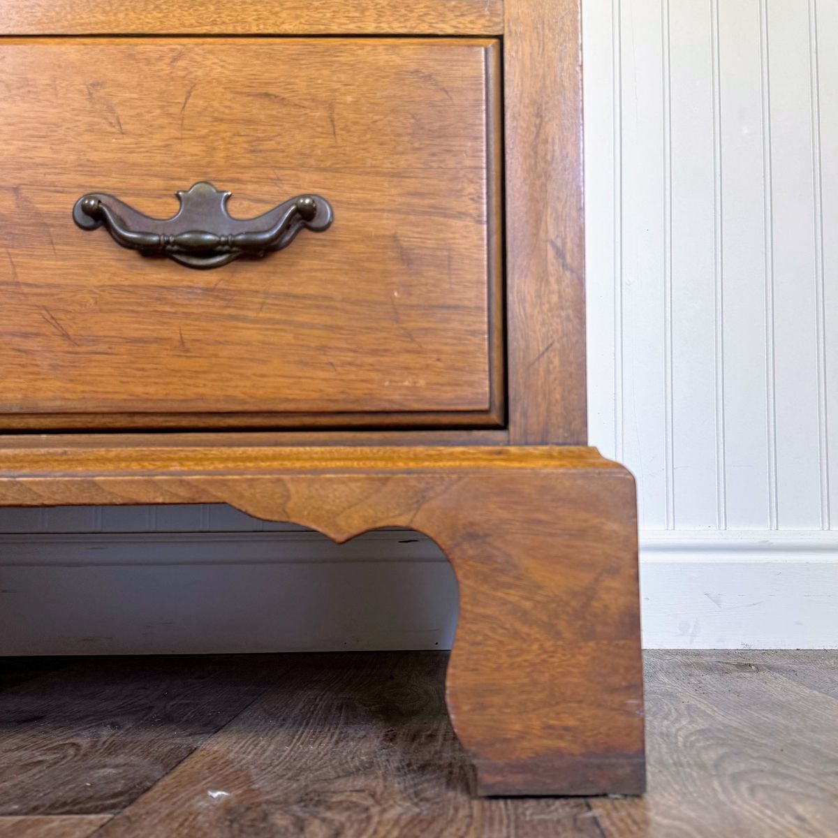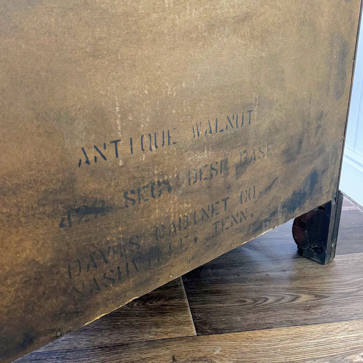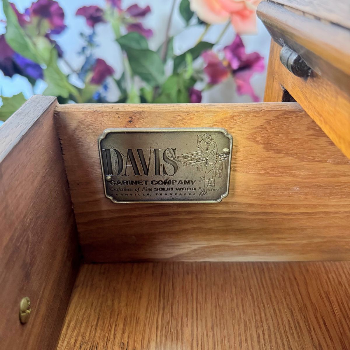 VenmoVintage solid wood slant-front secretary desk from the Davis Cabinet Company of Nashville, Tennessee, featuring a warm finish, classic Queen Anne-style bracket feet, and aged-brass batwing hardware.