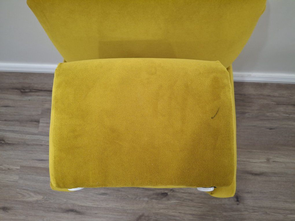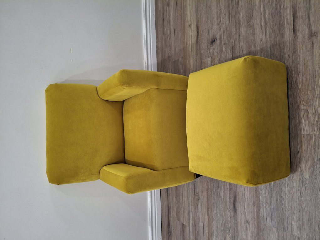 VenmoIt has one mark on the stool (see picture). It is still in great shape! Chair- 19"L x16"W x26"H and Stool- 15"L x11"W x8"H