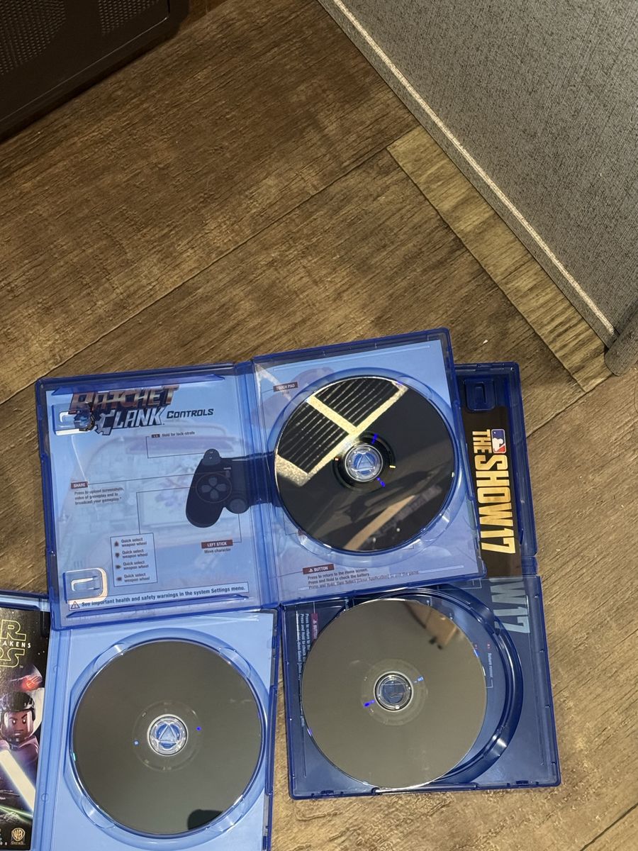All are MINT condition. They work like new. Lego star wars , ratchet and clank , MLB the show.