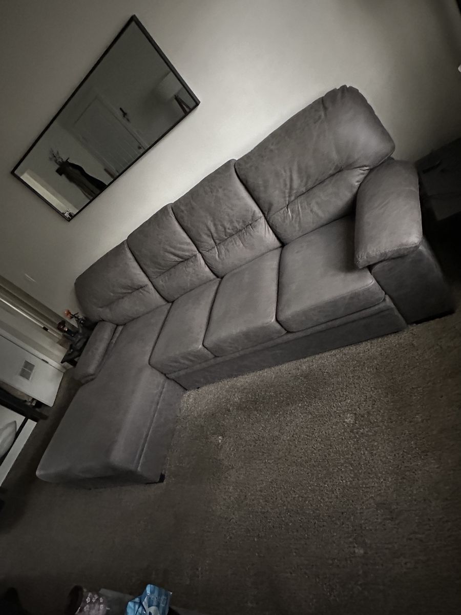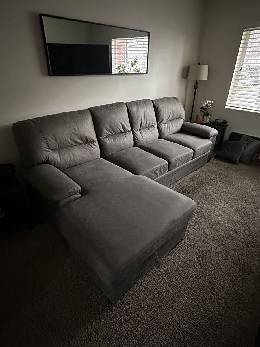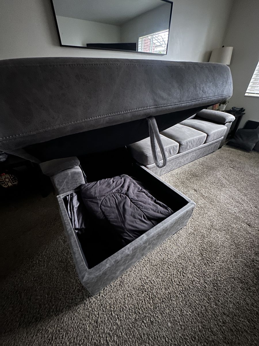 PayPalUsed grey sectional with storage compartment and extension for couch bed. Bed extension needs some repair but still functional. Very comfy couch that has had almost zero wear. Includes removable velcro back cushions.