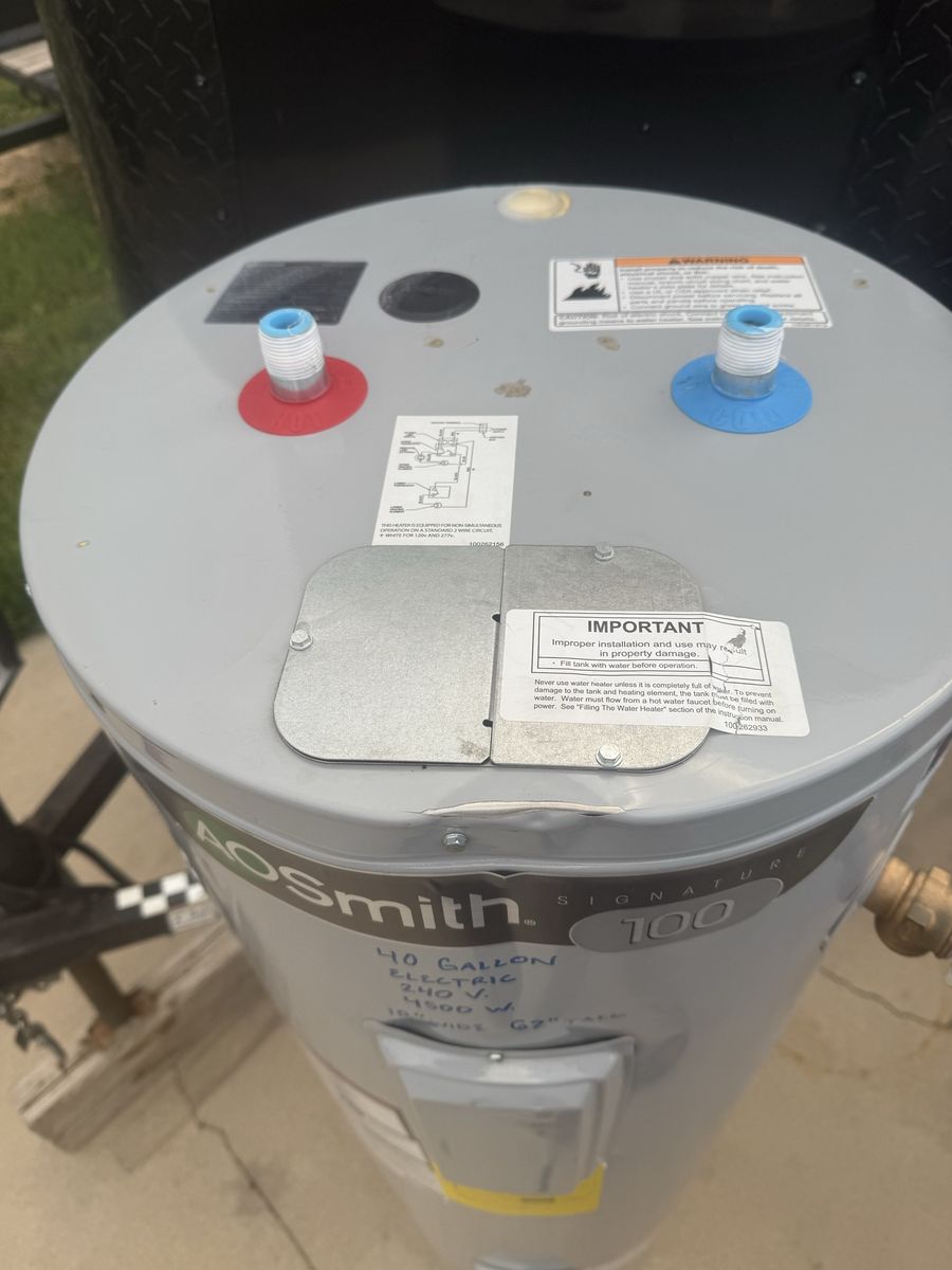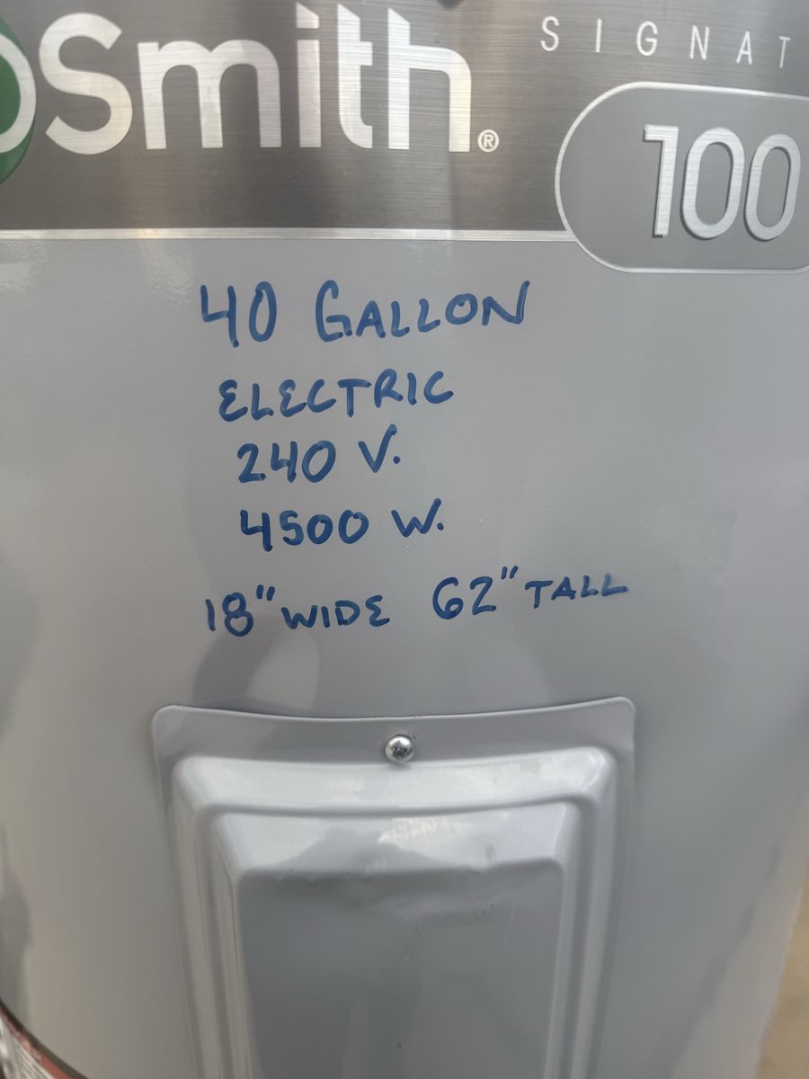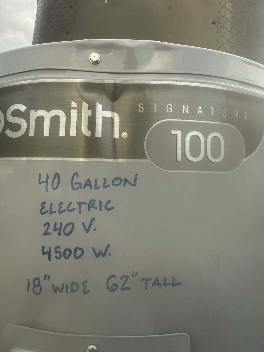40 gallon AO Smith: Sold AS-IS Electric Water Heater 240V 4500 Watts Manufacture Date: 08-22-2025 Height: 62” Diameter: 18”